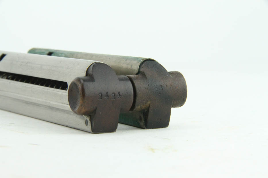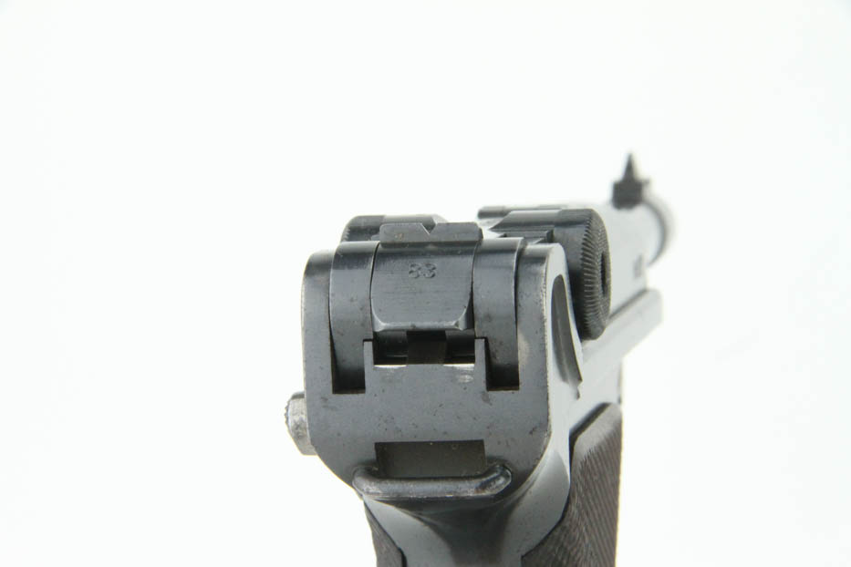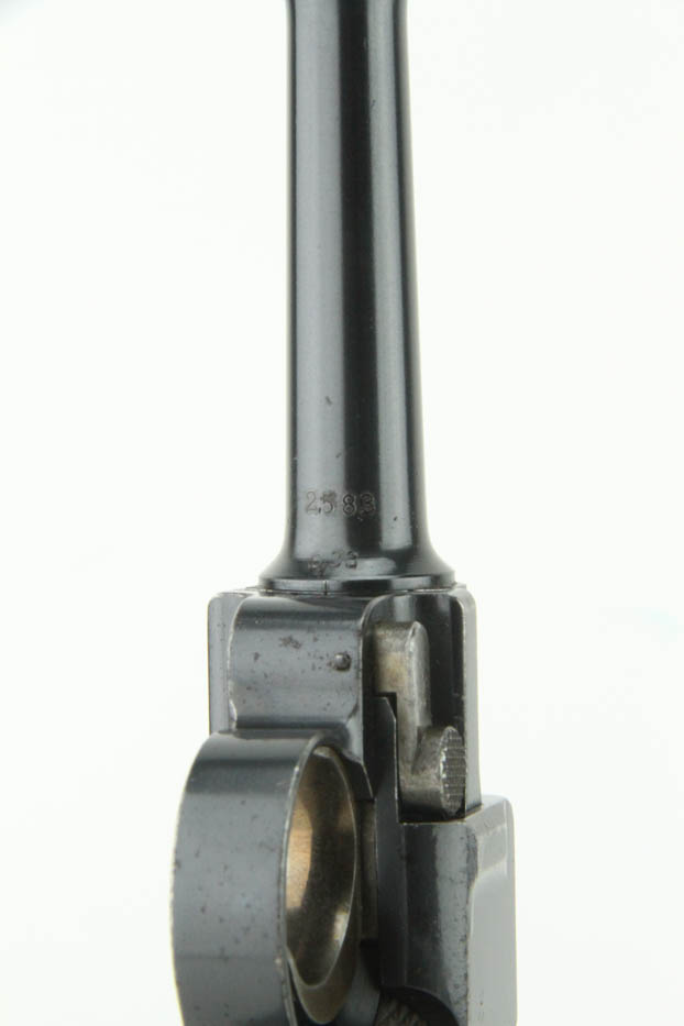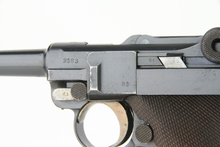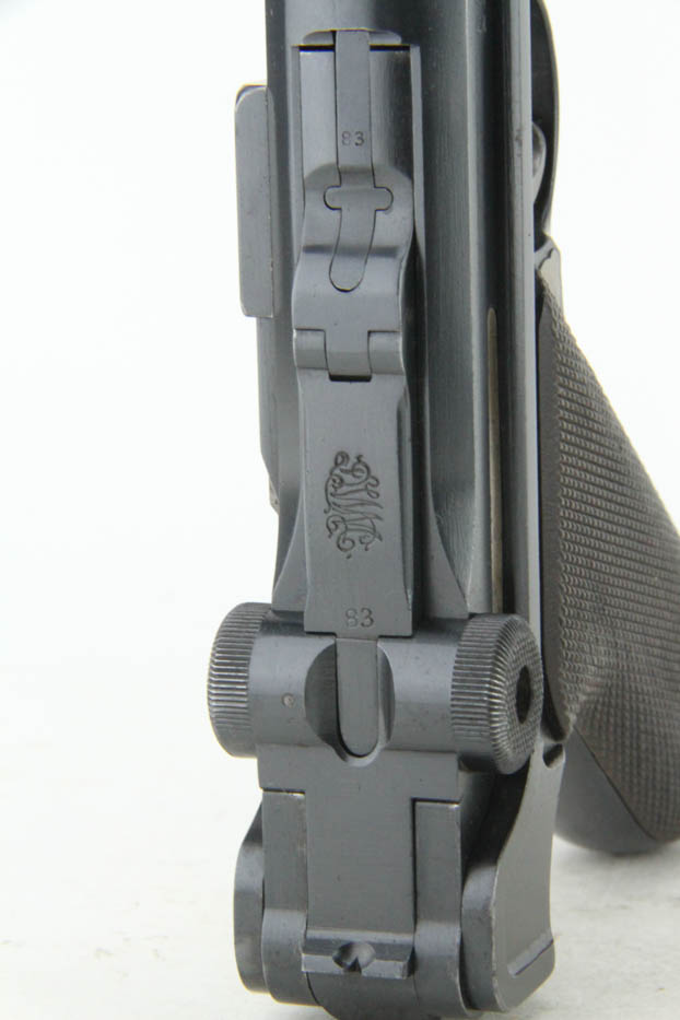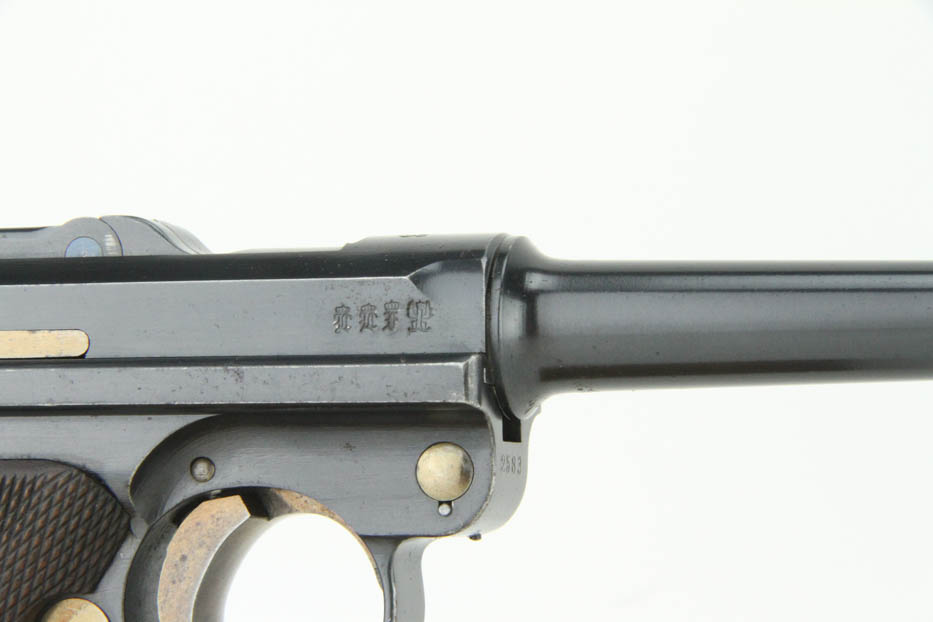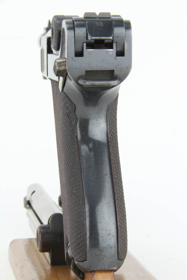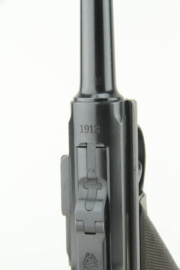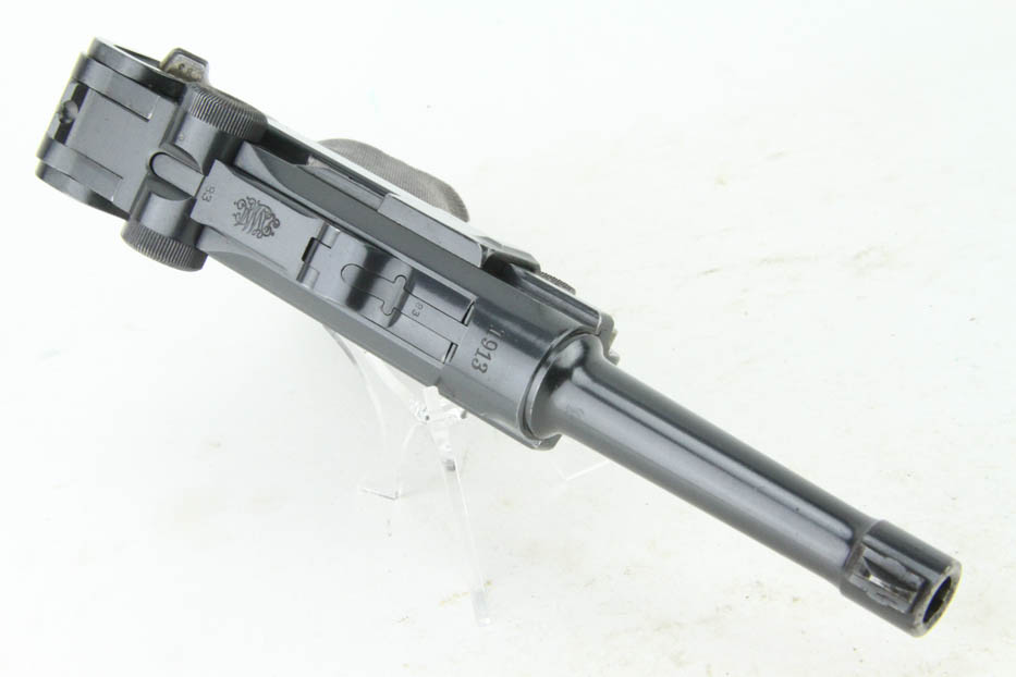 7/25/24 – This is a minty DWM Luger issued to the Imperial German military in 1913. It is all matching and has the proper Imperial military proofs. This one has the proper early features – no stock lug on the rear strap and no hold-open. It comes as a rig with an excellent 1914-dated holster, one mismatched magazine, and one un-numbered magazine (crack in the wood base). The gun itself has retained almost all of its finish with just hints of high edge and muzzle wear, very light freckling on the grip straps, and one light surface scratch on the side plate. Fitted with minty matching-numbered wood grips. The bore has good rifling, but there is pin-pricking throughout.