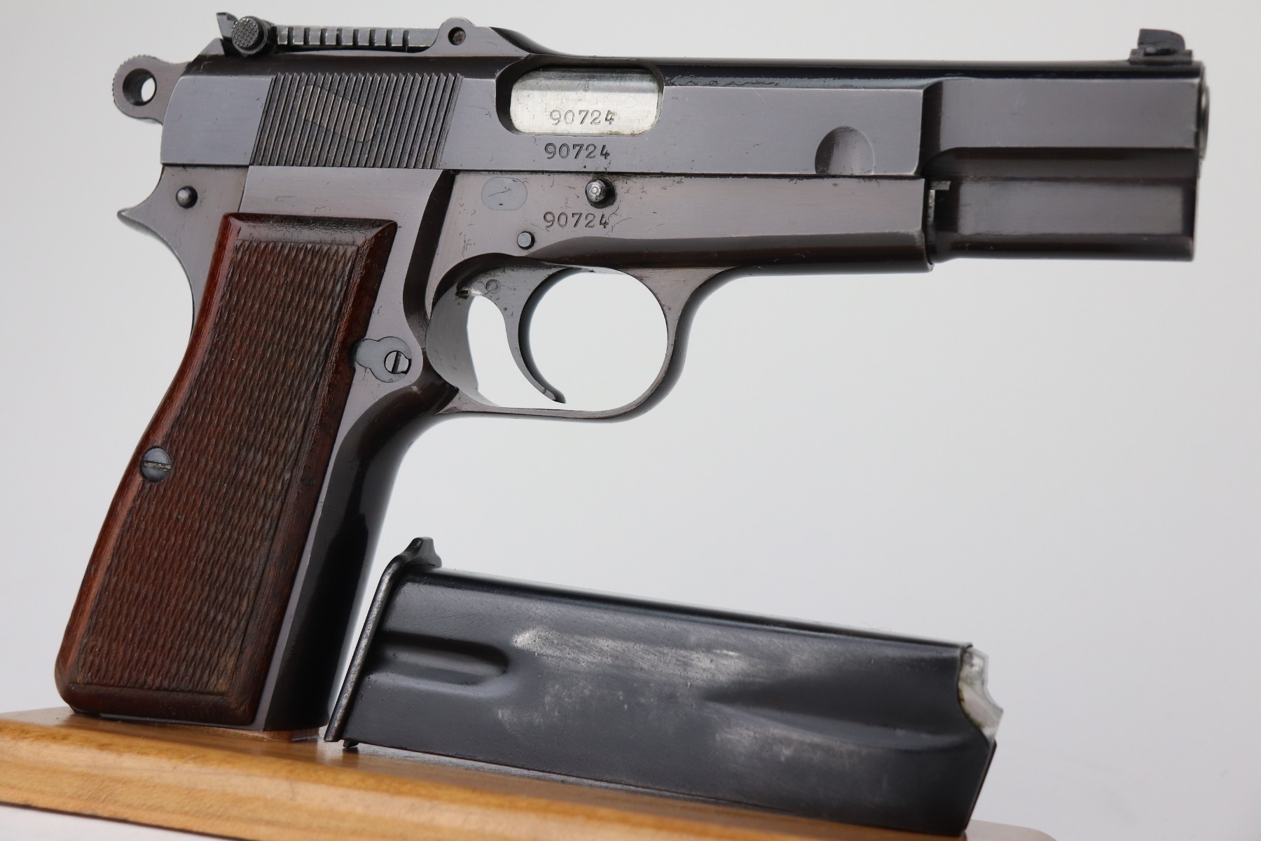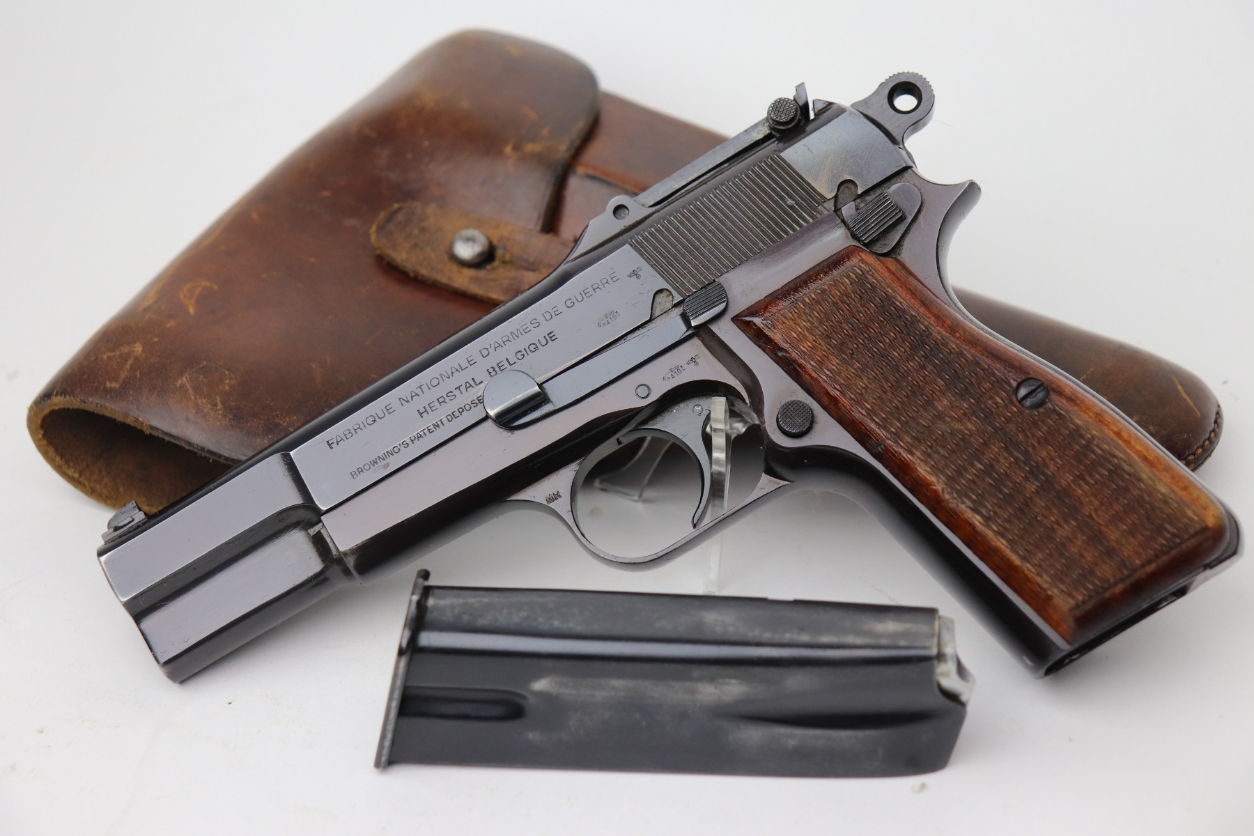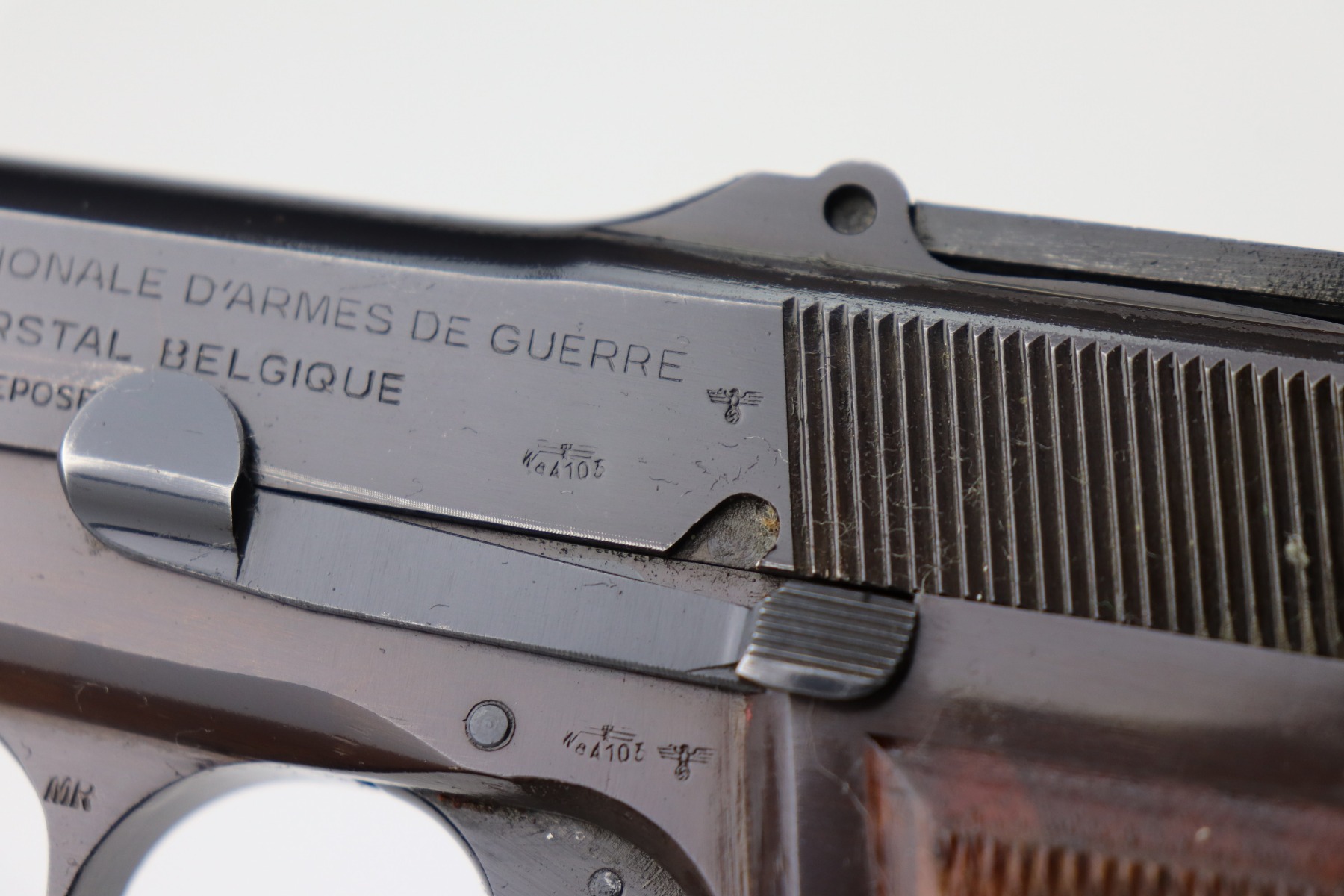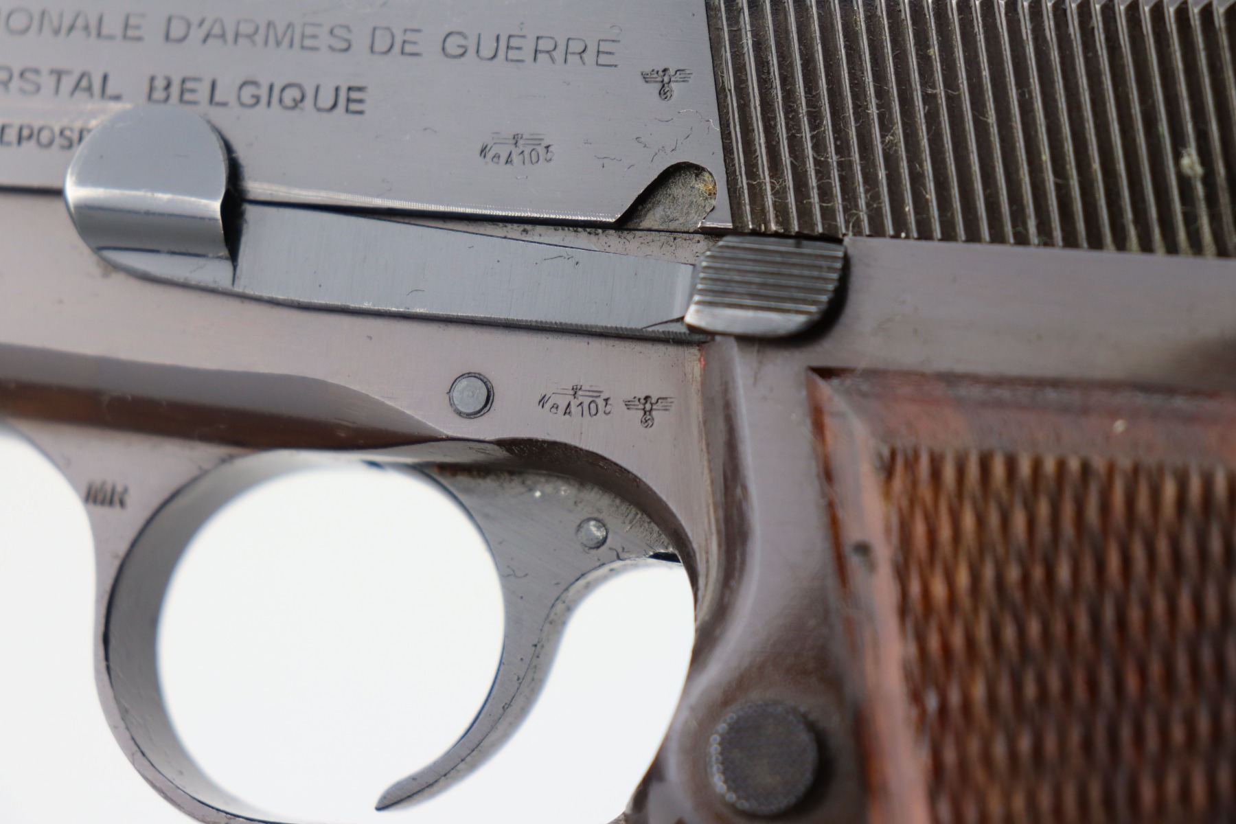 3/17/21 – This is a minty example of an FN Browning High Power rig issued to the Nazi military during WW2. This one has early features such as the adjustable rear sight, high polish finish, and early “Waffen 103” military proofs. All matching. The rig comes with a nice 1942-dated holster and a rare “Waffen 103” proofed magazine. The gun is minty, retaining more than 98% of its plumb-colored finish. There is just a hint of wear on some of the high edges and some light scratching on the back left side of the slide. Very minor freckling on the straps. Comes with excellent wood grips. Excellent bore – shiny with strong rifling.
