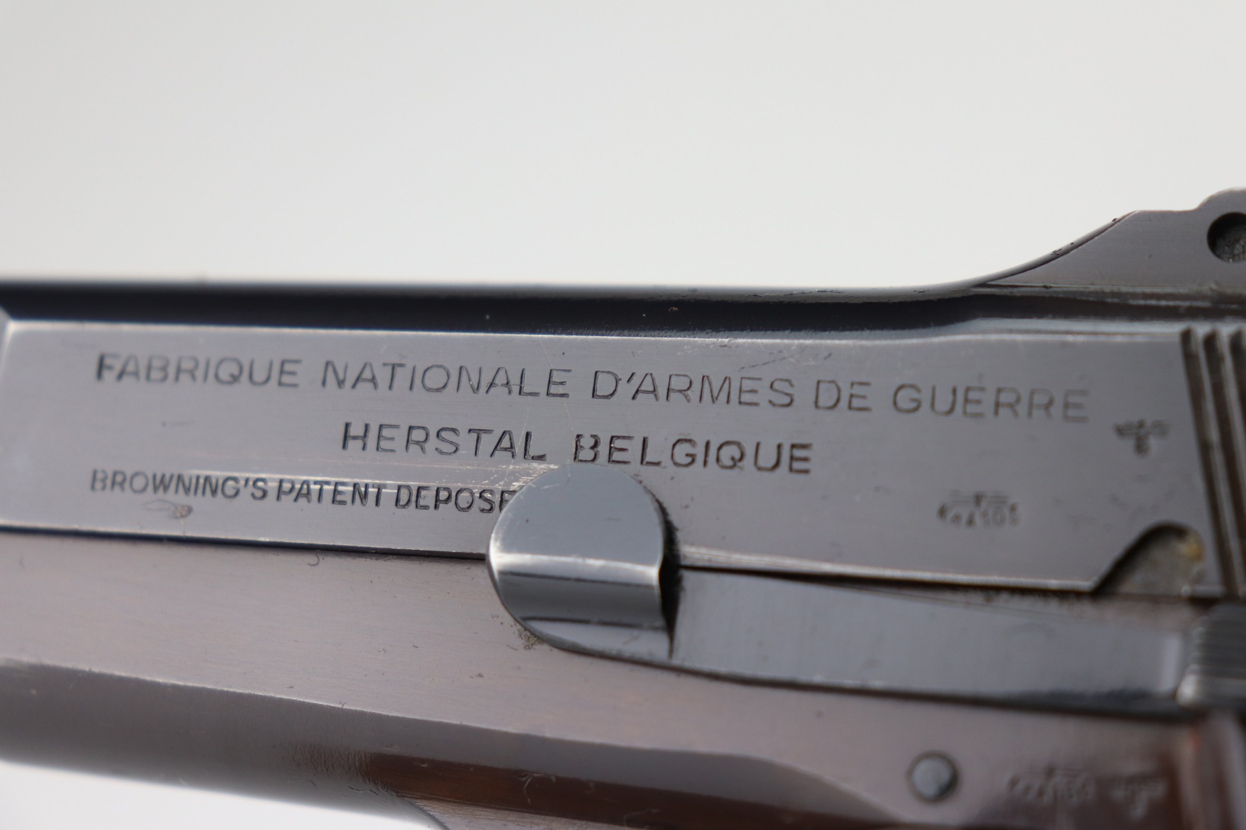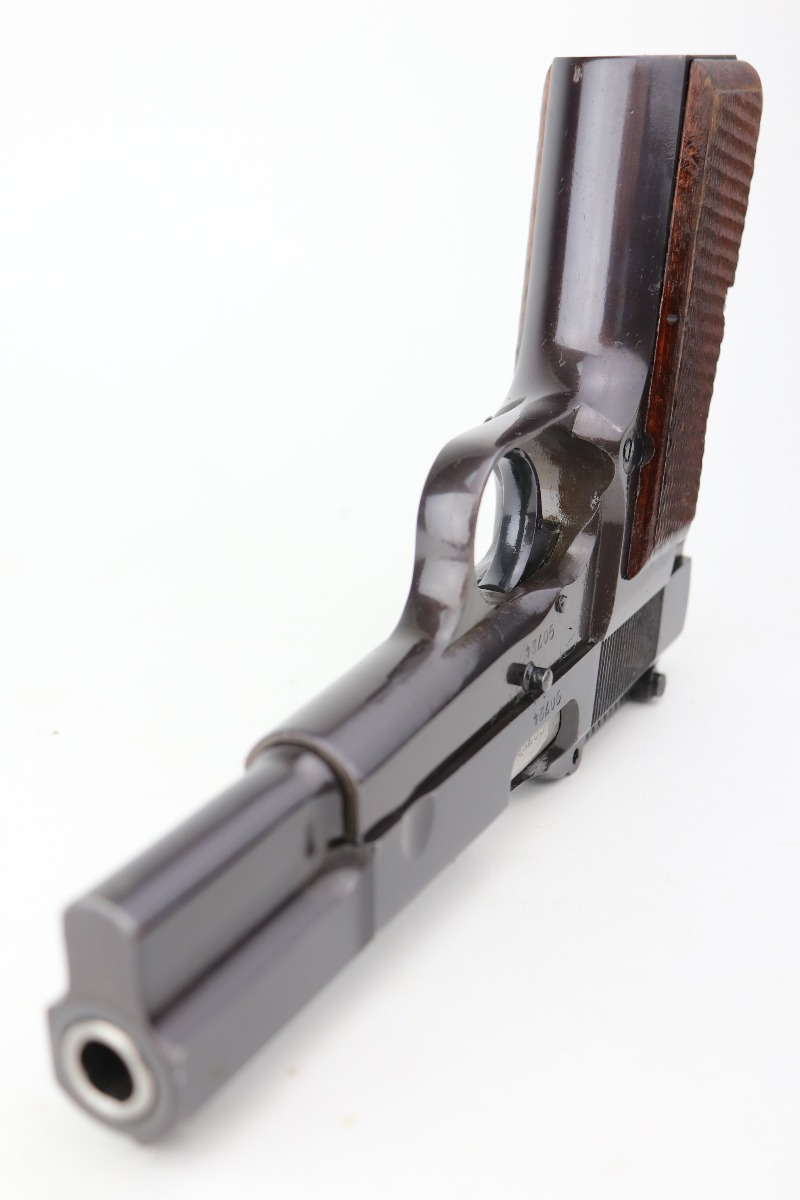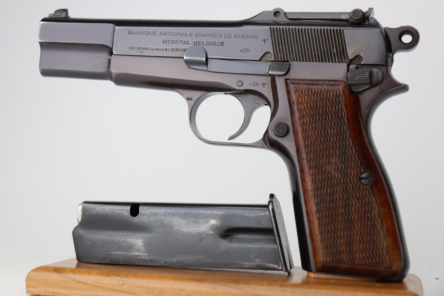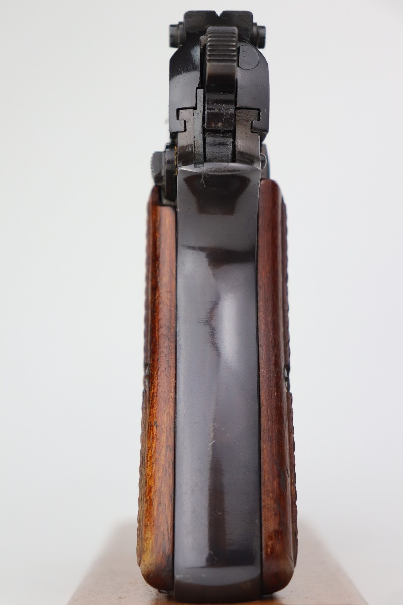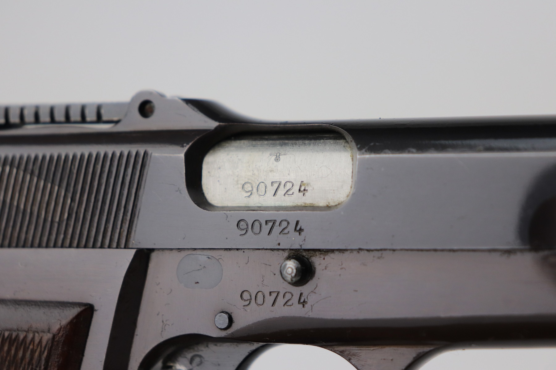 3/17/21 – This is a minty example of an FN Browning High Power rig issued to the Nazi military during WW2. This one has early features such as the adjustable rear sight, high polish finish, and early “Waffen 103” military proofs. All matching. The rig comes with a nice 1942-dated holster and a rare “Waffen 103” proofed magazine. The gun is minty, retaining more than 98% of its plumb-colored finish. There is just a hint of wear on some of the high edges and some light scratching on the back left side of the slide. Very minor freckling on the straps. Comes with excellent wood grips. Excellent bore – shiny with strong rifling.