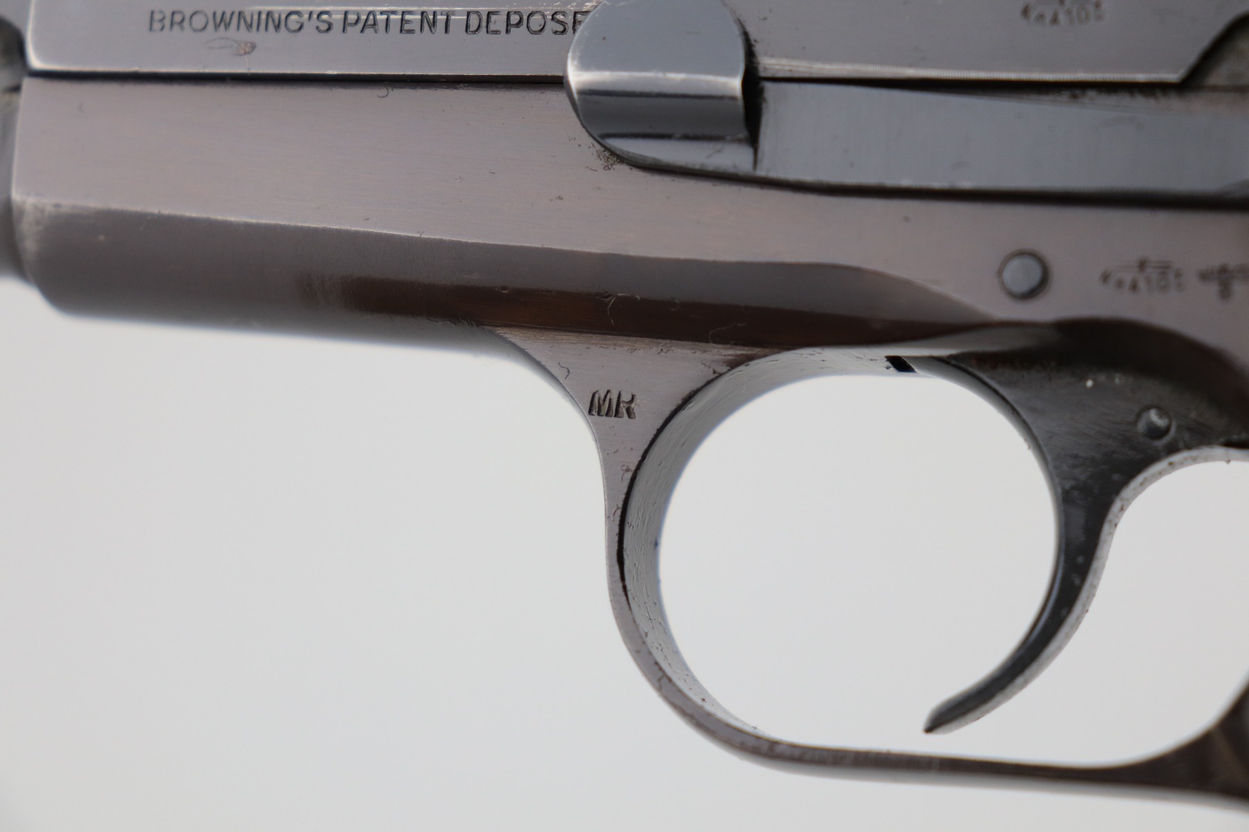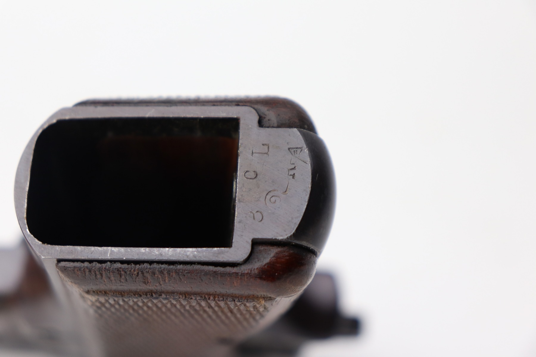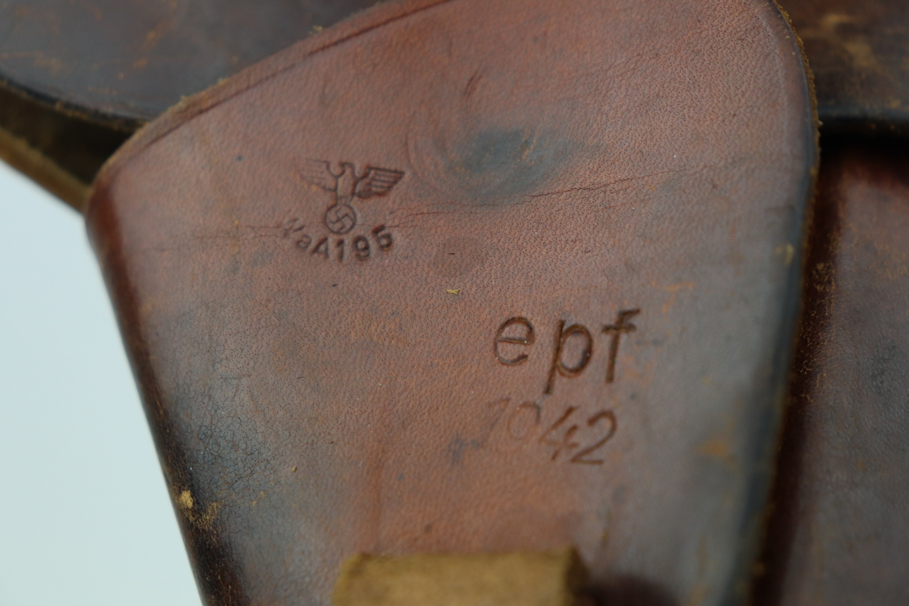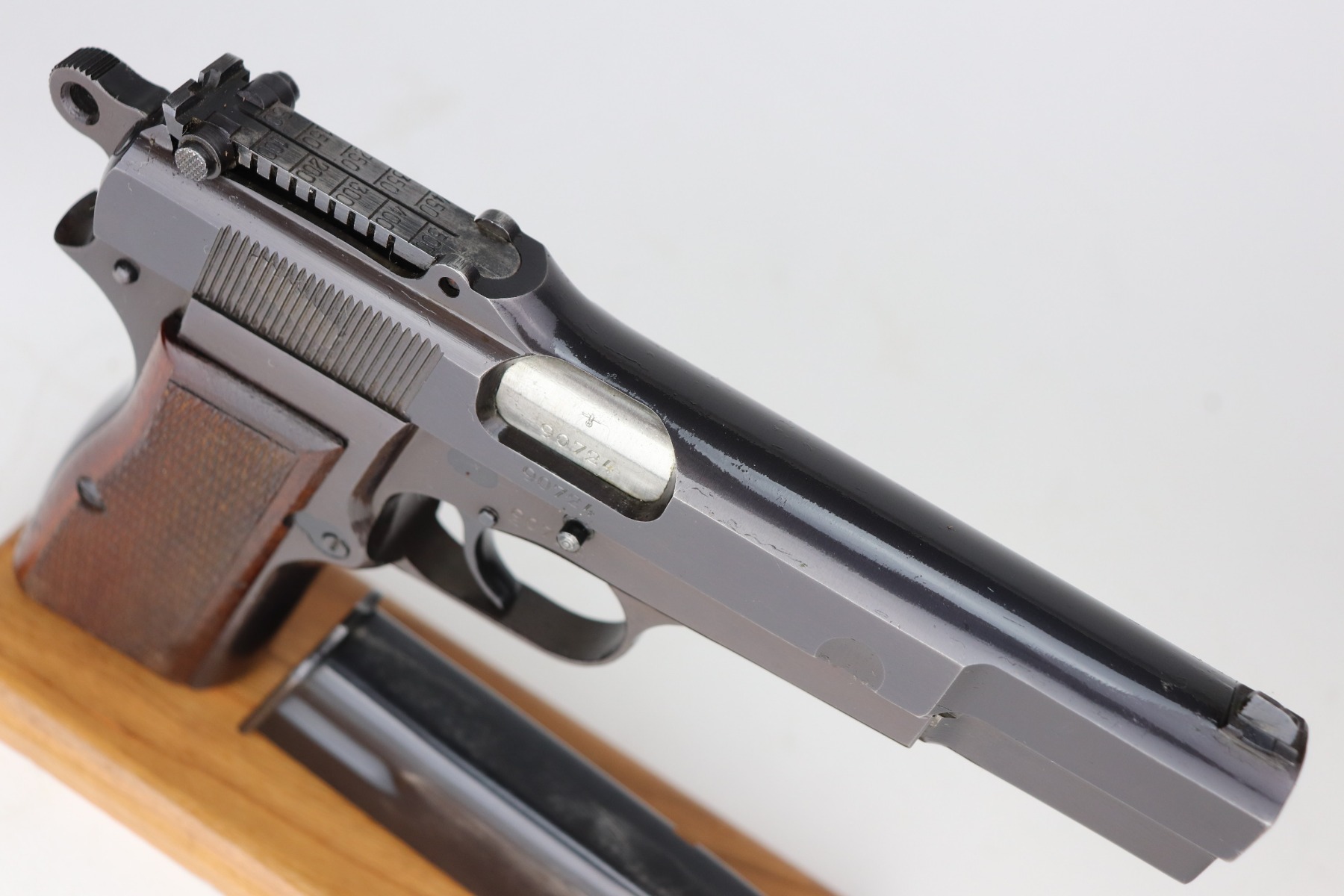 3/17/21 – This is a minty example of an FN Browning High Power rig issued to the Nazi military during WW2. This one has early features such as the adjustable rear sight, high polish finish, and early “Waffen 103” military proofs. All matching. The rig comes with a nice 1942-dated holster and a rare “Waffen 103” proofed magazine. The gun is minty, retaining more than 98% of its plumb-colored finish. There is just a hint of wear on some of the high edges and some light scratching on the back left side of the slide. Very minor freckling on the straps. Comes with excellent wood grips. Excellent bore – shiny with strong rifling.