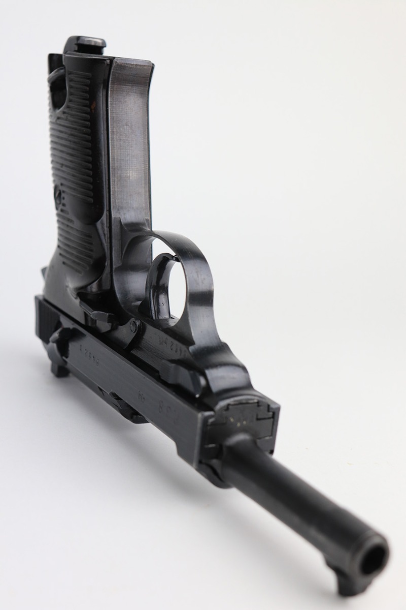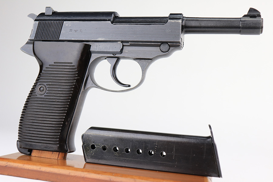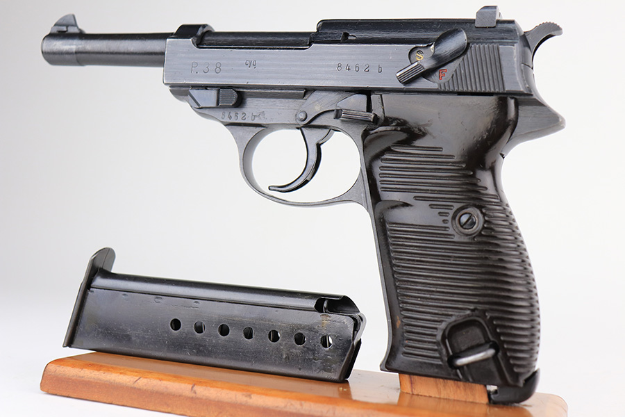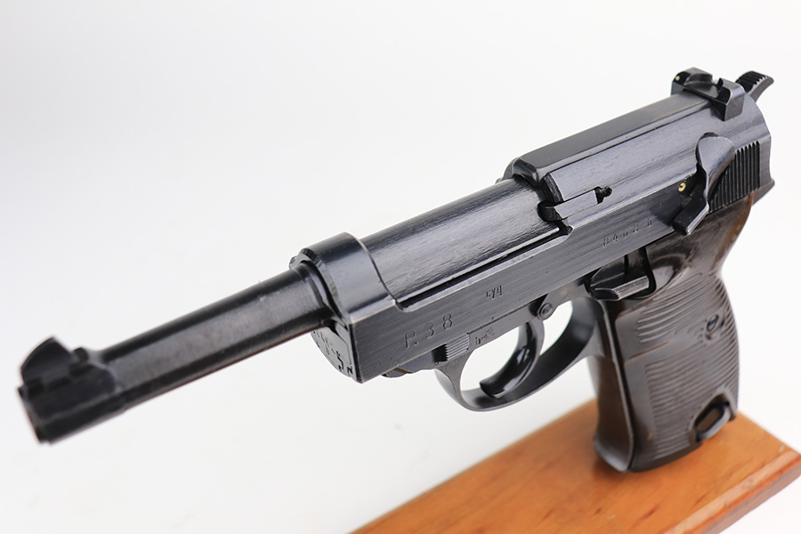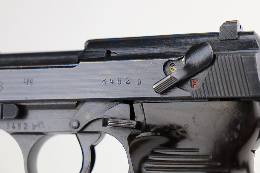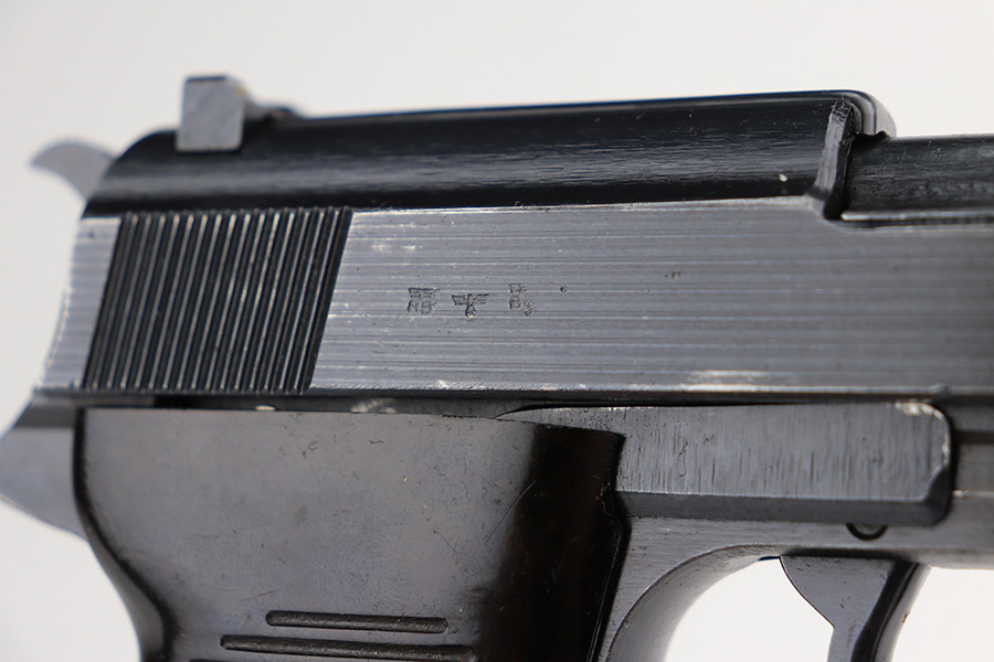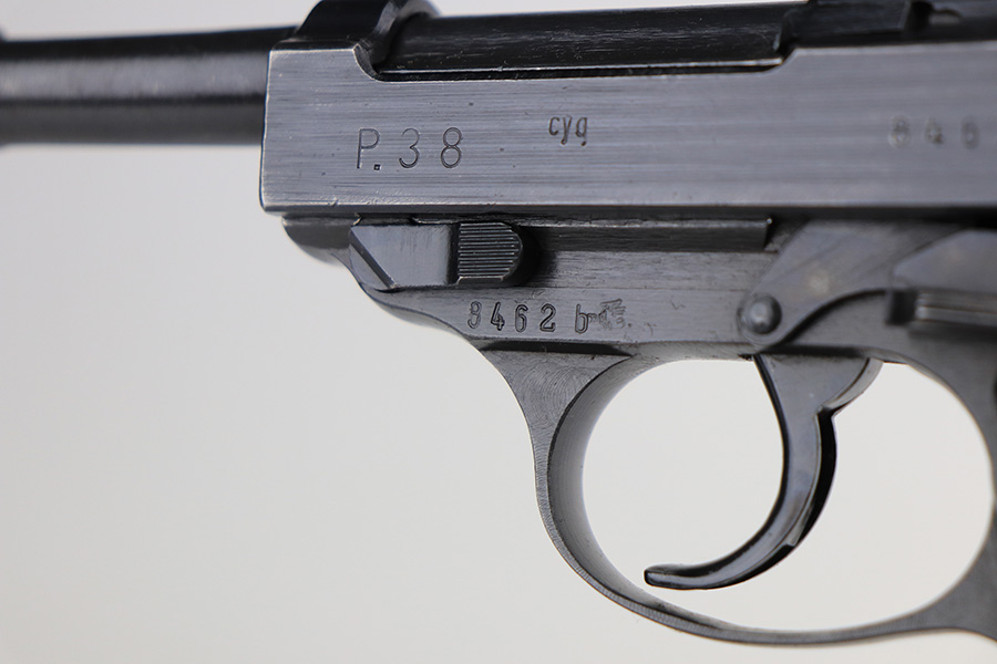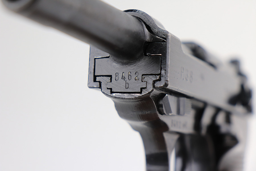 2/23/22 – This is a beautiful example of an early Spreewerk P.38 issued to the Nazi military in April of 1943. The gun is all matching and has the proper “Eagle 88” military acceptance proofs throughout. It has retained about 98% of its bluing. There is just a hint of thinning and tiny freckling on the front strap and very minor wear around the high edges of the right side of the slide. It has blued internals so likely an old refinish, but isn’t a Russian capture. Comes with excellent period-correct grips and an un-marked magazine. The bore is near-mint. De-cocker is functional.