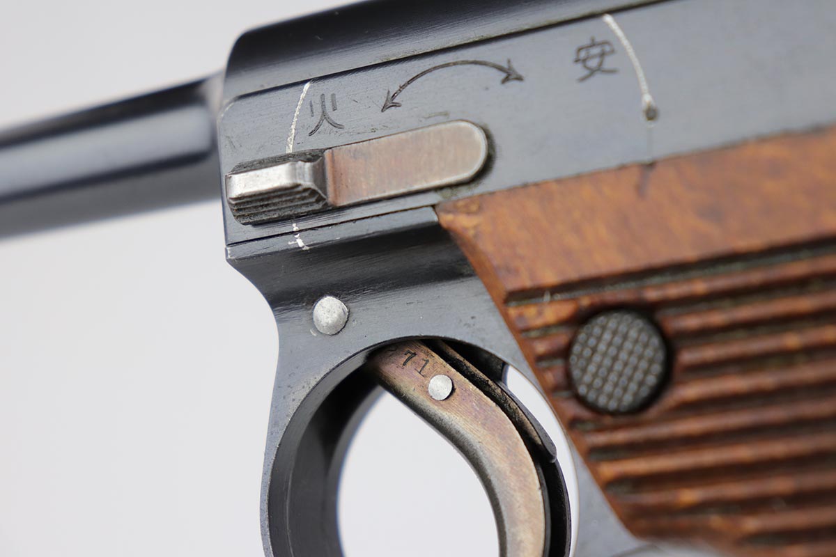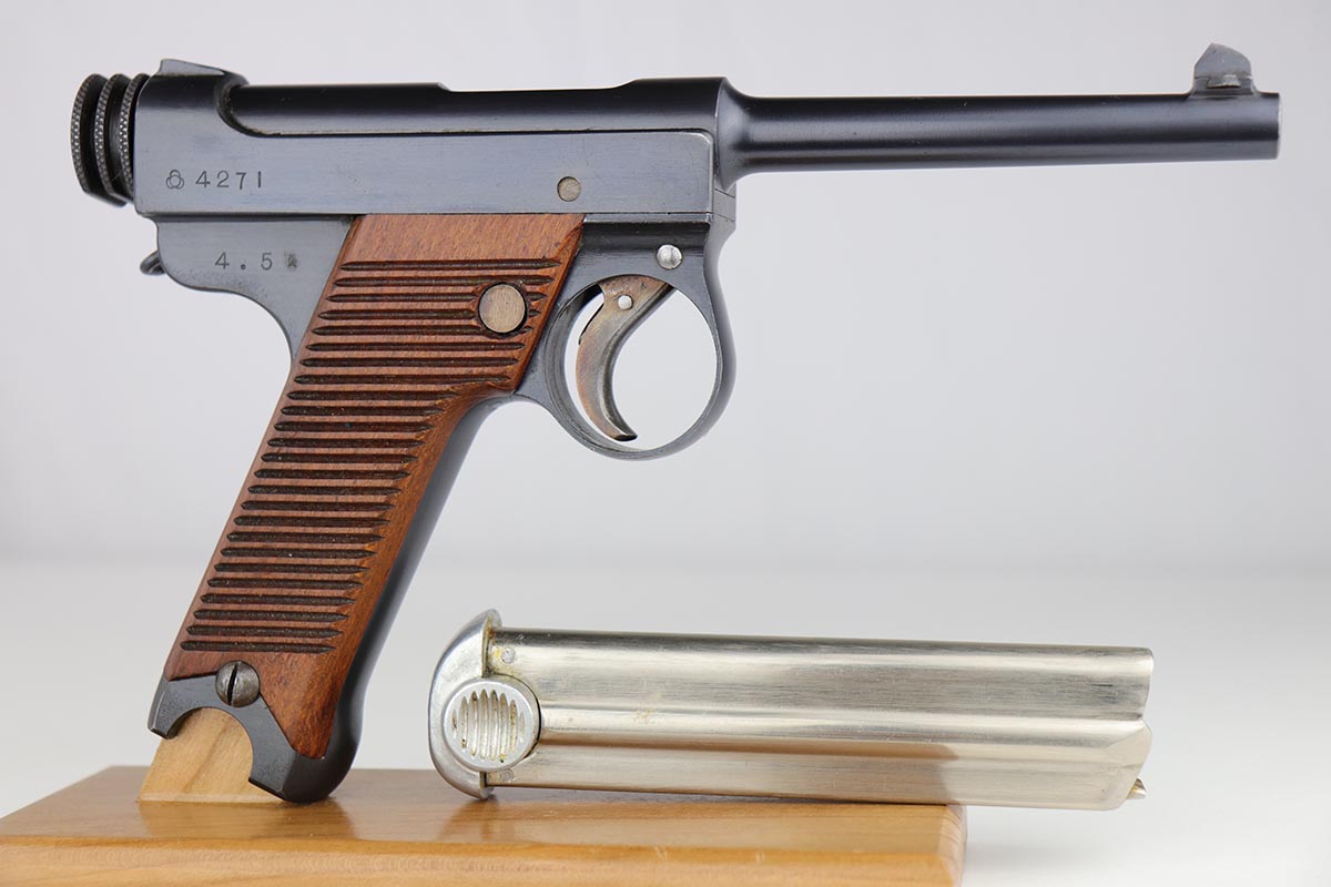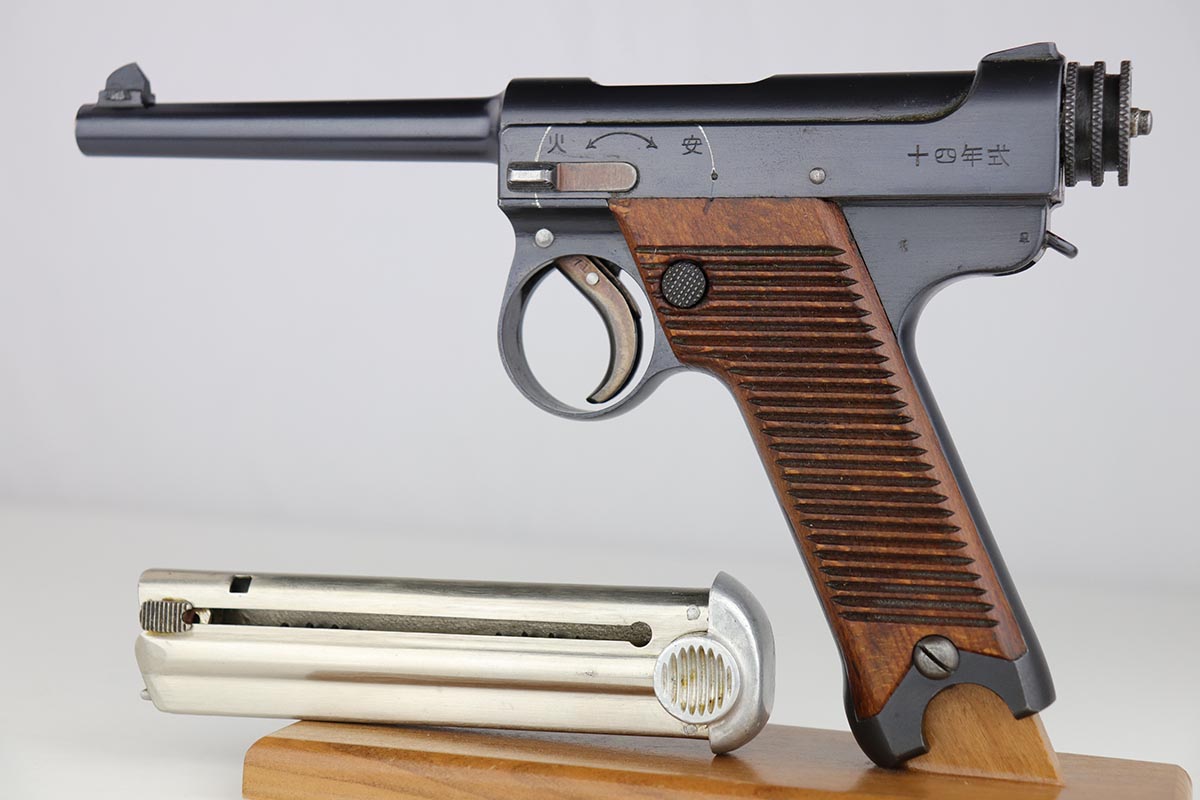7/11/19 – This is a beautiful example of a 2nd year production, small trigger guard Type 14 Nambu, made at Tokyo arsenal, and dated 4.5 (May of 1929). Tokyo made T14 pistols have long been considered by the collectors to be the best finished Nambus, compared to Kokobunji and Nagoya factories production. This gun retains near 99% of its original blue with just a hint of wear on the front corners of the slide and minimal spotting on the grips straps. It is all matching, including grips and the magazine. Excellent bore and grips.