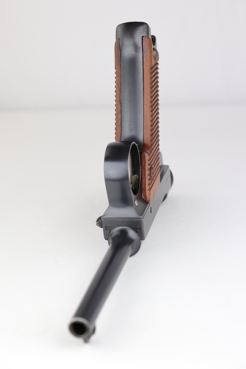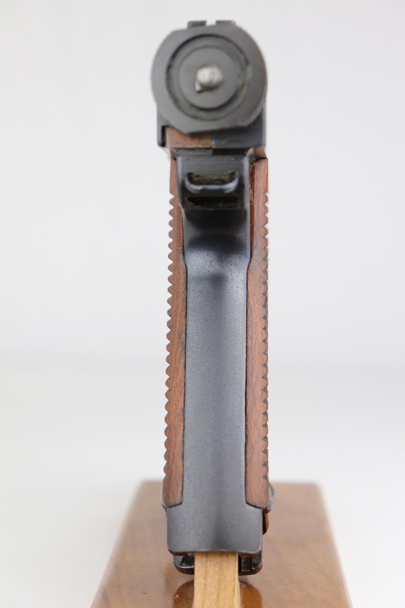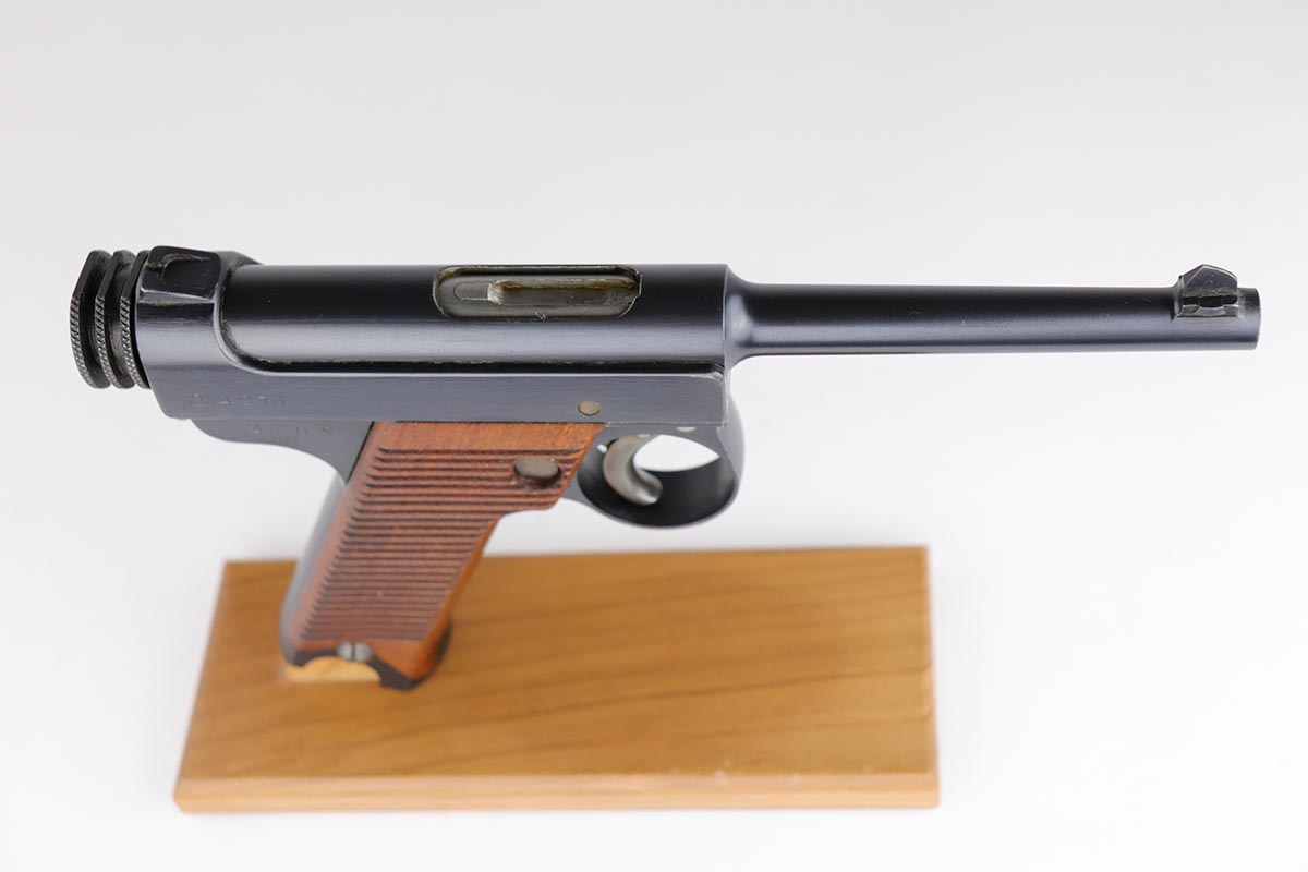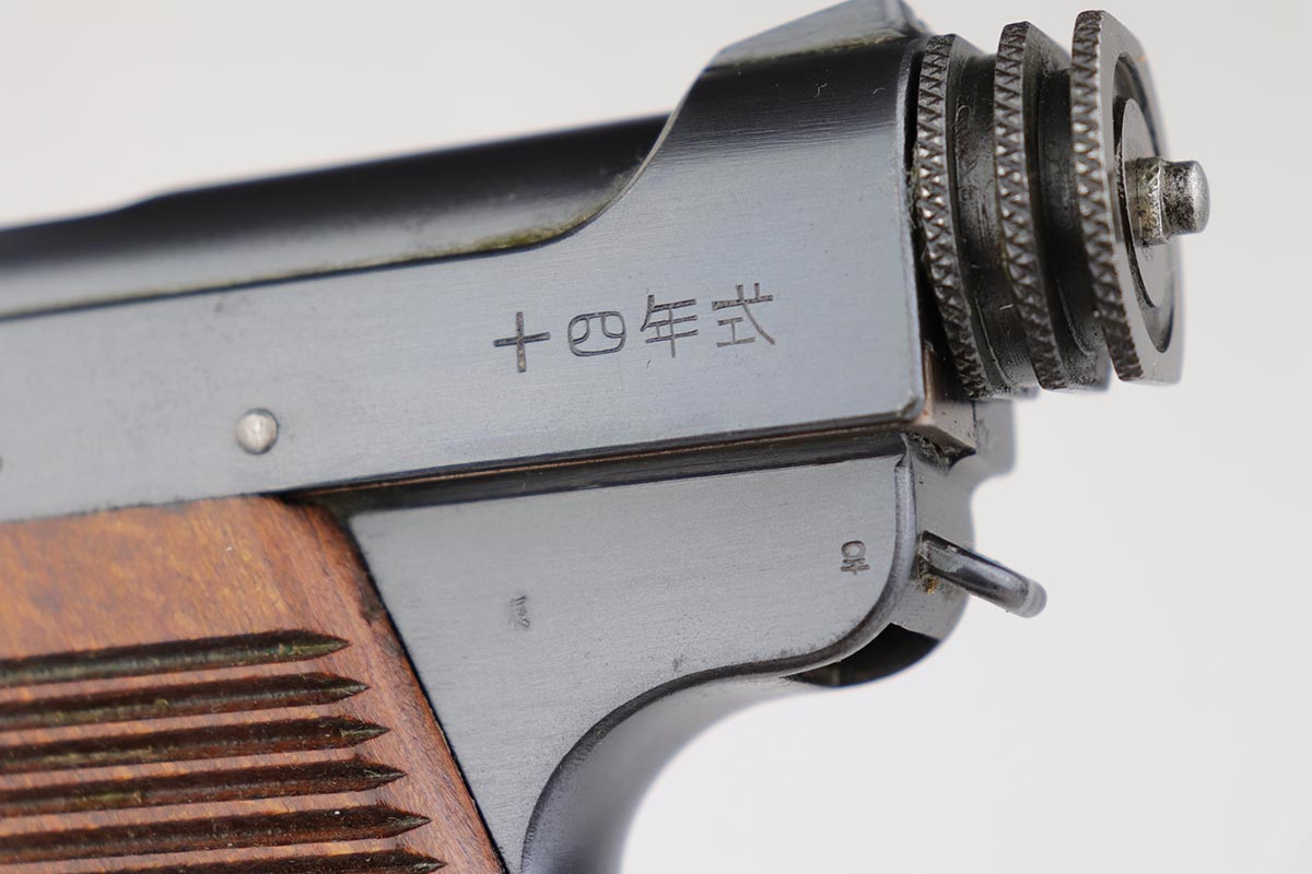 7/11/19 – This is a beautiful example of a 2nd year production, small trigger guard Type 14 Nambu, made at Tokyo arsenal, and dated 4.5 (May of 1929). Tokyo made T14 pistols have long been considered by the collectors to be the best finished Nambus, compared to Kokobunji and Nagoya factories production. This gun retains near 99% of its original blue with just a hint of wear on the front corners of the slide and minimal spotting on the grips straps. It is all matching, including grips and the magazine. Excellent bore and grips.