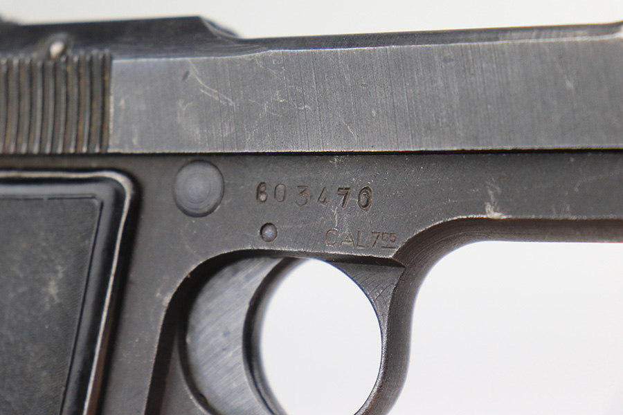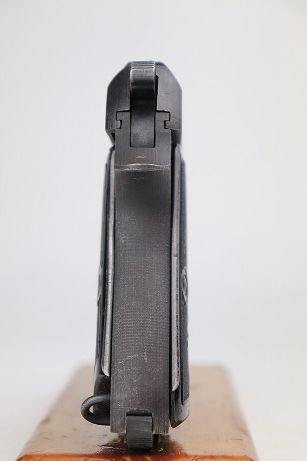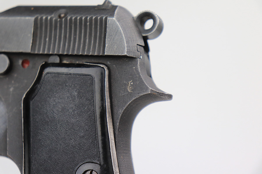 12/8/21 – This is a near-mint example of a Beretta Model 1935 issued to the Nazi military at the end of WW2, in 1945. It is all matching and has the proper “4UT” Nazi military proof on the left side of the tang (faintly struck). The gun has the proper end-of-war features such as an all-phosphate finish and no slide legend. It has retained about 98% of its original phosphate finish. There are just hints of wear on some of the high edges and some very light surface scuffs here and there. There is what appears to be a bur in the metal (most likely machining mark) on the left side of the slide near the muzzle. Comes with excellent bakelite grips and a period-correct blued magazine. The bore is mint.
