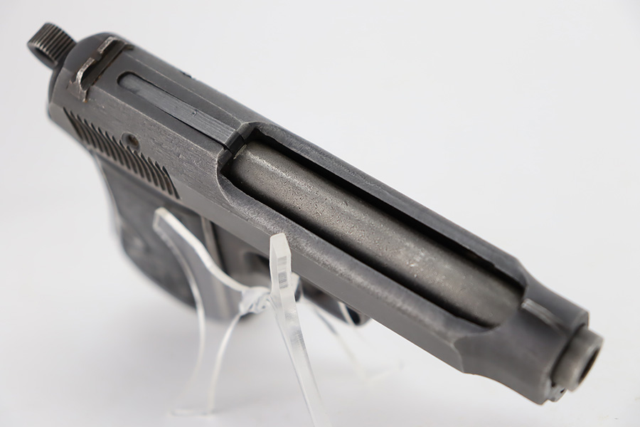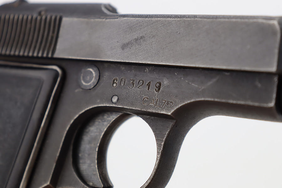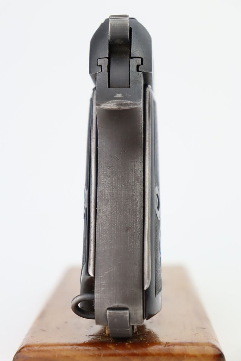 11/1/23 – This is a minty example of a Beretta Model 1935, manufactured at the end of WW2. It is matching and has the proper late-war characteristics, such as no slide legend and a “CAL 7.65” marking on the right side of the frame. There is a “4UT” proof on the tang, indicating it was issued to the Nazi military. It has retained nearly all of its original late-war finish with just hints of wear on the high edges and hints of thinning on the grip straps. Excellent black bakelite grips and comes with a period-correct flat-bottom magazine. Excellent, shiny bore.