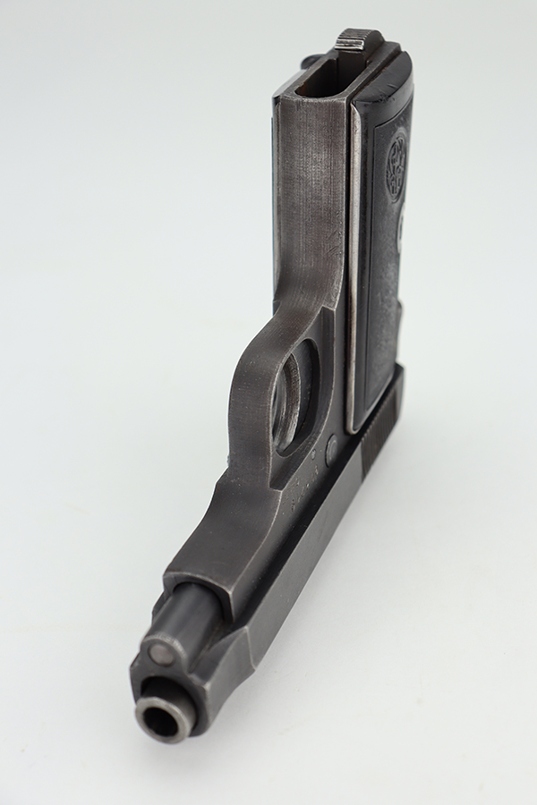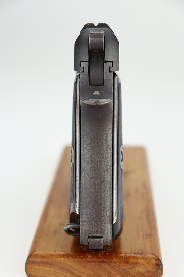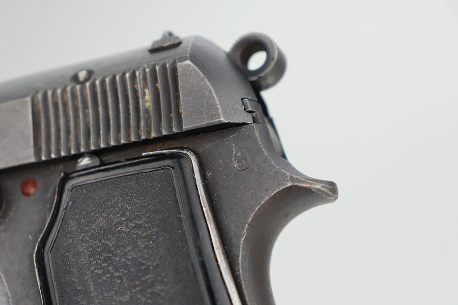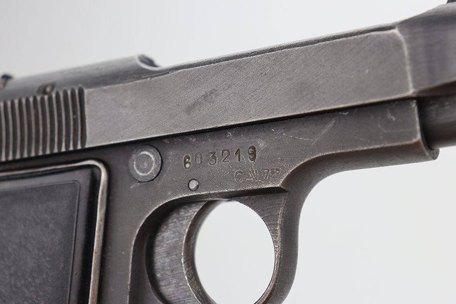 5/30/24 – This is a minty example of a Beretta Model 1935, manufactured at the end of WW2. It is matching and has the proper late-war characteristics, such as no slide legend and a “CAL 7.65” marking on the right side of the frame. There is a “4UT” proof on the tang, indicating it was issued to the Nazi military. It has retained nearly all of its original late-war finish with just hints of wear on the high edges and hints of thinning on the grip straps. Excellent black bakelite grips and comes with a period-correct flat-bottom magazine. Excellent, shiny bore.