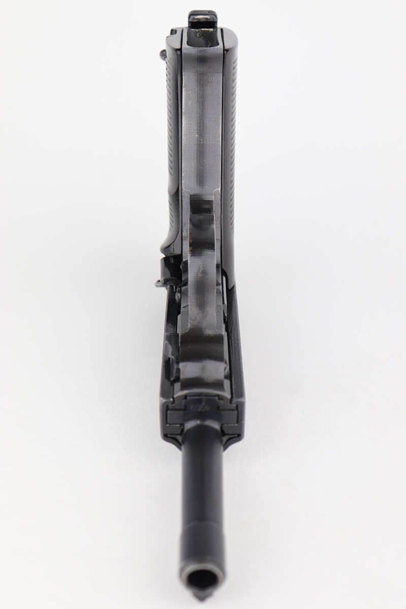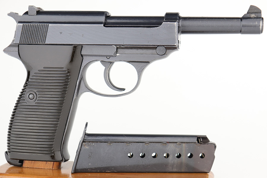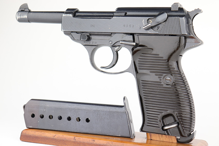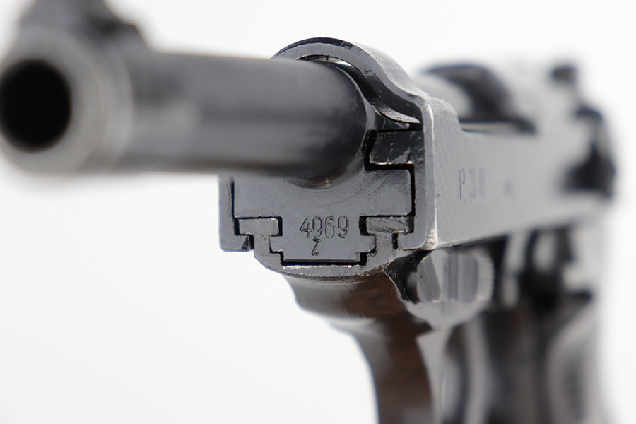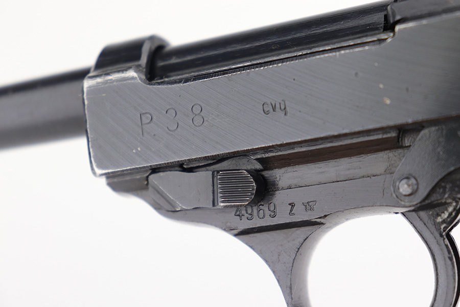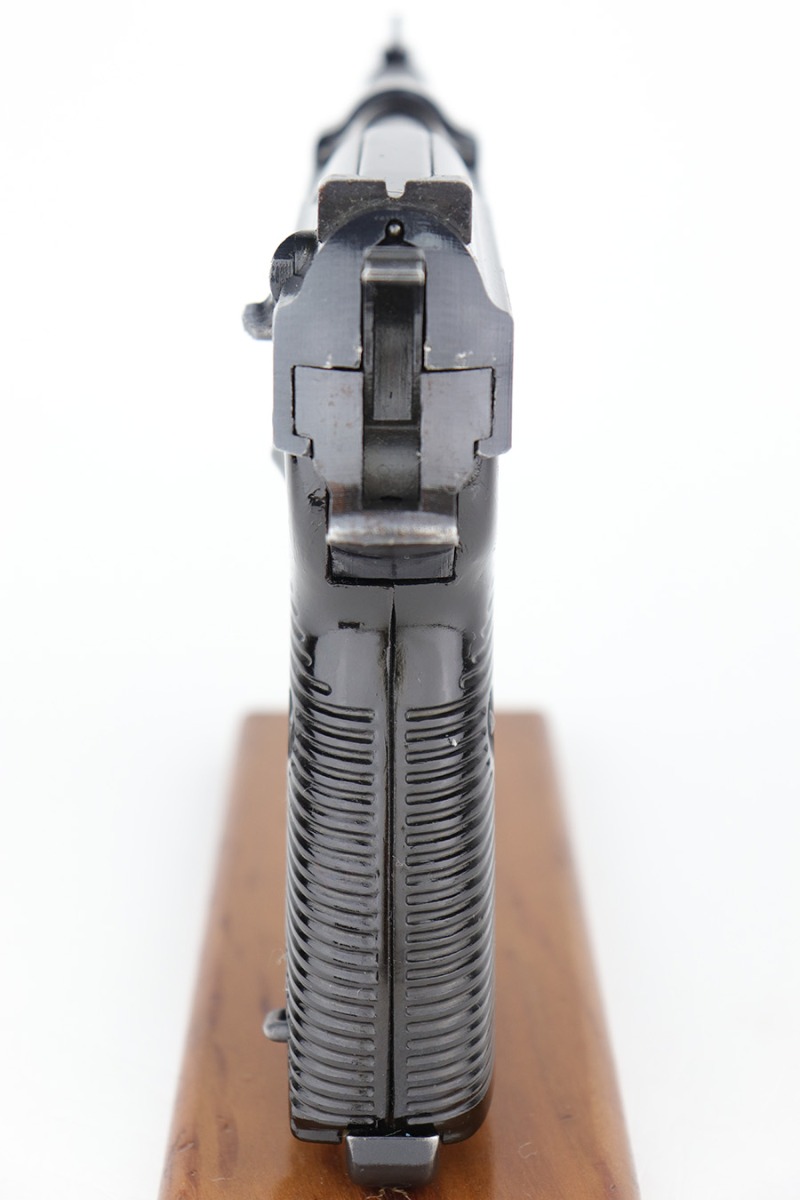 4/20/23 – This is a minty example of an end-of-war “z” suffix Spreewerk P.38 issued to the Nazi military at the end of WW2, in February of 1945. It is all matching and has the proper “Eagle 88” military acceptance proofs throughout. It also has the proper late-war cog hammer. It has retained about 97% of its original finish with just very minor thinning on the front strap and very minor wear around the muzzle and front edges of the slide. A few tiny dings here and there on both sides of the slide. Fitted with excellent blackish-brown bakelite grips. Comes with a jvd magazine. Minty bore. De-cocker is functional.