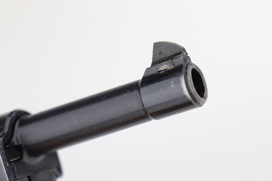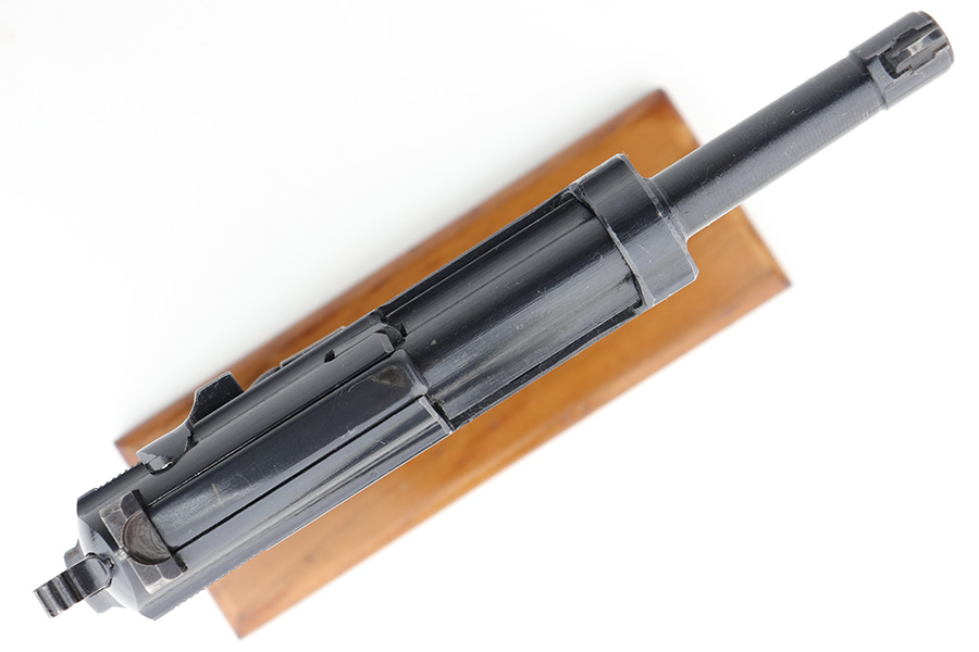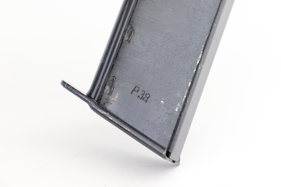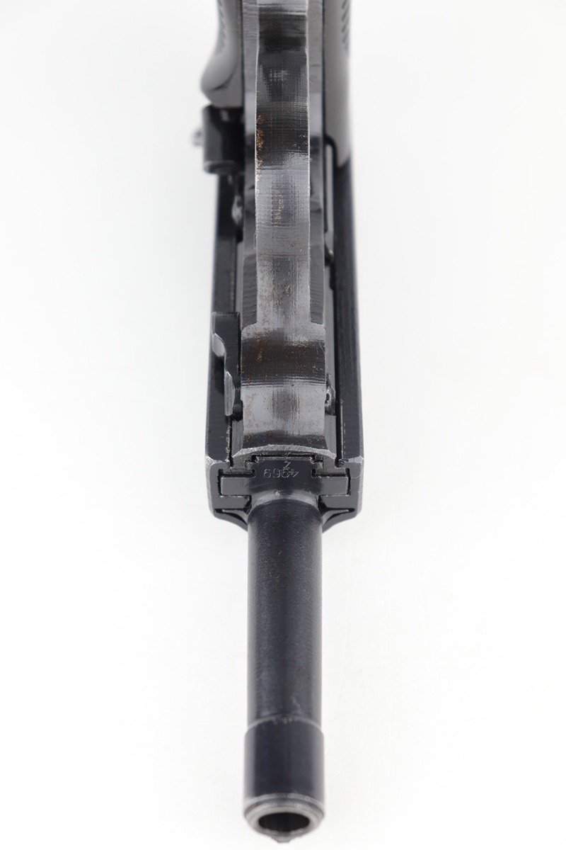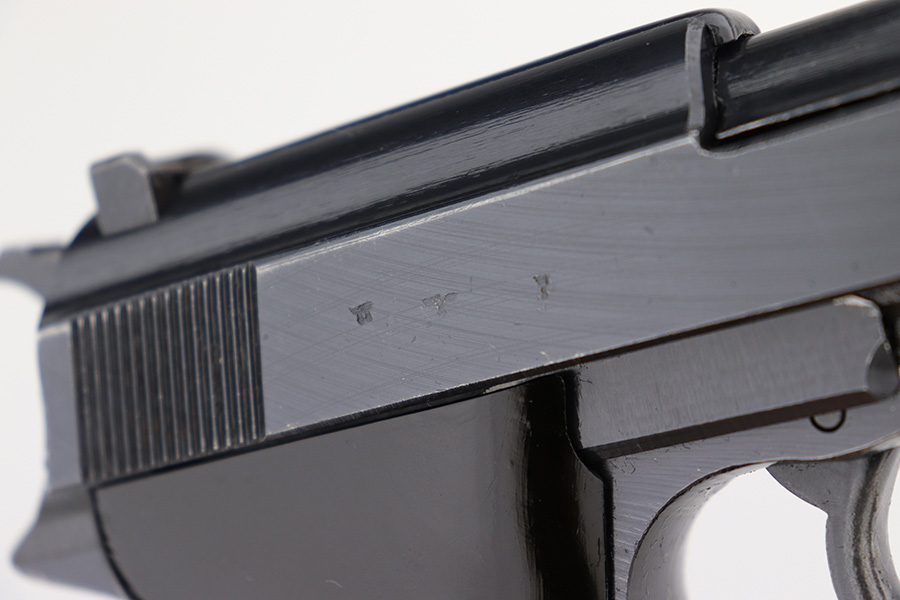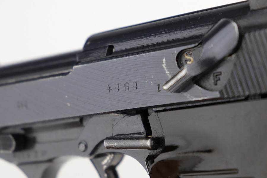 4/20/23 – This is a minty example of an end-of-war “z” suffix Spreewerk P.38 issued to the Nazi military at the end of WW2, in February of 1945. It is all matching and has the proper “Eagle 88” military acceptance proofs throughout. It also has the proper late-war cog hammer. It has retained about 97% of its original finish with just very minor thinning on the front strap and very minor wear around the muzzle and front edges of the slide. A few tiny dings here and there on both sides of the slide. Fitted with excellent blackish-brown bakelite grips. Comes with a jvd magazine. Minty bore. De-cocker is functional.