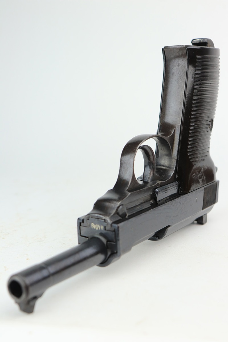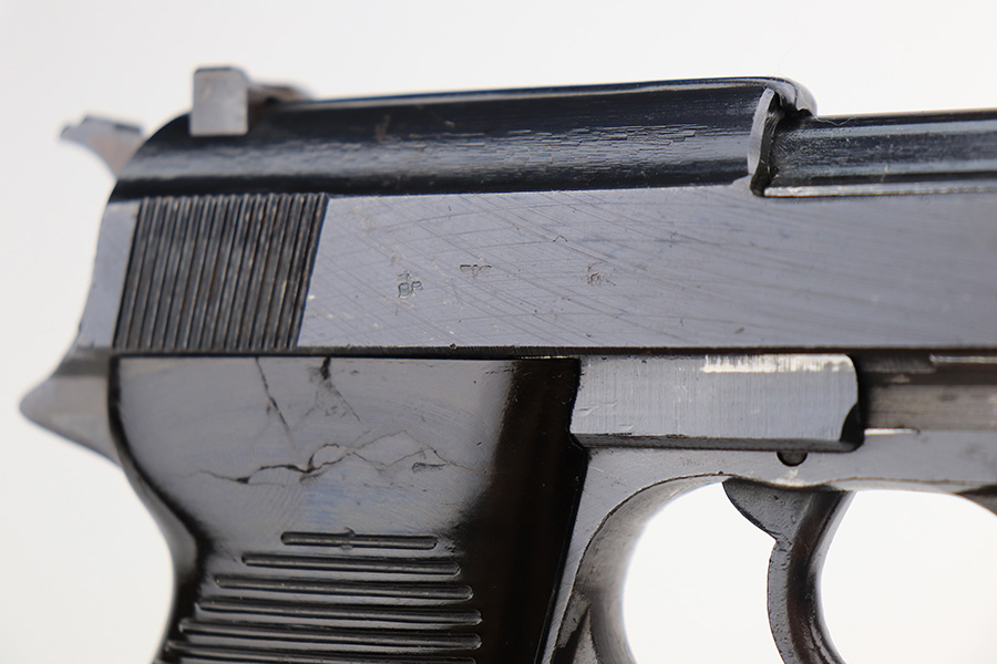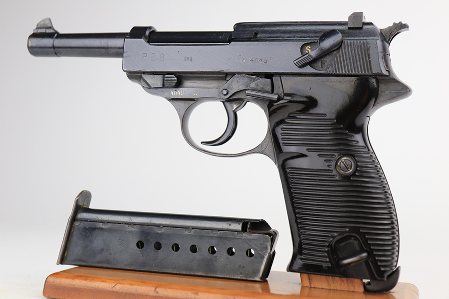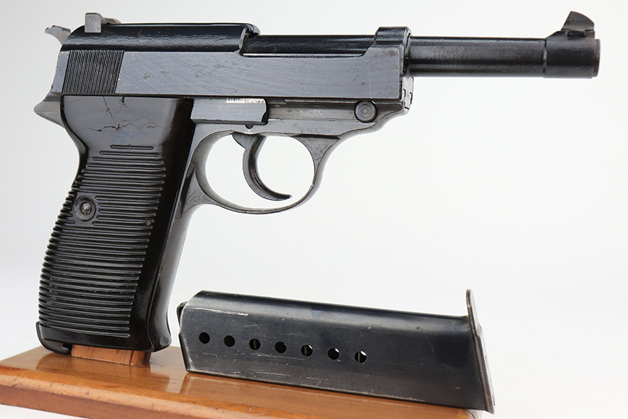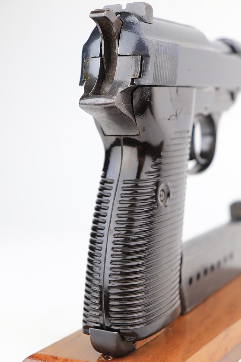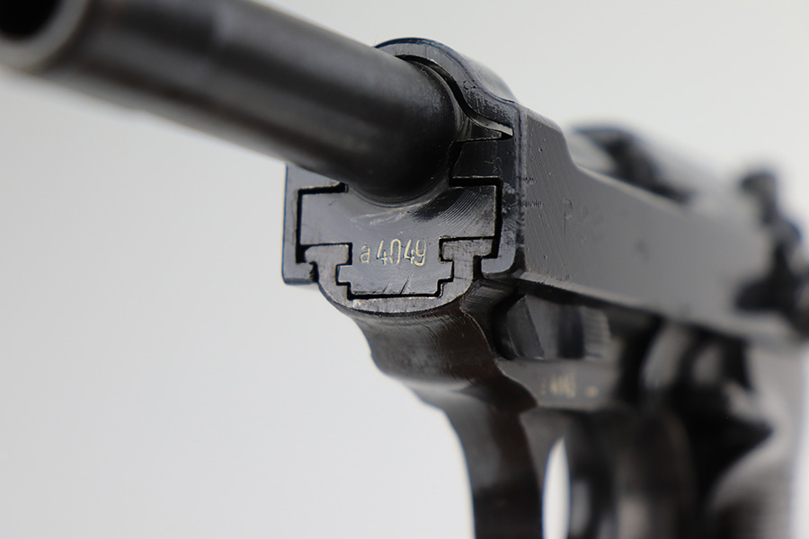 5/20/22 – This is a near-mint example of an “A”-prefix Spreewerk P.38 issued to the Nazi military at the end of WW2, in March of 1945. The gun is all matching and has the proper “Eagle 88” Nazi military acceptance proofs throughout. The gun has retained about 99% of its finish. There is just a hint of wear around the muzzle and a hint of thinning on the front strap. Some very light surface scratches on the top and right side of the slide. Tiny hint of surface rust on the hammer. Comes with period-correct bakelite grips (noticeable cracks on the right side) and a period-correct jvd magazine. The bore is mint. De-cocker is functional. The hold-open does not work on its own.