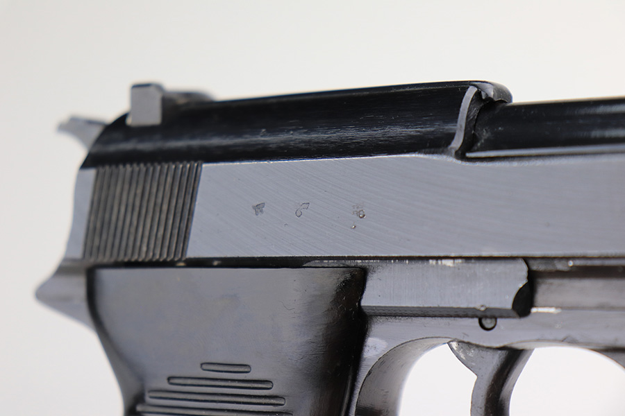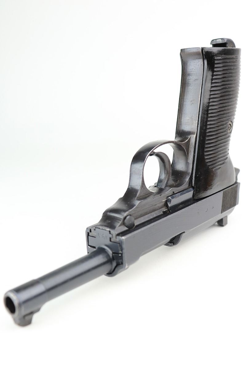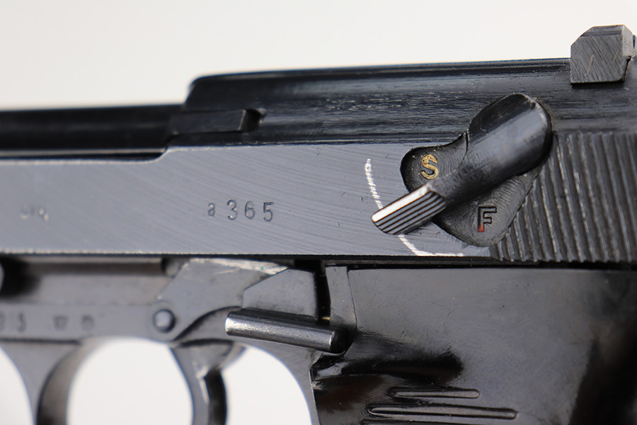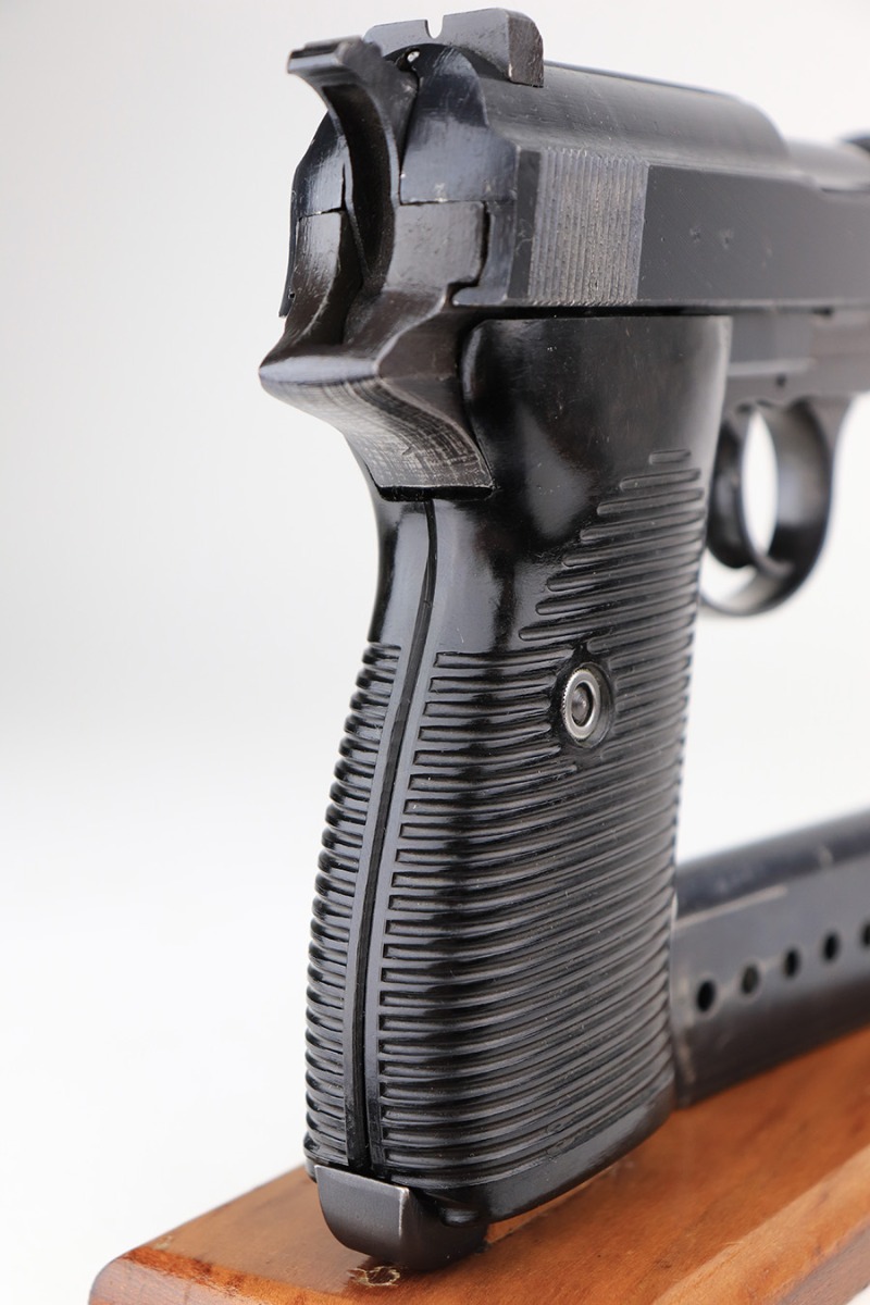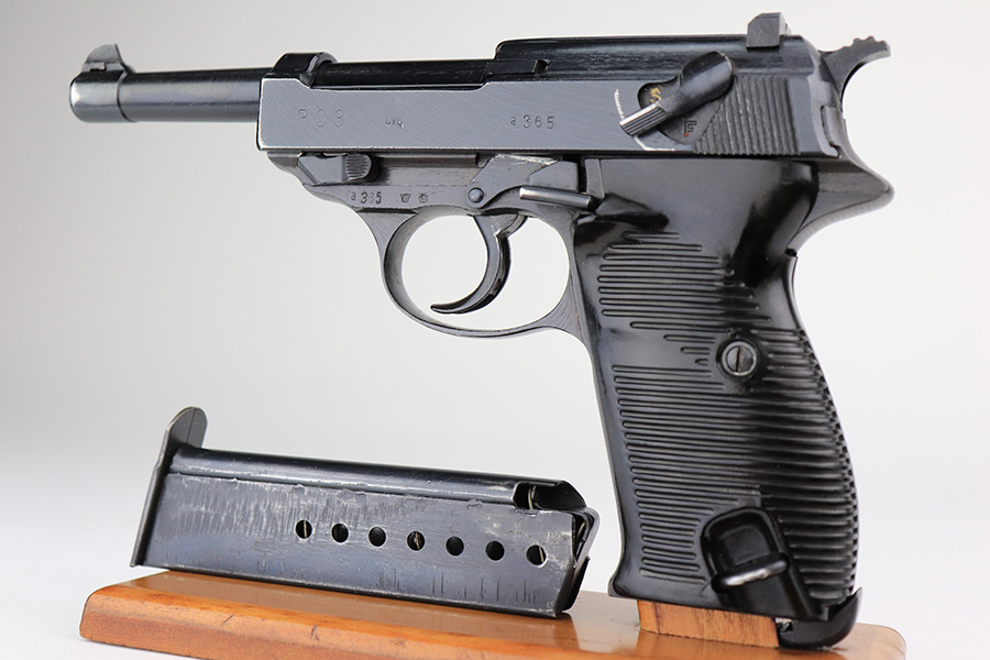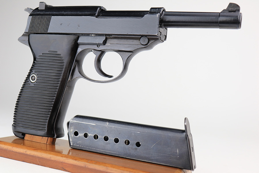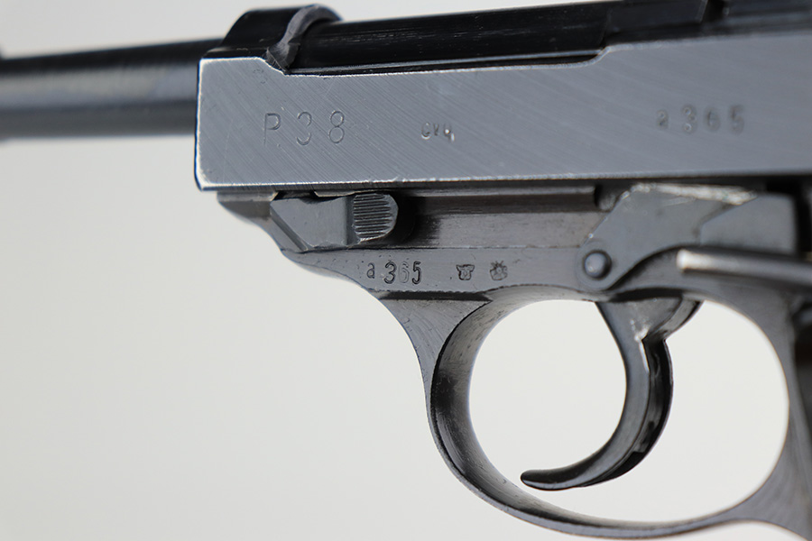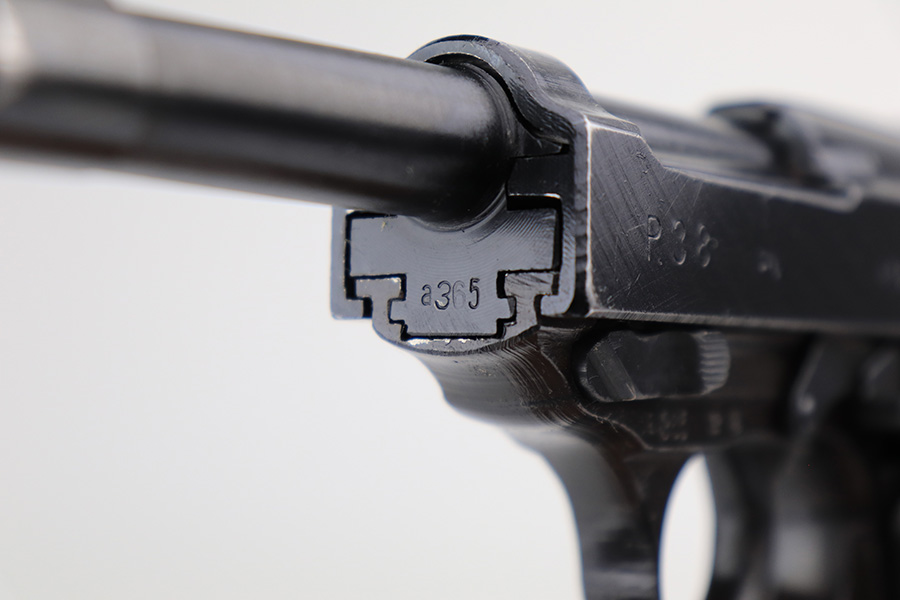 3/31/22 – This is a near-mint example of an “A” prefix Spreewerk P.38 issued to the Nazi military at the end of WW2, in February of 19345. The gun is all matching and has the proper “Eagle 88” Nazi military acceptance proofs throughout. There is an “asterisk” marking on the left side of the frame, indicating this part failed initial inspection and was sent back to the factory for repair. It has retained more than 98% of its bluing. There are just hints of wear around the muzzle and very front edges of the slide. Very light spotty wear and pin-pricking on the front strap. Comes with excellent period-correct grips and a jvd magazine. Mint bore. De-cocker is functional.