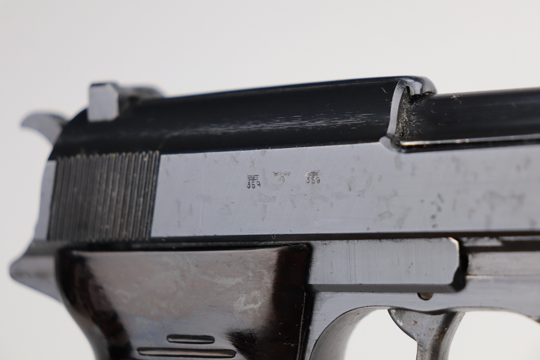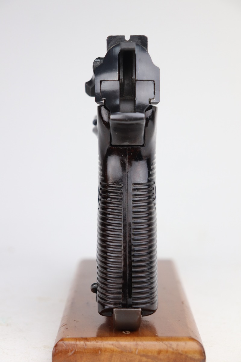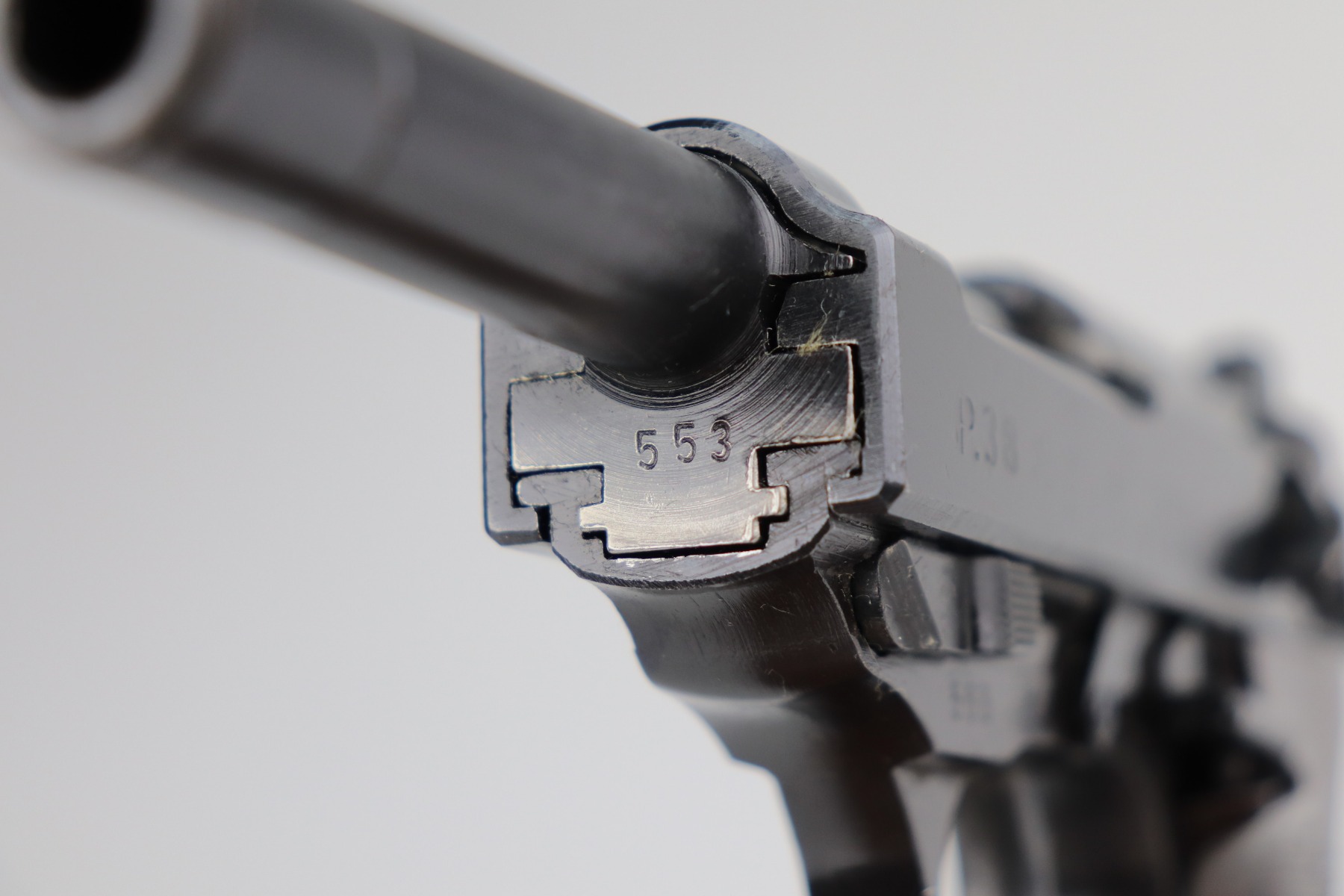 3/4/21 – This is a minty example of a Walther P.38 made at the end of the war. This one was manufactured in January of 1945, so it was one of the last made. It is all matching and has the proper “Eagle 359” Nazi military proofs. It has retained about 98% of its bluing. There is just very minor thinning on the front strap. There are small pits along both sides of the slide. They look like imperfections from the machining process, likely from the factory rushing to get them finished. Comes with excellent grips and a scarce late-war “u” marked magazine. The bore is stone-mint. De-cocker is functional.