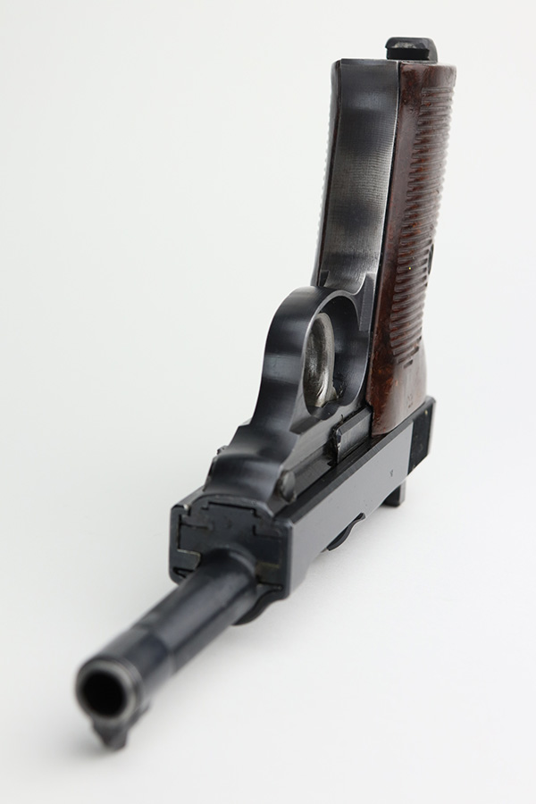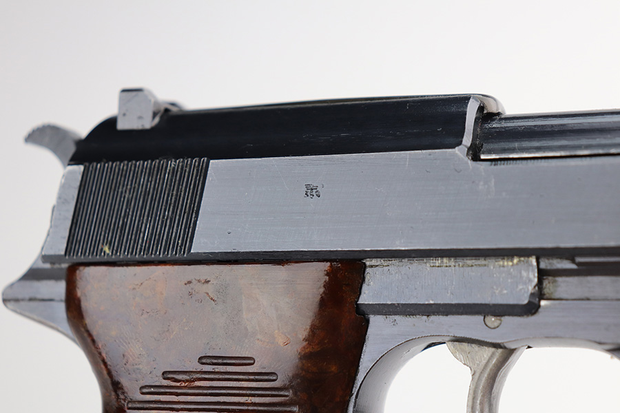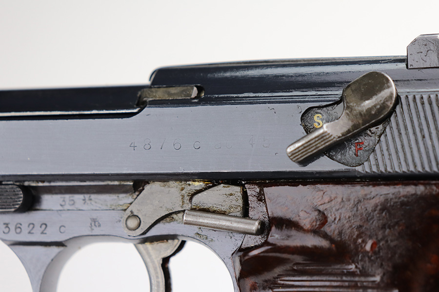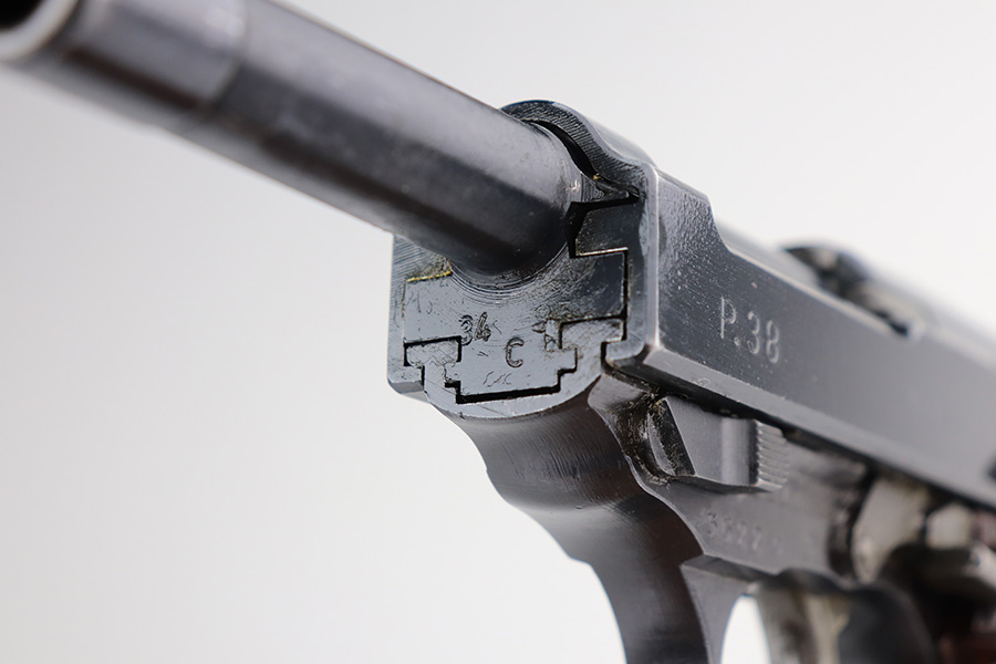 1/16/23 – This is a minty example of an AC 45 Walther P.38 made at the very end of WW2. This is a GI mismatched gun, put together by an American GI when the Walther factory was liberated. All of the parts are mismatched and in the proper “c” serial block, correct for this variation. It only has one “Eagle 359” military acceptance proof on the right side of the slide, indicating it was never issued. It has a mixture of phosphate and blued parts. This one also has a “35 asterisk” marking on the left side of the frame. This marking has been observed on other late-war guns and some Mod HP pistols. The exact meaning of this marking is still unknown in the collector community. This particular gun has retained about 97% of its original finish. There is minor thinning on the front strap and some very minor wear on the front edges of the slide. Fitted with excellent reddish bakelite grips and comes with a jvd magazine. Excellent, shiny bore with strong rifling. De-cocker functions properly.