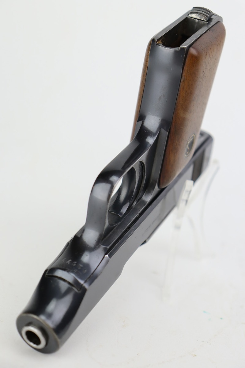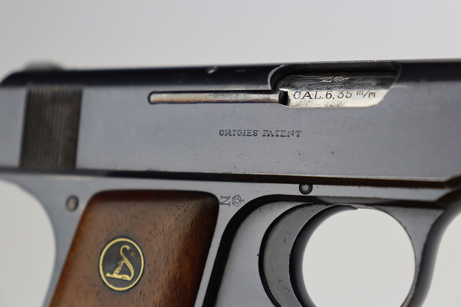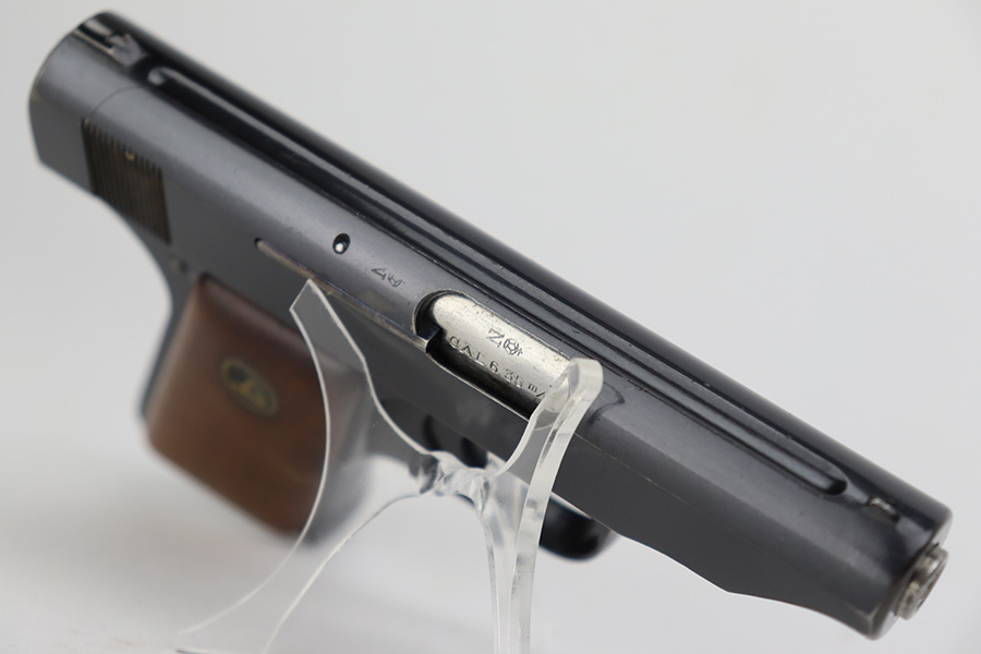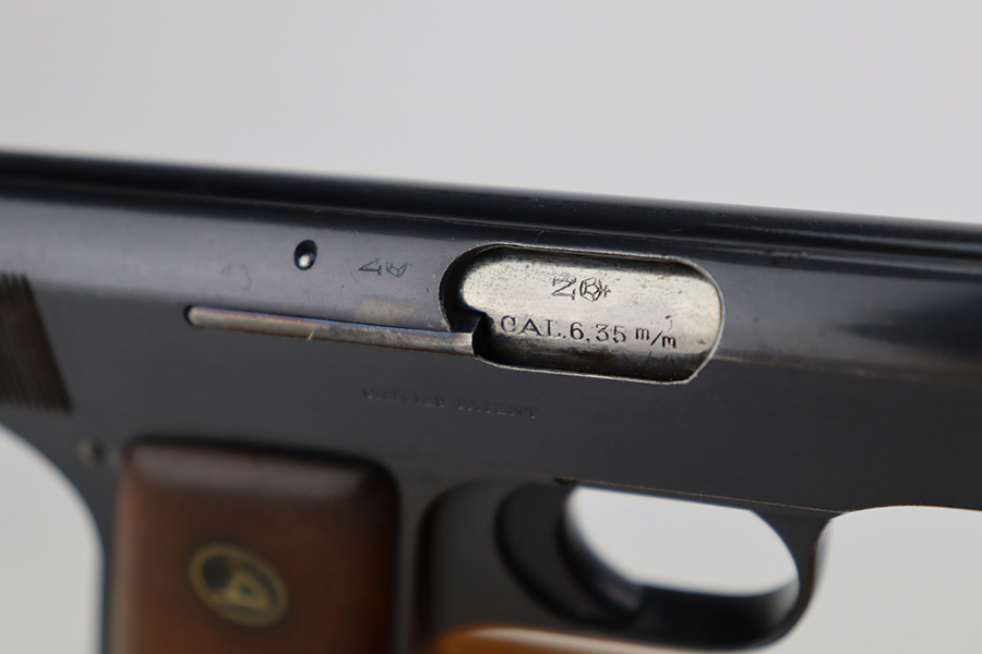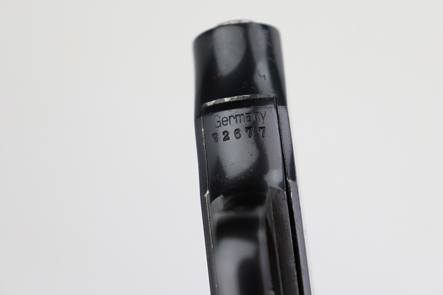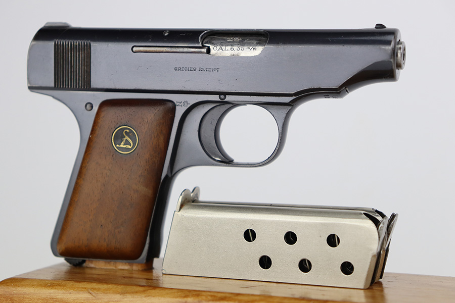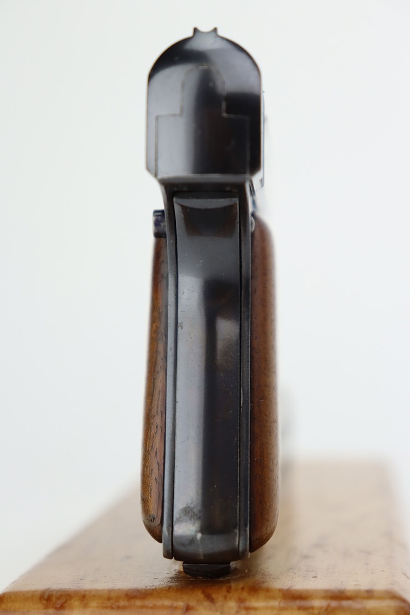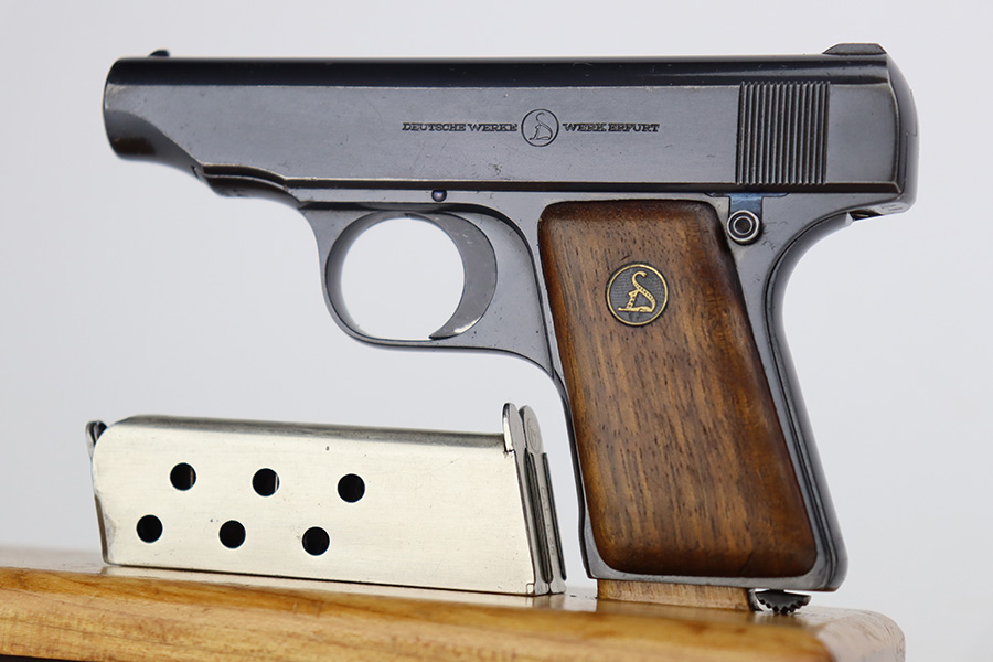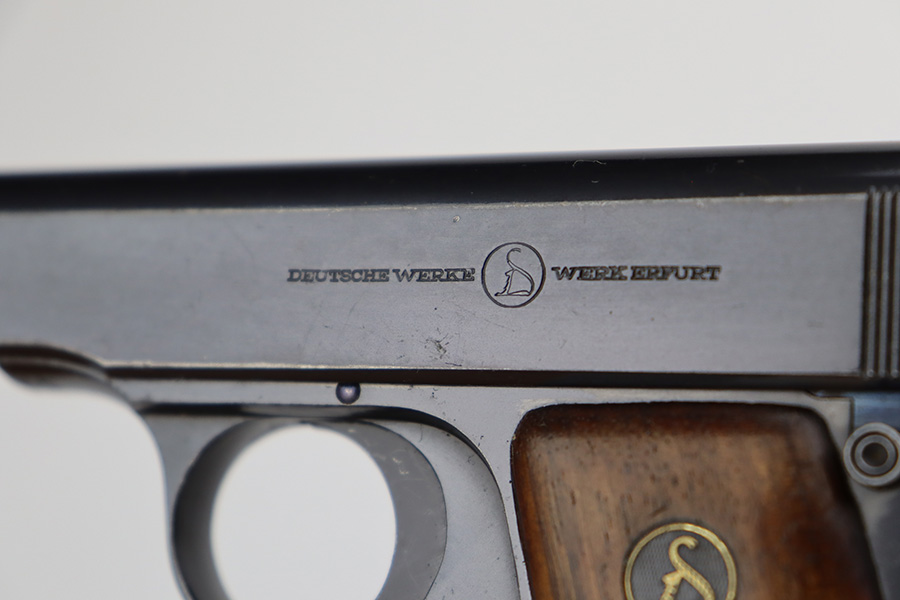 7/12/23 – This is a minty example of an Erfurt Ortgies pocket pistol, manufactured in the 1920s and chambered in 6.35mm or .25 ACP. All matching with the proper “Crown N” proofs. “Germany” export marking on the underside of the frame. It has retained nearly all of its finish with very minor wear along the high edges of the slide. Excellent wood grip. Comes with two proper magazines. Very nice bore with good rifling.