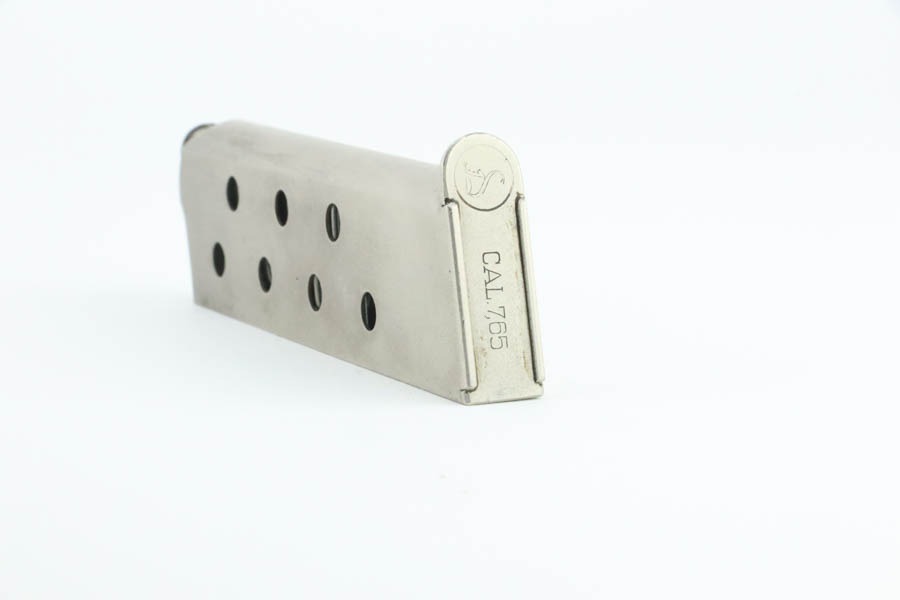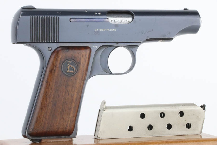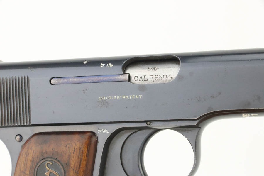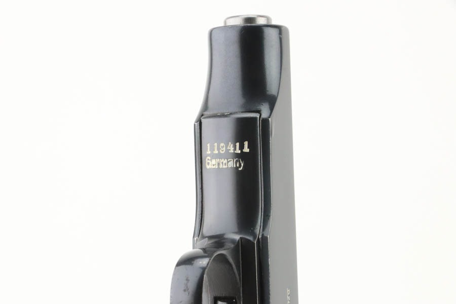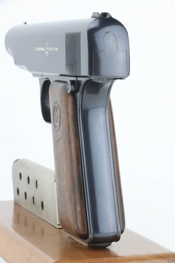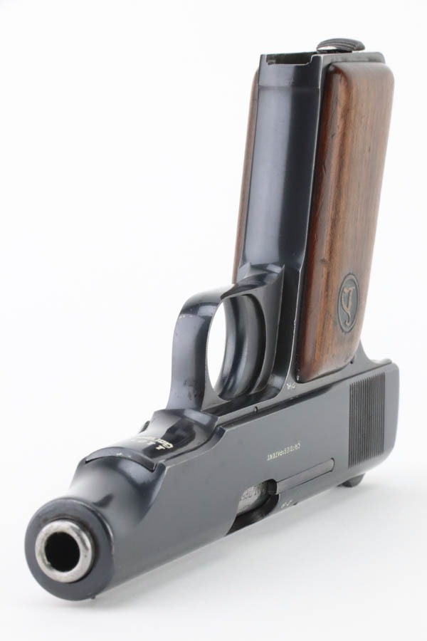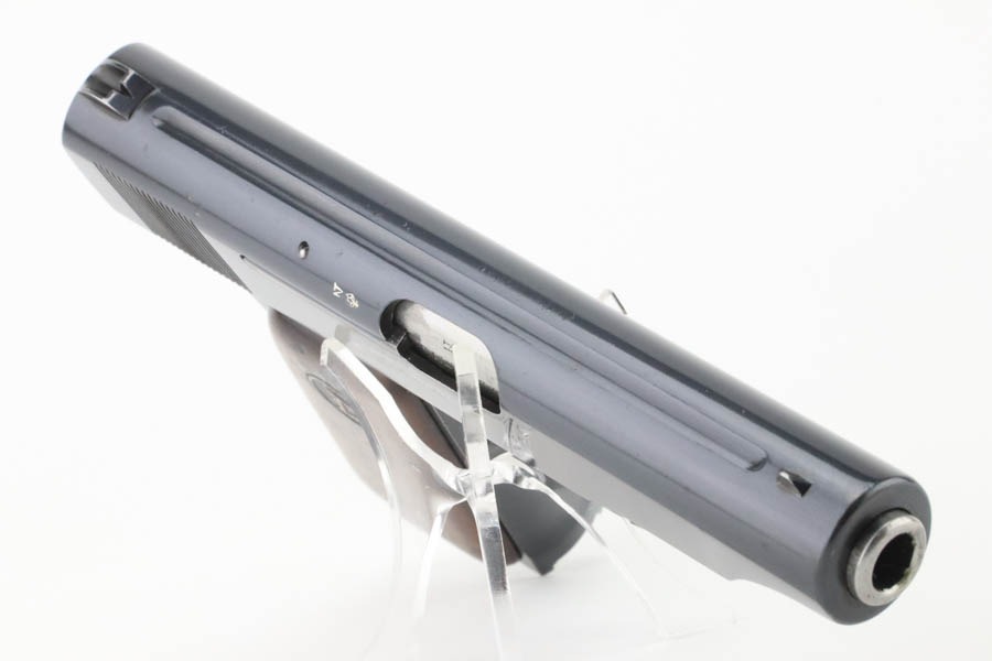 10/2/24 – This is a beautiful, near-mint example of an Erfurt Ortgies 7.65mm pistol sold in the commercial market in the 1920’s. All matching and “Crown N” proofed. There is a “Germany” export marking on the frame, indicating it was most likely sold in the US retail market. The gun has retained virtually all of its bluing with very little sign of use or wear. There are just a few small dots of light oxidation here and there. Fitted with period-correct wood grips – some minor bruising on both sides. Comes with a factory satin-nickeled magazine. Minty bore.