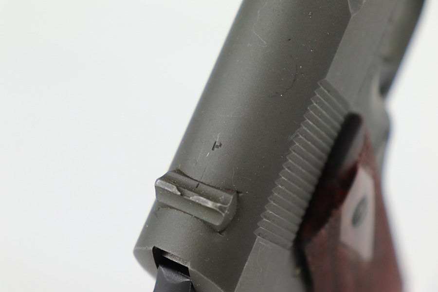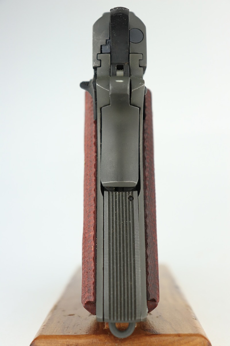 3/17/23 – This is a minty example of a Model 1911A1, chambered in .45 ACP. The frame was made Essex, and the slide was made by Remington Rand. Un-marked barrel. The gun has been arsenal-refurbished and refinished. Virtually no actual finish loss, just some very light scratches and scuffs here and there. Excellent red plastic grips. Comes with one magazine. The ejection port has been professionally modified. Mint bore.