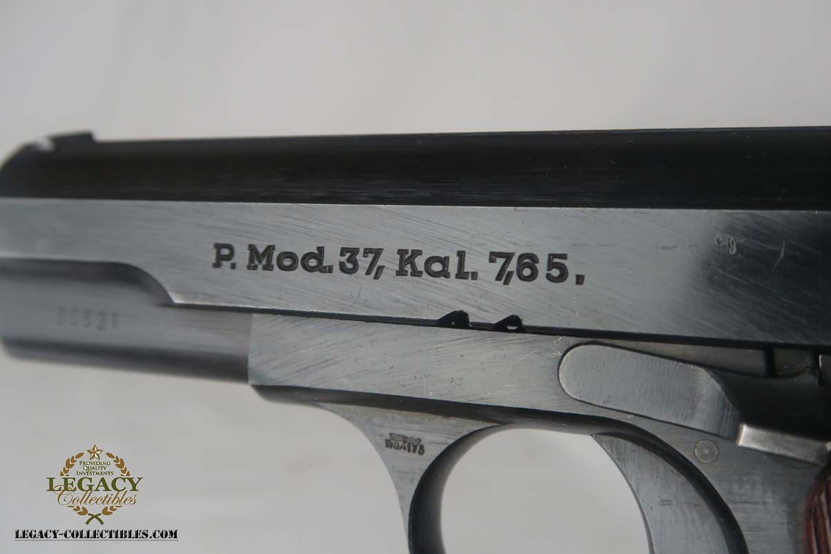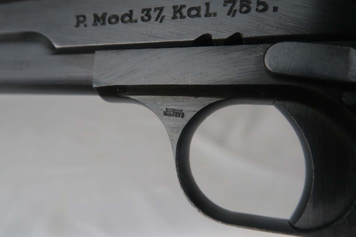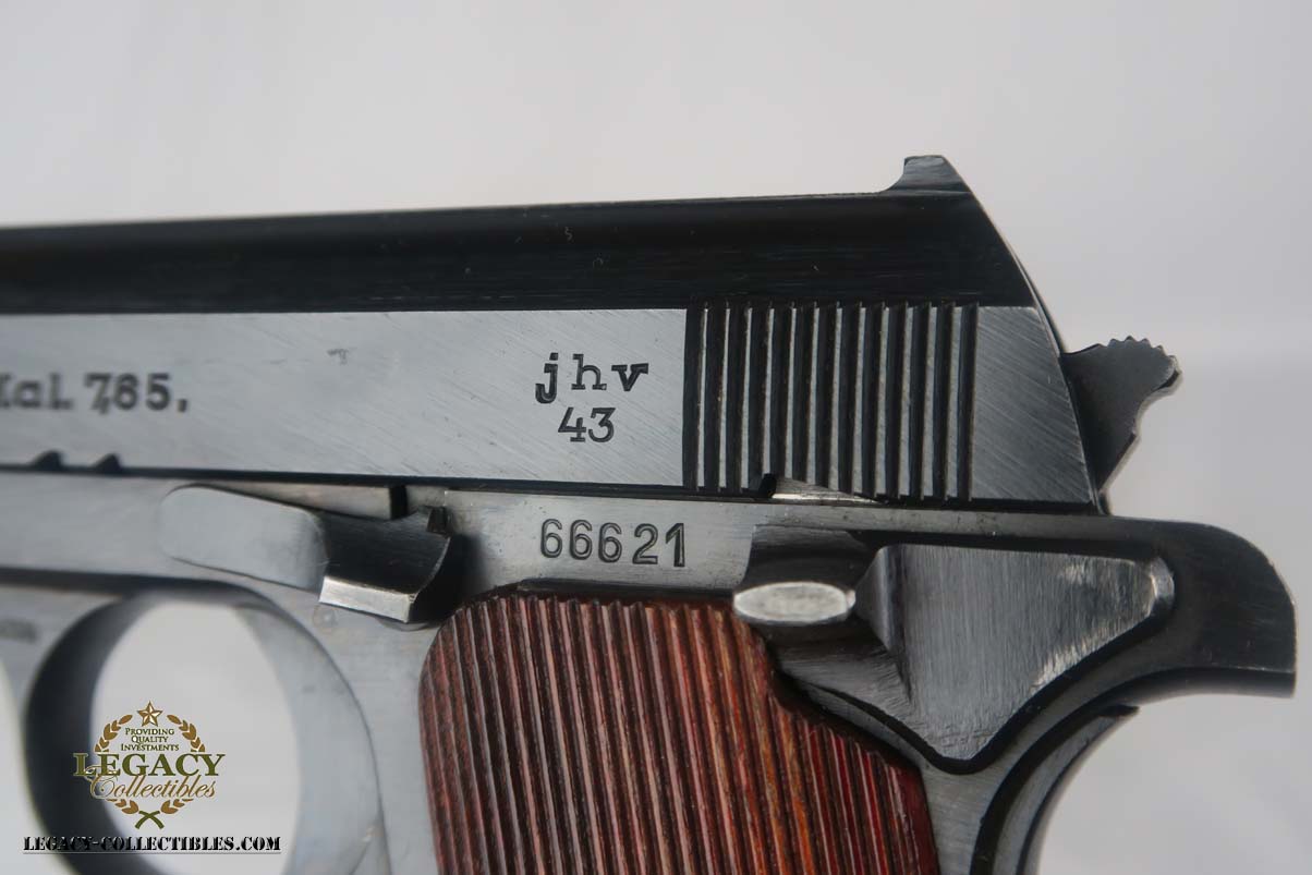 6/12/17 – This is a near-mint Nazi Femaru m37, marked jhv 43 on the slide, with original matching magazine.  The original bluing rates at 99%, with minor muzzle wear.  The pistol is all matching, including the magazine.  It is WaA173 marked on the trigger guard.  Minty bore.
