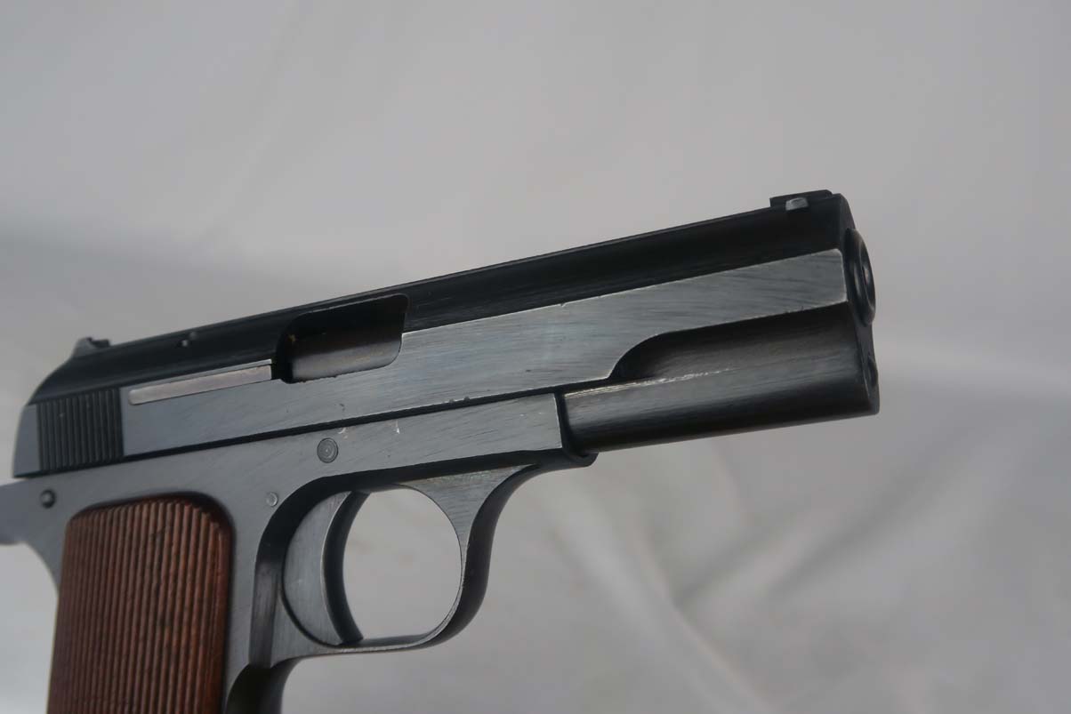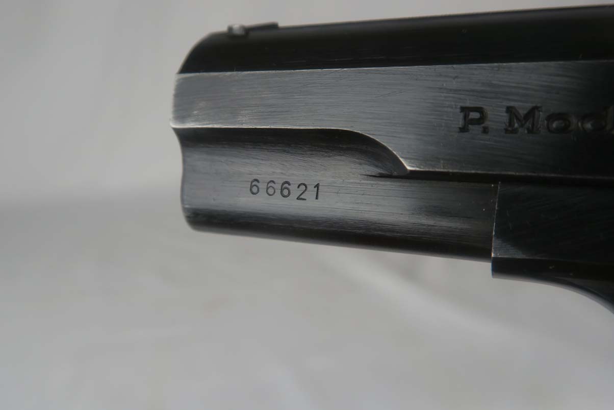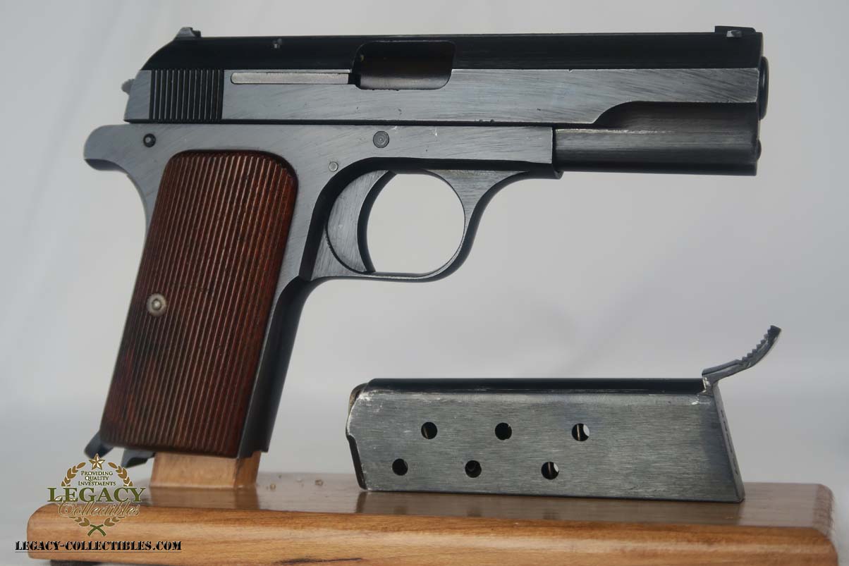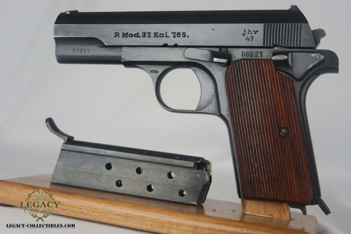 6/12/17 – This is a near-mint Nazi Femaru m37, marked jhv 43 on the slide, with original matching magazine.  The original bluing rates at 99%, with minor muzzle wear.  The pistol is all matching, including the magazine.  It is WaA173 marked on the trigger guard.  Minty bore.