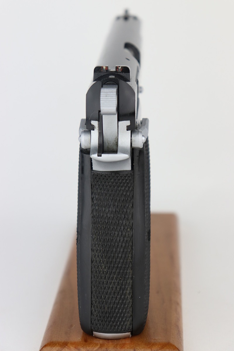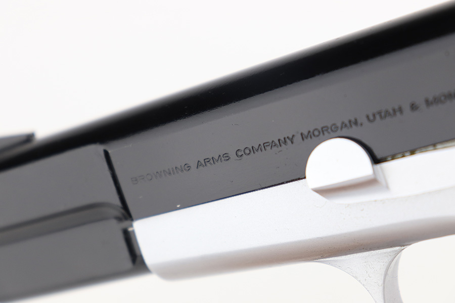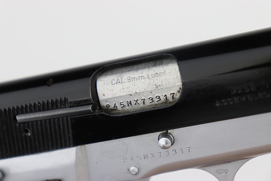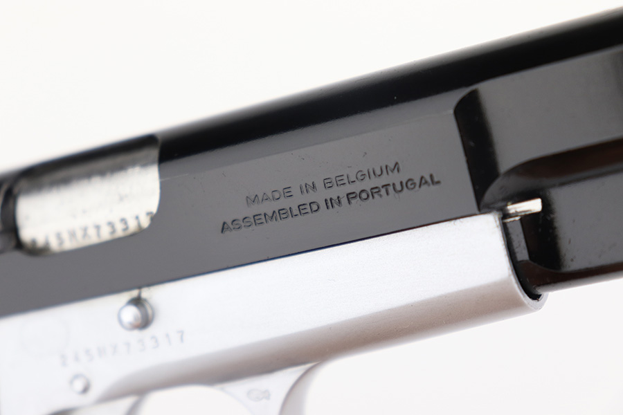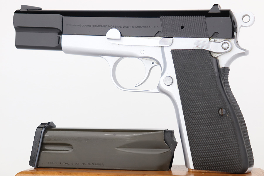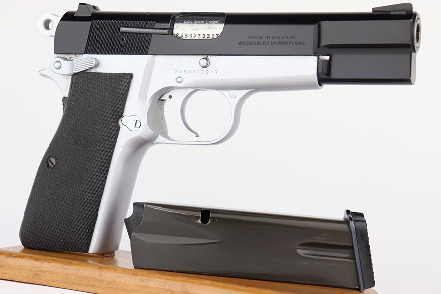 12/6/22 – This is a near-mint example of an FN Browning Hi Power pistol, chambered in 9mm Luger. From the “NX” date code in the serial number, it was manufactured in 1993. It is all matching and is marked “Made in Belgium, Assembled in Portugal” on the right side of the slide. The slide has a black enamel finish, and the rest of the gun is satin-nickeled. The gun is in like-new condition with no signs of wear to highlight. Fitted with an excellent black rubber grip and comes with one proper magazine that has a black rubber base. Minty bore.