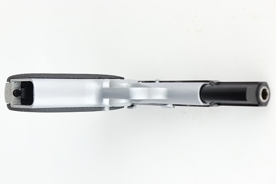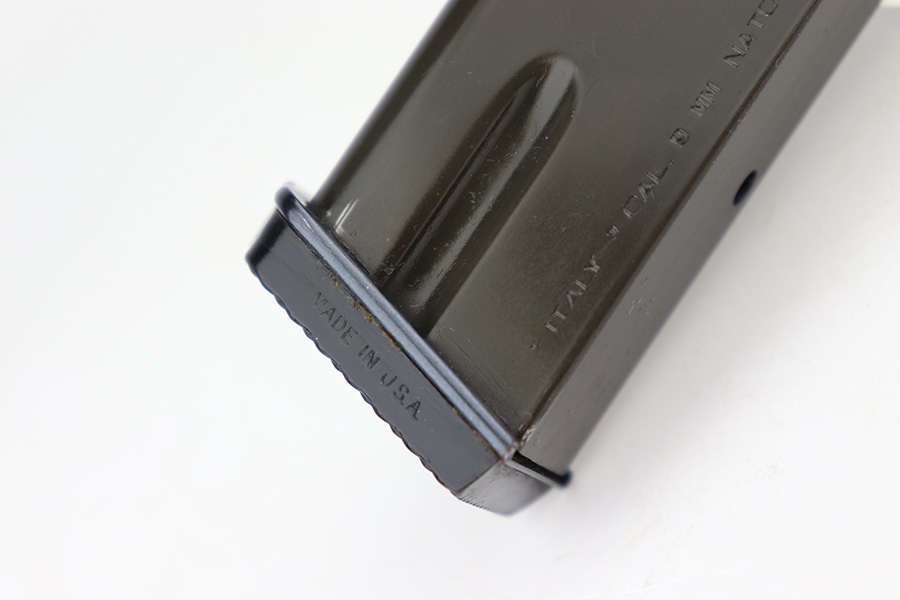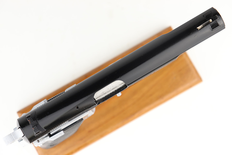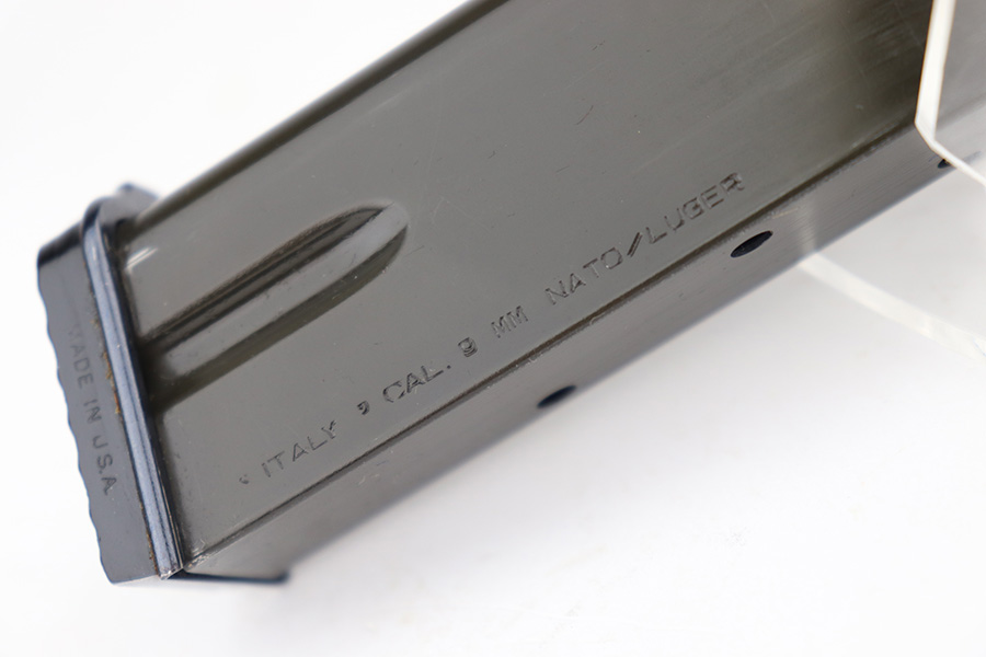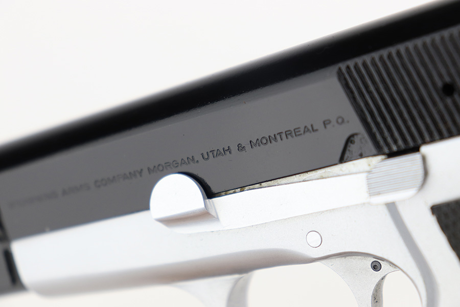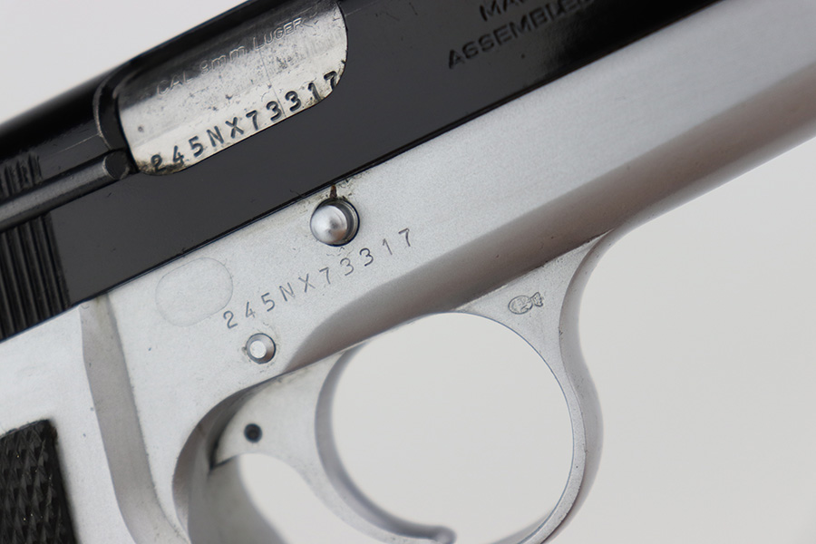 12/6/22 – This is a near-mint example of an FN Browning Hi Power pistol, chambered in 9mm Luger. From the “NX” date code in the serial number, it was manufactured in 1993. It is all matching and is marked “Made in Belgium, Assembled in Portugal” on the right side of the slide. The slide has a black enamel finish, and the rest of the gun is satin-nickeled. The gun is in like-new condition with no signs of wear to highlight. Fitted with an excellent black rubber grip and comes with one proper magazine that has a black rubber base. Minty bore.