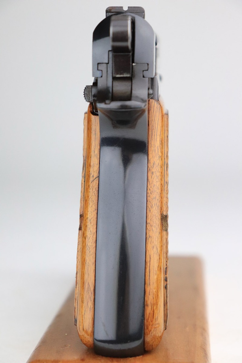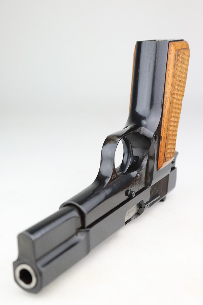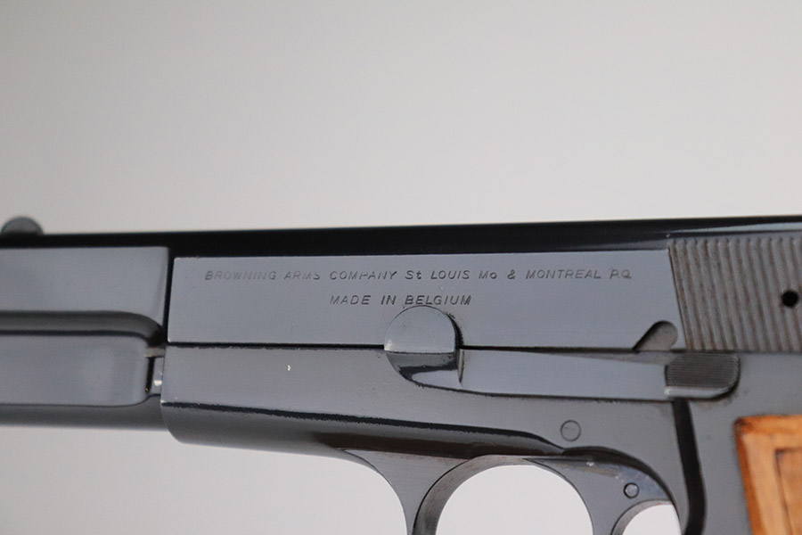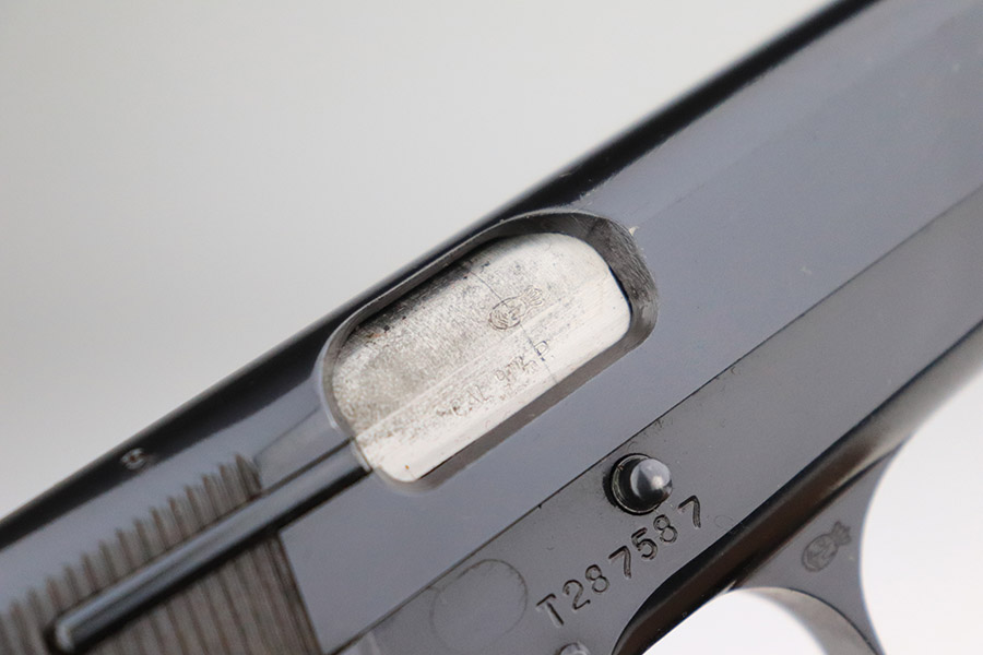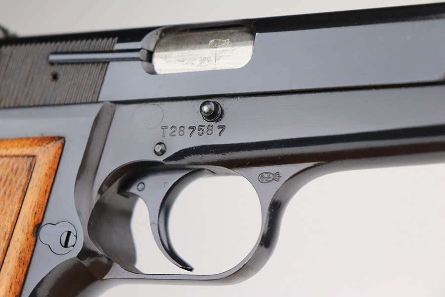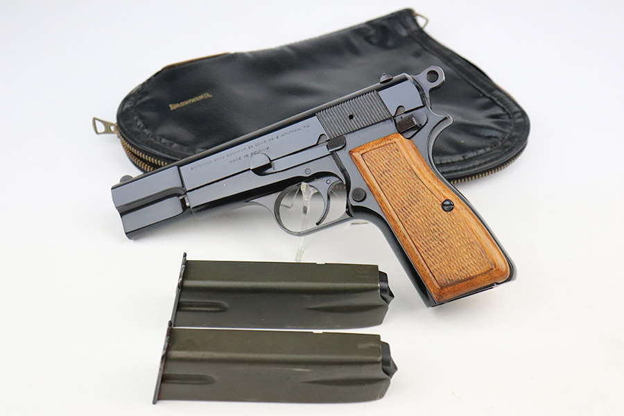 11/9/22 – This is a beautiful, near-mint example of a Beglian FN Browning Hi Power, manufactured in 1969. It is all matching and has the proper Belgian proofs throughout. This is a “T Series” gun, regarded by collectors as being the last run of FN’s high polish guns with very quality fit and finish from the factory. This one comes with an original soft case and two proper magazines. It has retained nearly all of its original high polish finish with just hints of wear on some of the high edges and a few small dots of wear on the front strap. Some very minor pin-pricking on both grip straps. Comes with excellent hand-checkered grips. Mint bore.