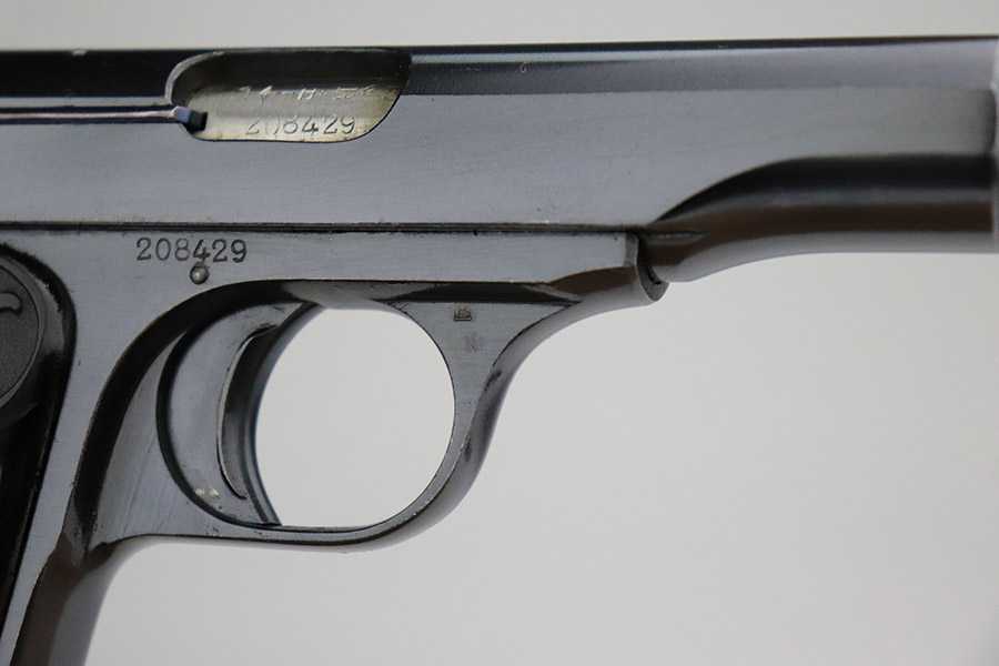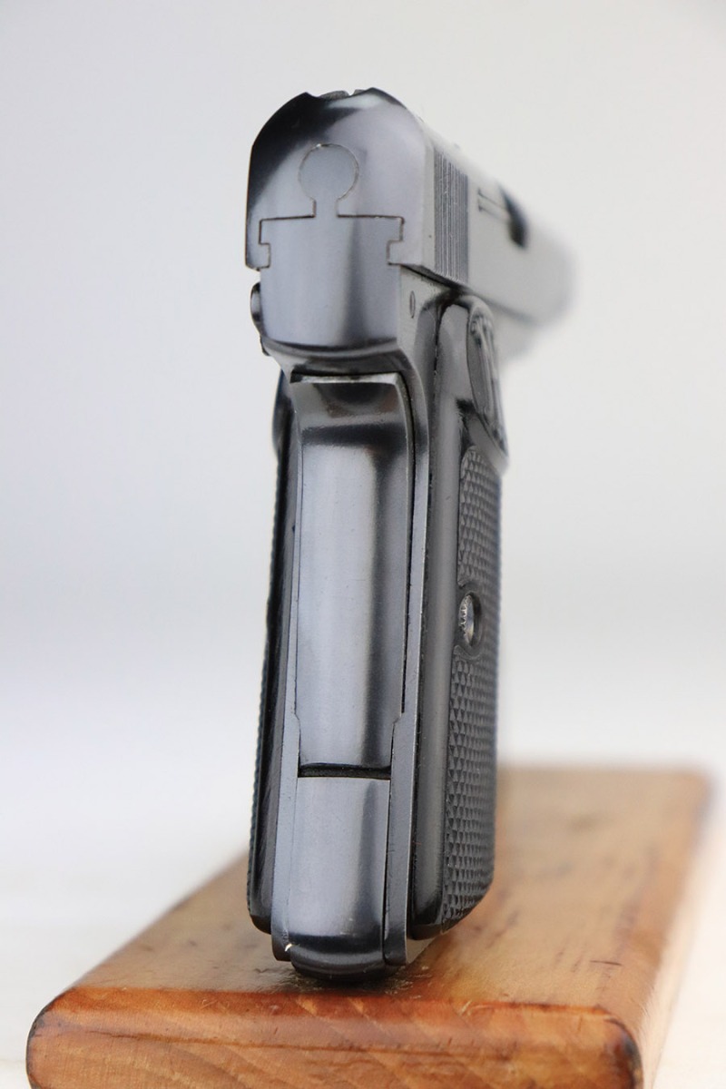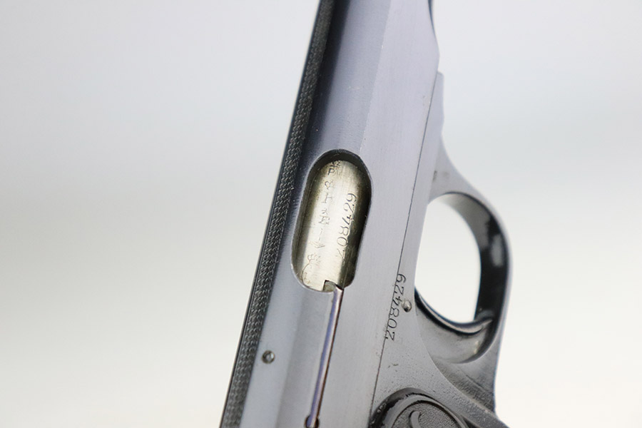 11/8/22 – This is a near-mint example of a Belgian FN Browning Model 1910 sold in the commercial market in the 1920’s. It is all matching and has the proper Belgian proofs throughout. It has retained nearly all of its original bluing with just a few tiny handling marks on both sides of the slide. Comes with excellent period-correct black bakelite grips and one proper magazine. The bore is near-mint.