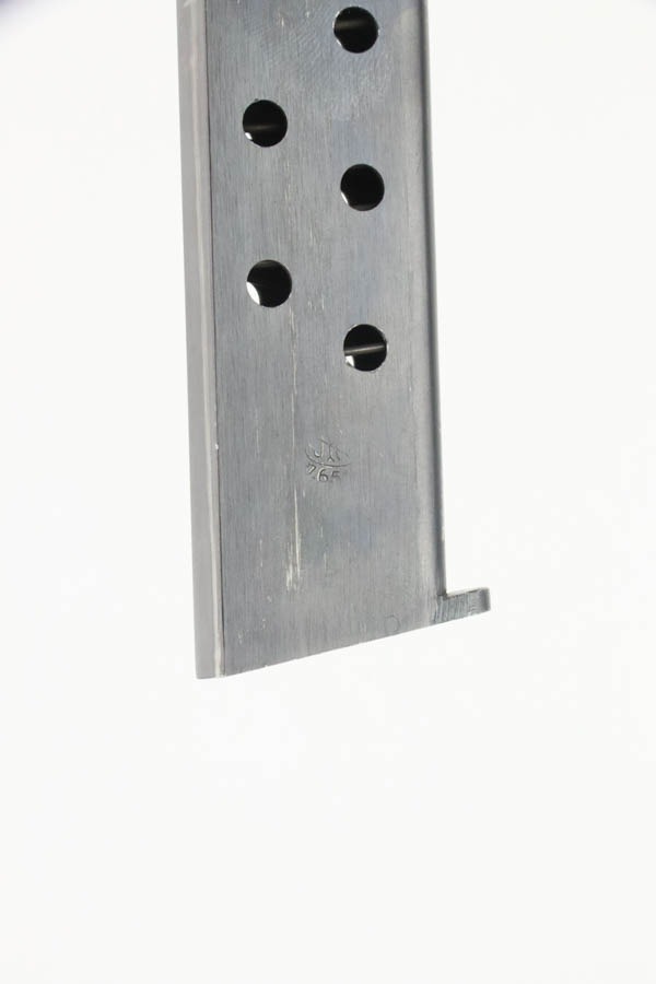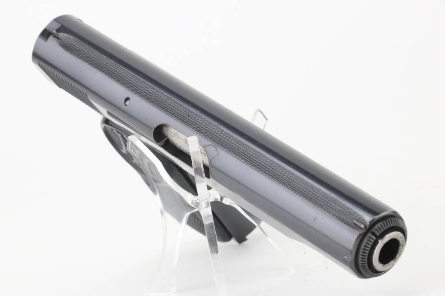11/11/24 – This is a potentially rare variation of the FN Browning Model 1910, discussed on page 230-231 of the 2nd edition of Vanderlinden’s “FN Browning Pistols” book: “An estimated 6064 pistols were completed at FN in July and August 1940 during the first months of the occupation. This work was performed before the arrival of the first German weapons inspector (WaA613 code). Occupation assembled pistols were usually in the final stages of assembly, have Belgian proofs and feature synthetic grips instead of prewar horn grips. This is due to the fact that horn was unavailable during the war. The wartime assembled pistols were not entered in warehouse logs and do not show up in FN archives.” He records several serial numbers in his book, ranging from about 467xxx to 473xxx. Our pistol is in the proper serial range and has black synthetic grips. All matching. It has retained nearly all of its finish with just a hint of muzzle wear and a few very light surface scratches on the right side of the slide. Comes with one proper magazine. Stone-mint bore.