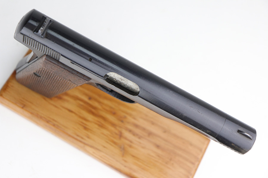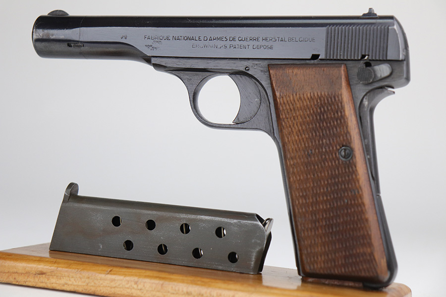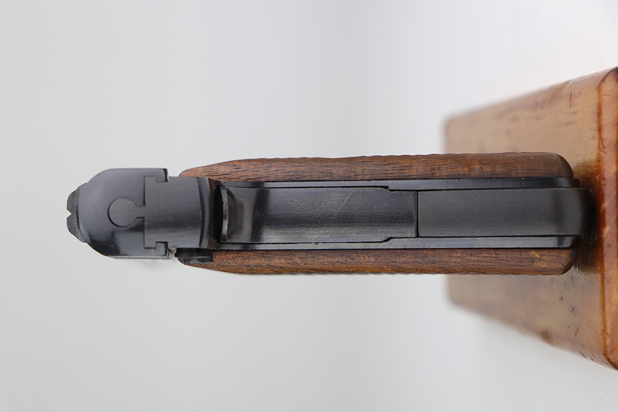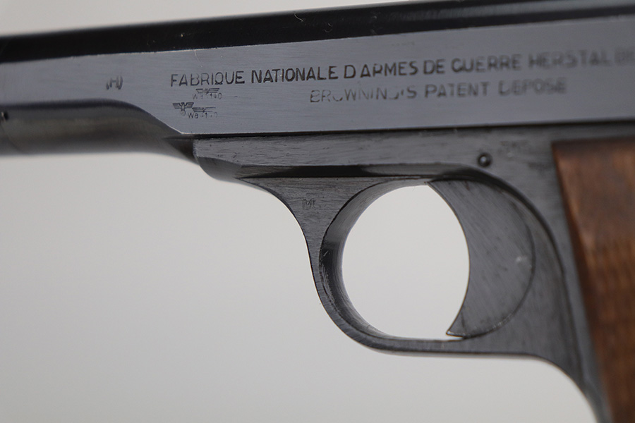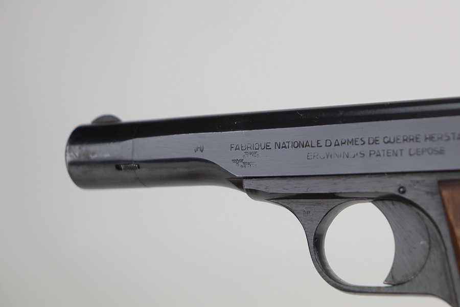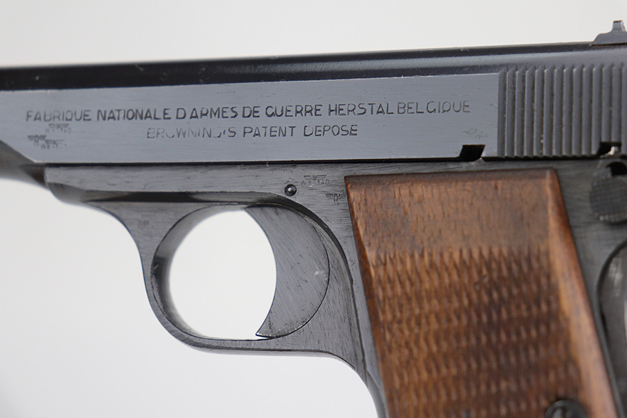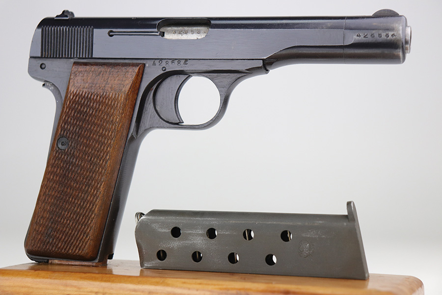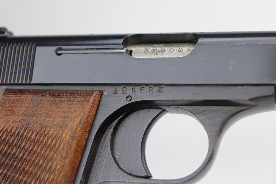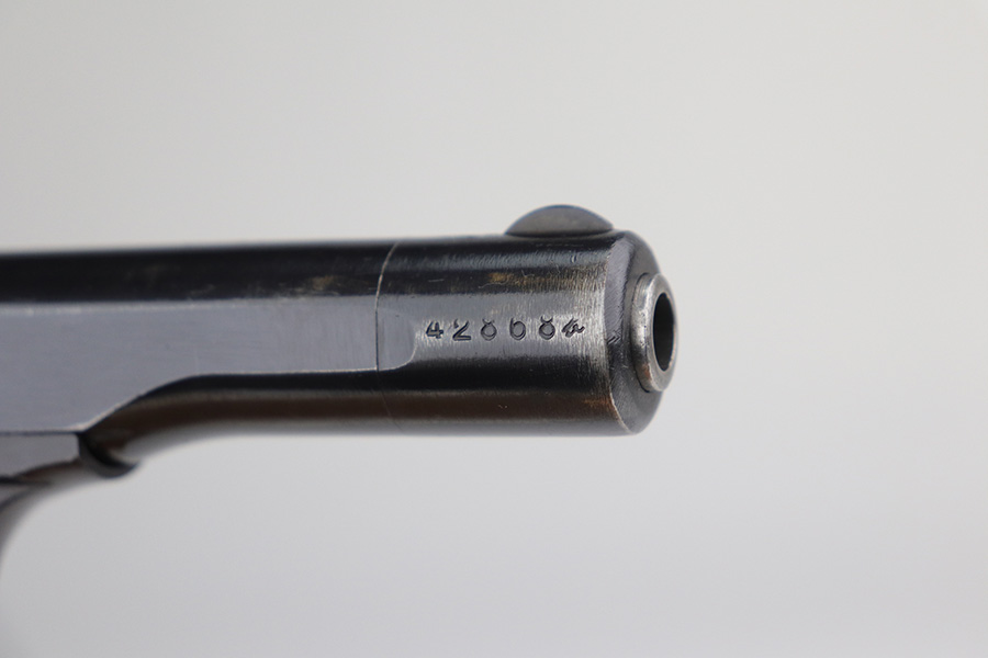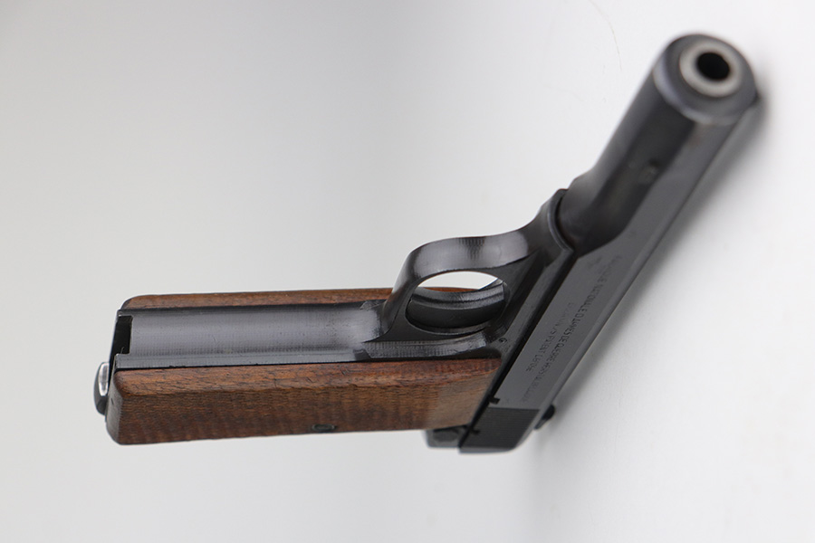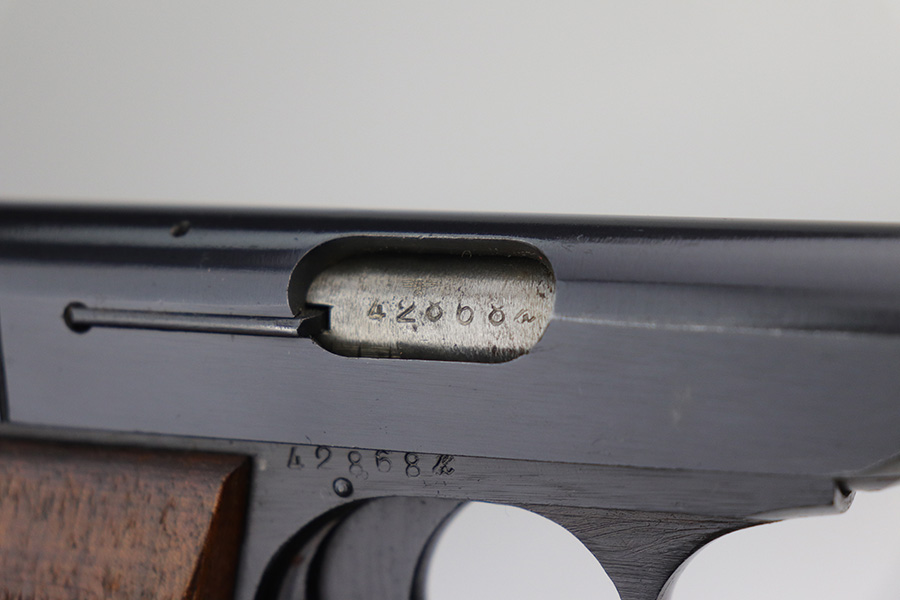 10/22/21 – This is a minty example of an FN Browning Model 1922 issued to the Nazi military during WW2. It is all matching and has the proper “Waffen 140” Nazi military acceptance proofs. It has retained about 97% of its original finish. There are hints of wear on the high edges, but most of the wear is around the muzzle. There are also a few small dots of wear on the right side of the slide. A small area of minor oxidation on the left side of the slide around the muzzle. Comes with excellent wood grips and a period-correct phosphate magazine. The bore is mint.