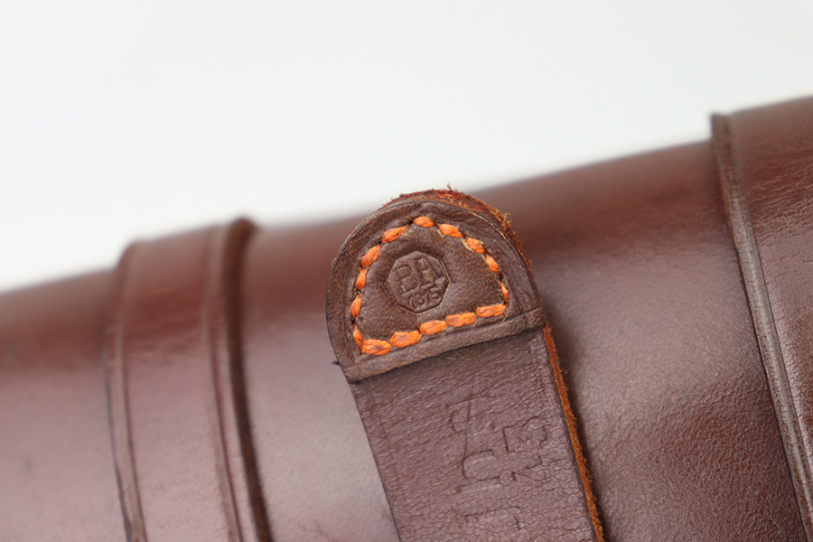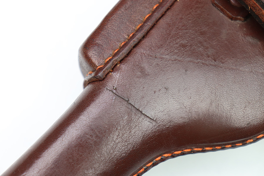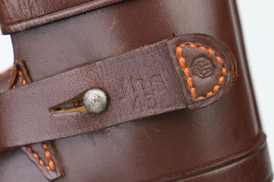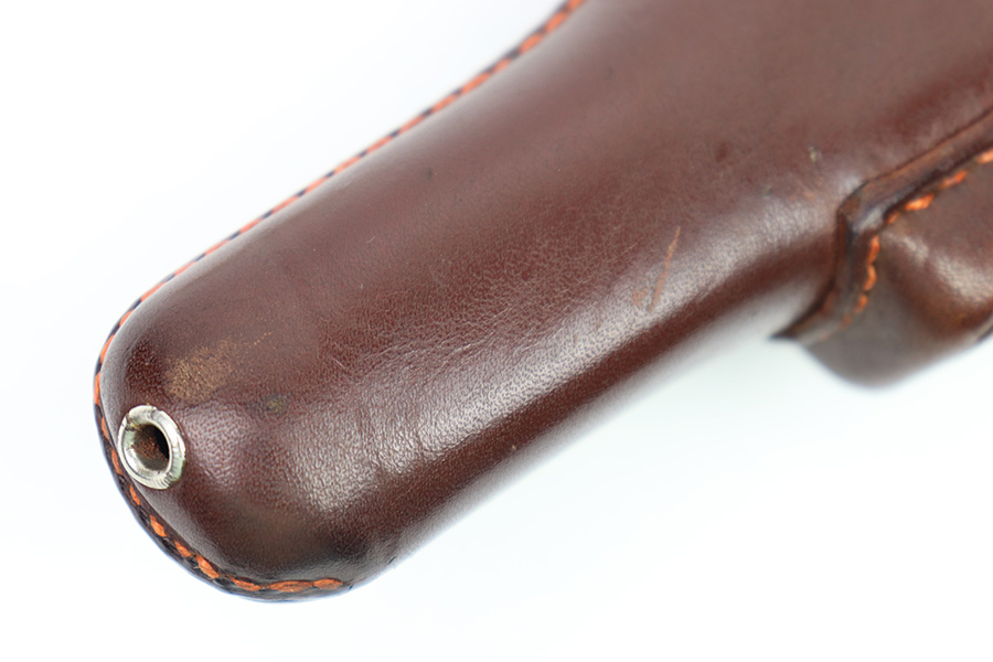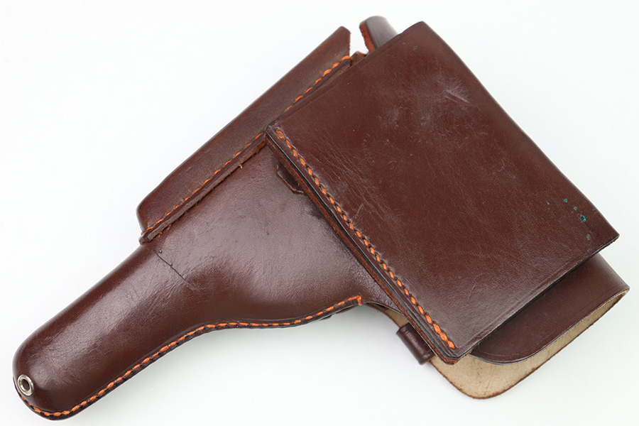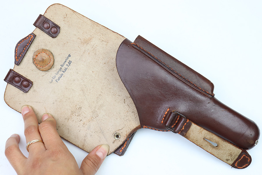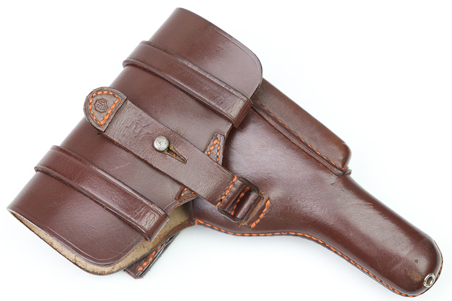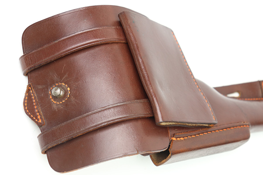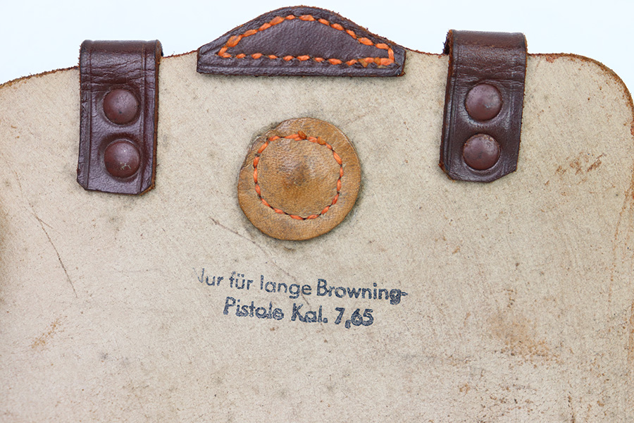 10/6/22 – This is a mint, unissued condition FN Model 1922 Holster from WW2. The holster is maker stamped and dated on the closure strap “jhg 43”. The interior leather has a crisp, original ink stamp indicating for use with Browning Pistols in 7.65mm. The chocolate brown leather is clean and crisp with mild pliability. The only takeaway is some light surface scratches near the closure knob on the exterior leather. The stitching is all tight and original.