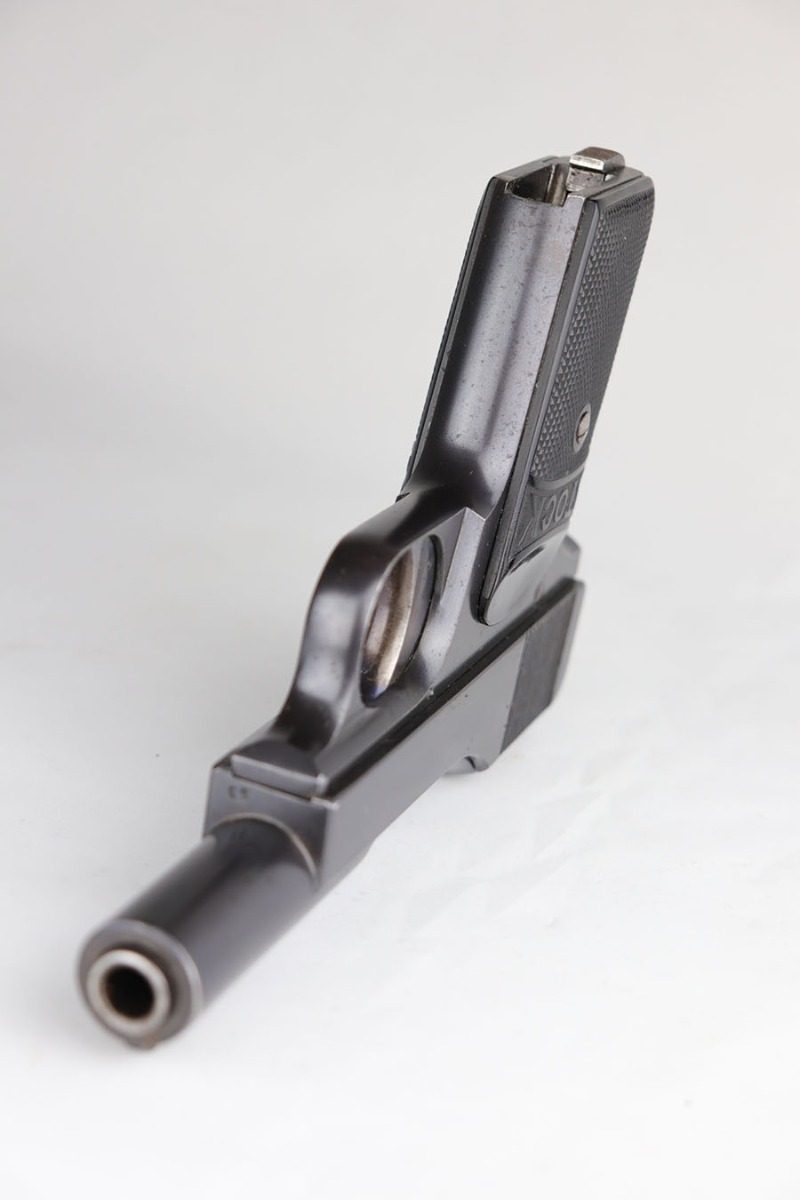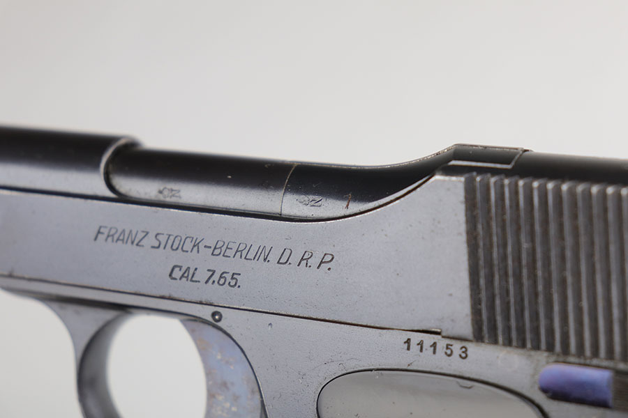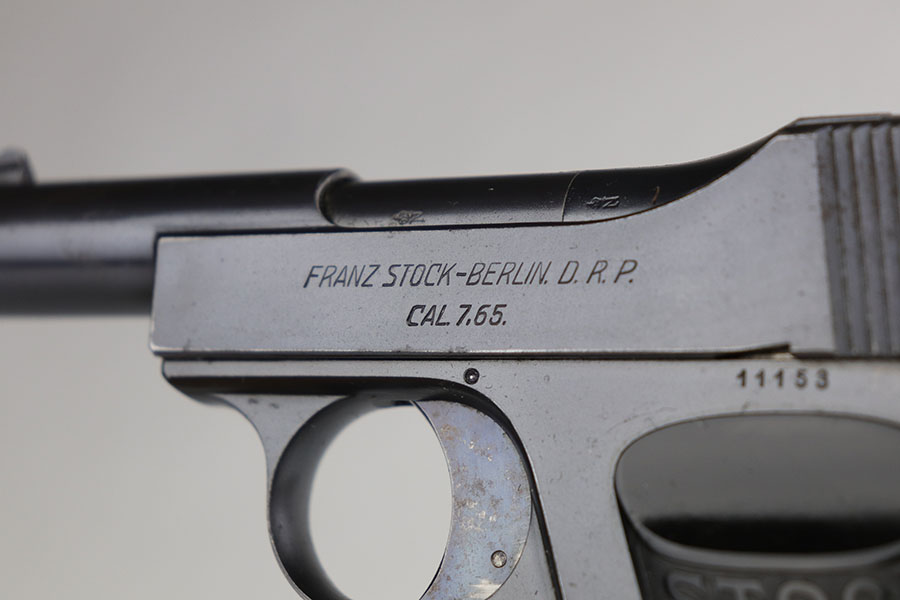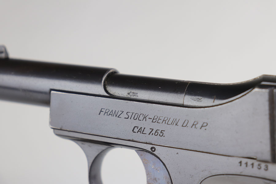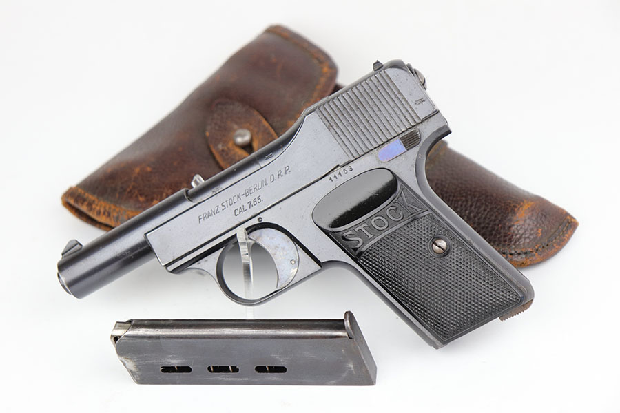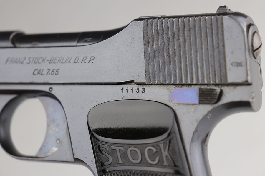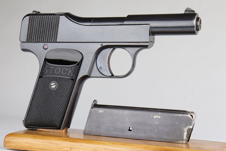 6/25/20 – The Franz Stock pistol was manufactured by a German company Franz Stock Maschinenbau und Werkzeugfabrik in 1921-1932. It was an improved version of Becker & Hollander Beholla pistol. Franz Stock pistols were expensive but due to very high quality they received notoriety as sporting pistols. The only government service of Franz Stock pistols were in Berlin police and Austrian custom service. The main version of this pistol was in .32 caliber; a .25 version was also manufactured in 1923-1925. About 45,000 pistols of both versions were manufactured. This is a Type 1, and only 25,000 of this variant were made. This one has minty original finish with hardly any bluing loss, but a few areas of oxidation. Crown/N proofs on barrel and slide. Excellent original grips. Bore has strong rifling but some freckling in the grooves. Comes with a pebble grain holster that has some obvious wear but no holsters or tears, and is unmarked.