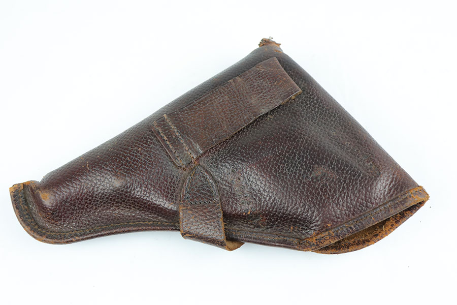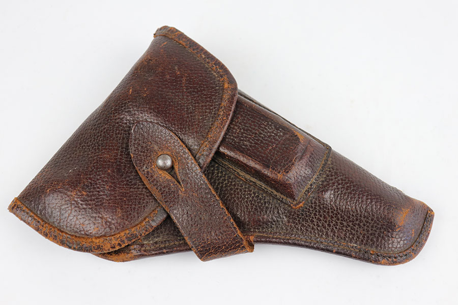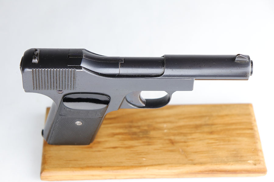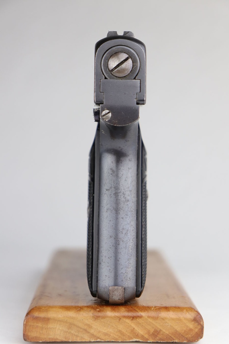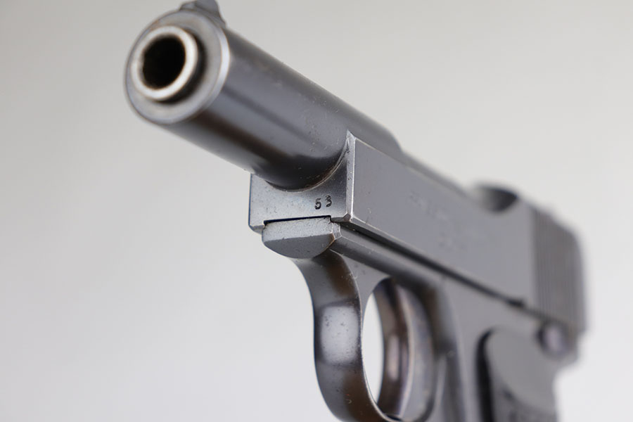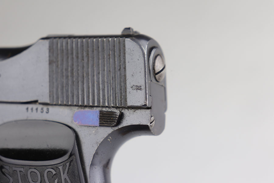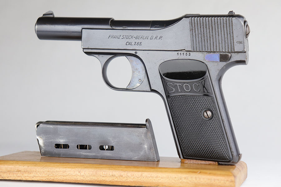 6/25/20 – The Franz Stock pistol was manufactured by a German company Franz Stock Maschinenbau und Werkzeugfabrik in 1921-1932. It was an improved version of Becker & Hollander Beholla pistol. Franz Stock pistols were expensive but due to very high quality they received notoriety as sporting pistols. The only government service of Franz Stock pistols were in Berlin police and Austrian custom service. The main version of this pistol was in .32 caliber; a .25 version was also manufactured in 1923-1925. About 45,000 pistols of both versions were manufactured. This is a Type 1, and only 25,000 of this variant were made. This one has minty original finish with hardly any bluing loss, but a few areas of oxidation. Crown/N proofs on barrel and slide. Excellent original grips. Bore has strong rifling but some freckling in the grooves. Comes with a pebble grain holster that has some obvious wear but no holsters or tears, and is unmarked.