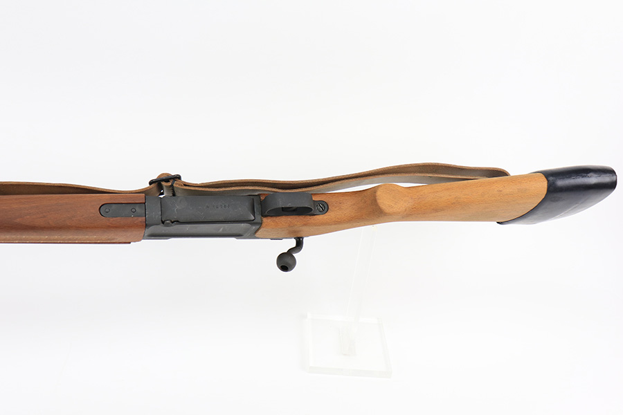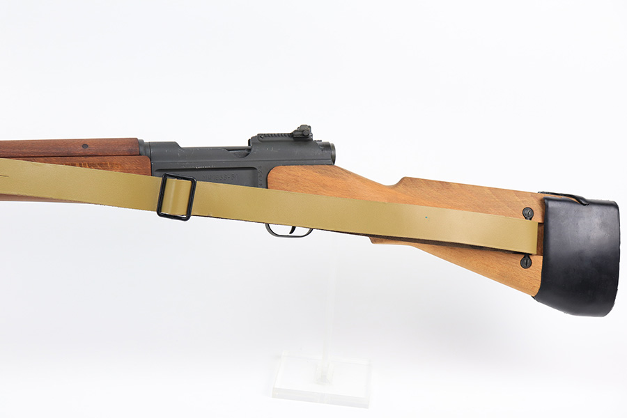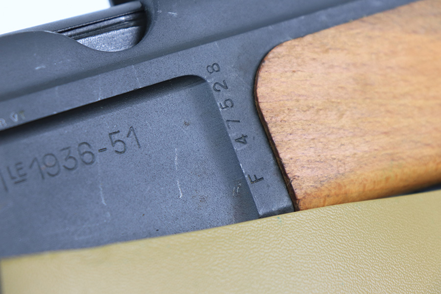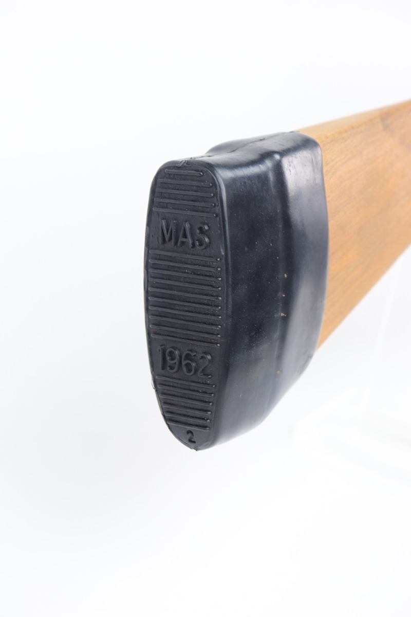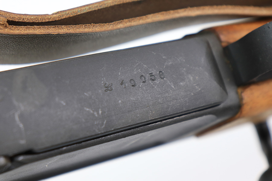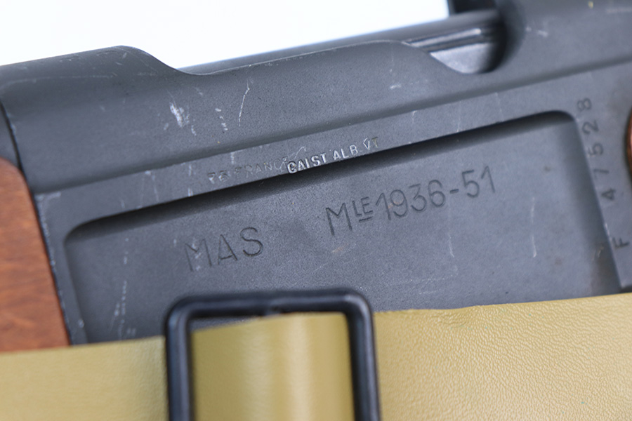 4/29/22 – This is a minty example of a French MAS Model 1936-51 Rifle. The M36-51, successor of the M36, saw service in the First Indochina War, Algerian War and extended into part of the Cold War. Perhaps its most unique feature is its adjustable grenade launcher front sight and assembly around the muzzle. The gun is matching except for the floor plate, and there is a small import mark on the left side of the receiver. The gun comes with a tan leather sling and an original rubber butt pad (tear on the top edge). The gun has retained virtually all of its parkerized finish with some very light surface scuffs on the receiver. The stock is in mint condition. The bore is factory-new.