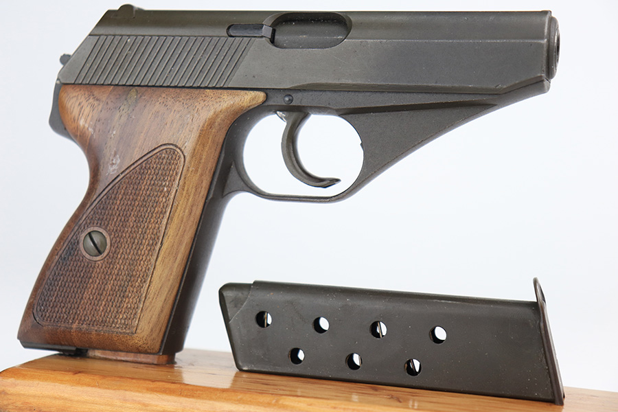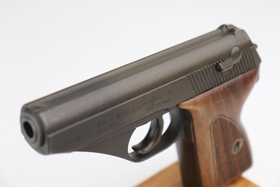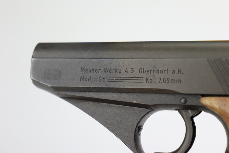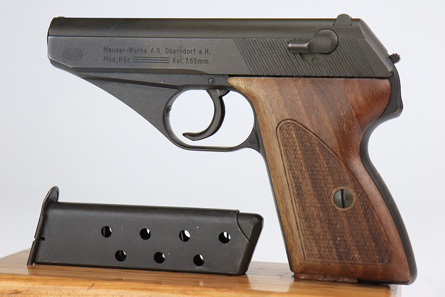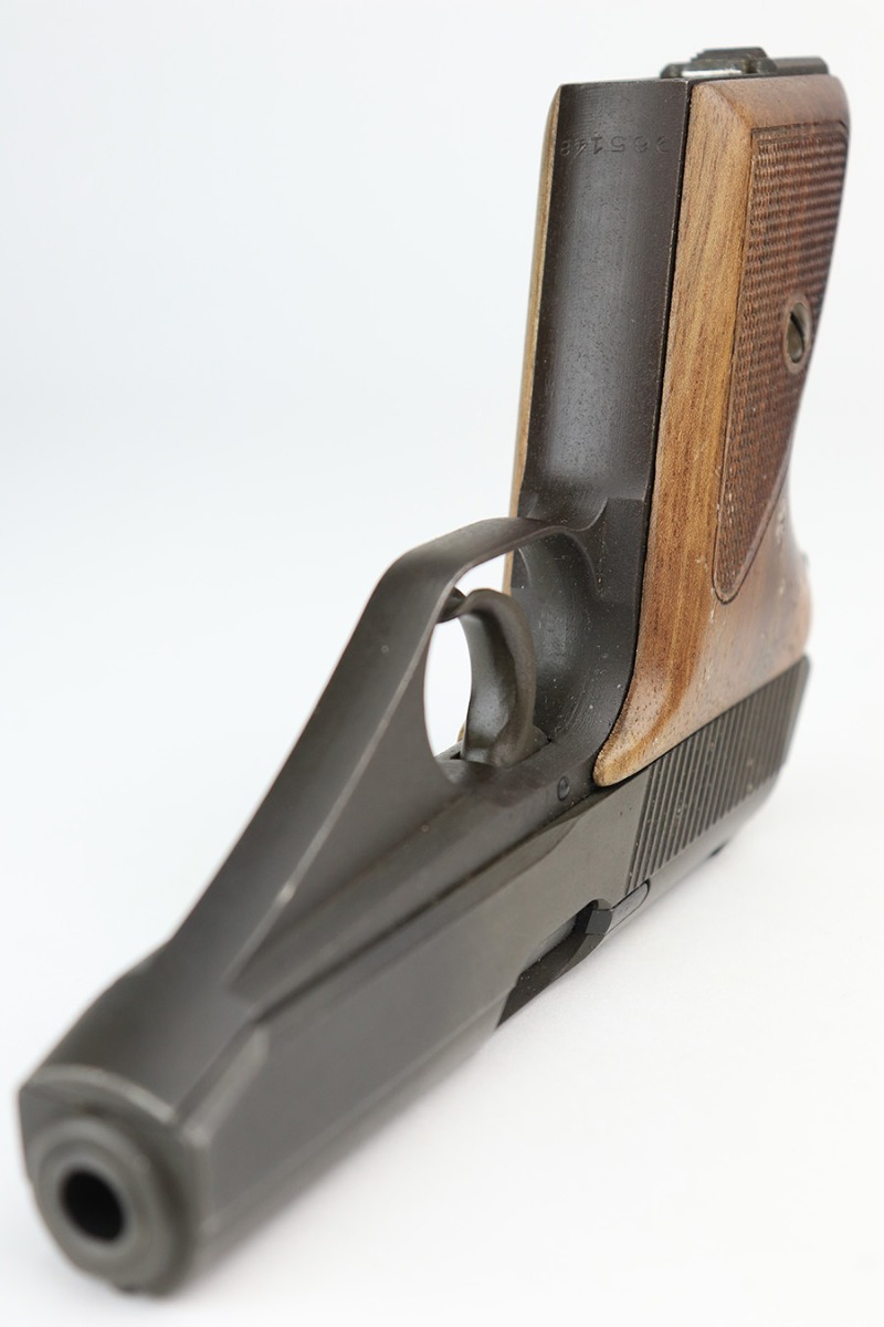 4/13/22 – This is a minty Mauser HSc that was made following the end of World War II in the French Mauser factory. It has 99+% of the phosphate finish remaining, with just a tiny bit of high edge wear. Mint bore. Half-moon magazine. Comes with minty post-war wood grips.