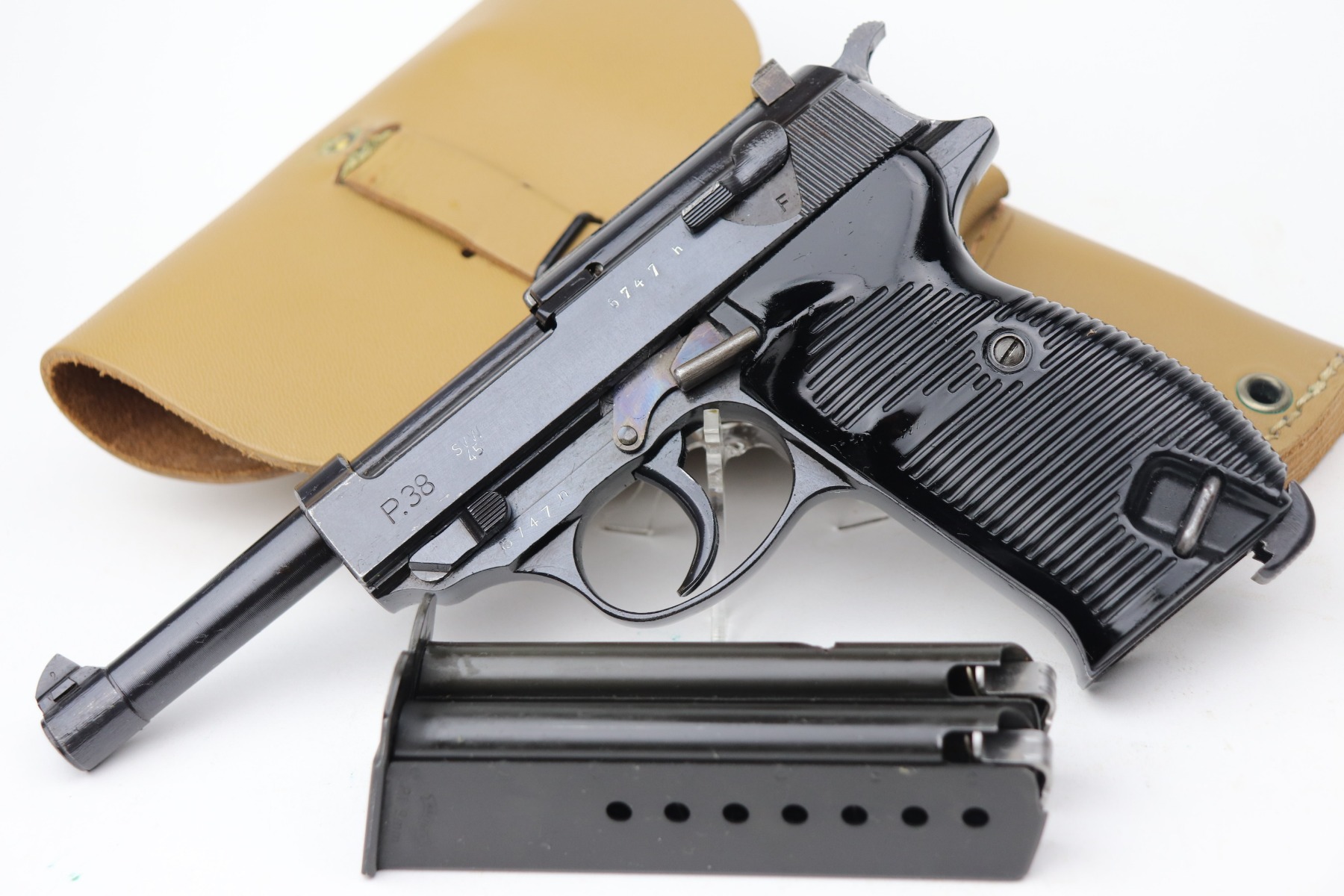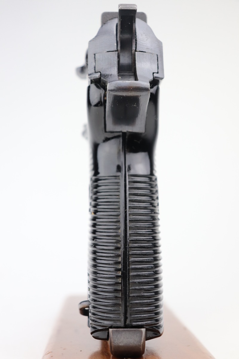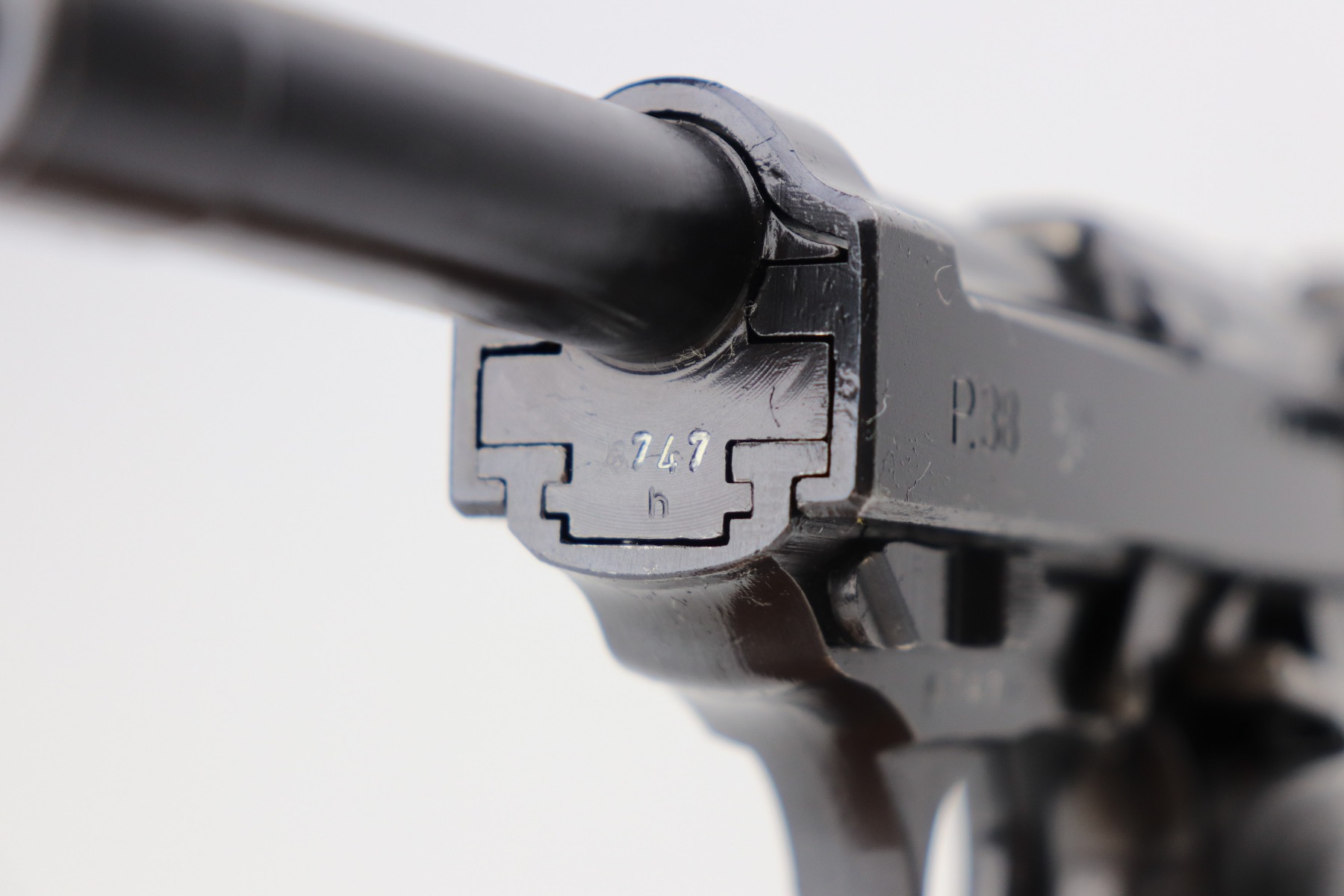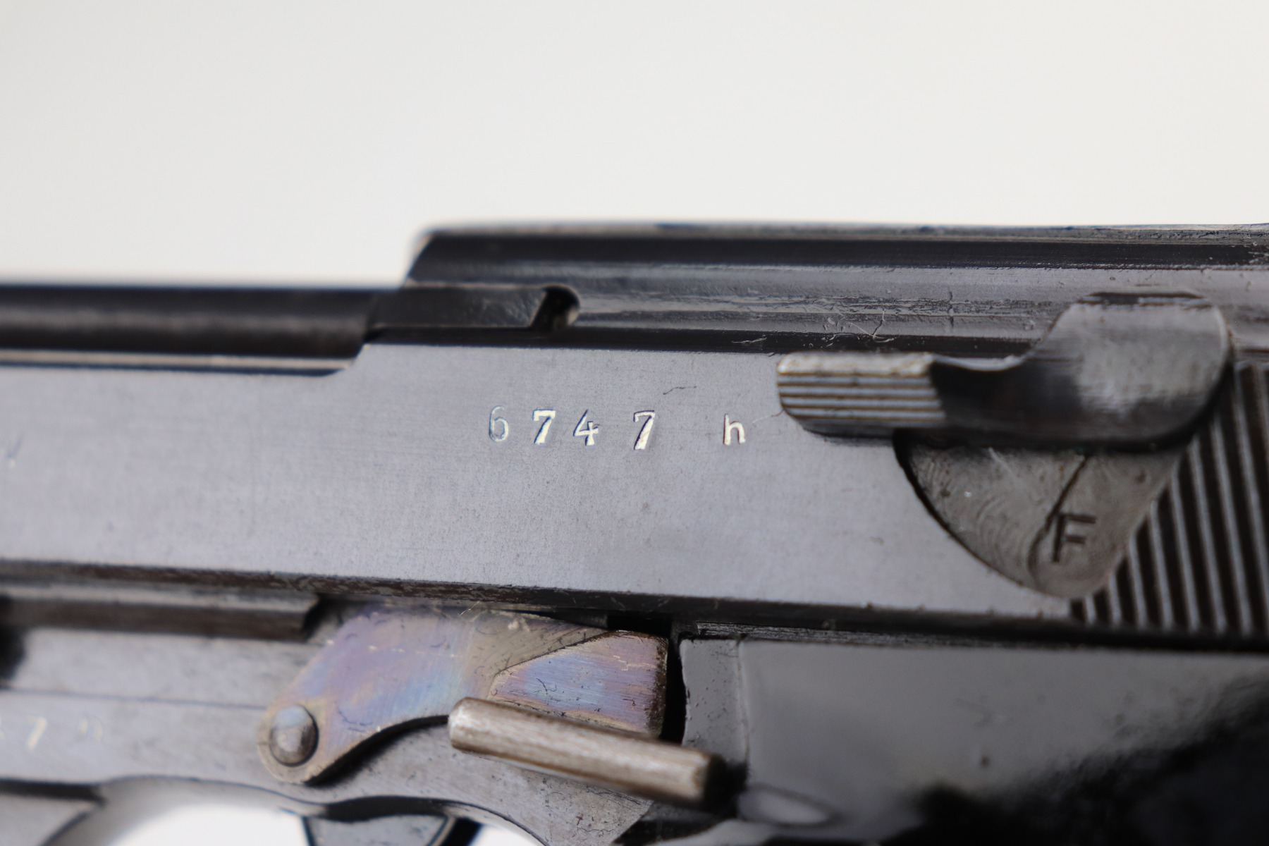 3/4/21 – This is a minty example of a Mauser P.38 assembled by the French shortly after the end of WW2. It has a French star, meaning it was issued to the French military. This one is all matching and has retained almost all of its finish. It was likely arsenal refinished (typical for these guns). The rig comes with a mint French P.38 holster and two post-WW2 magazines. Excellent grips. The bore is mint. De-cocker is functional.