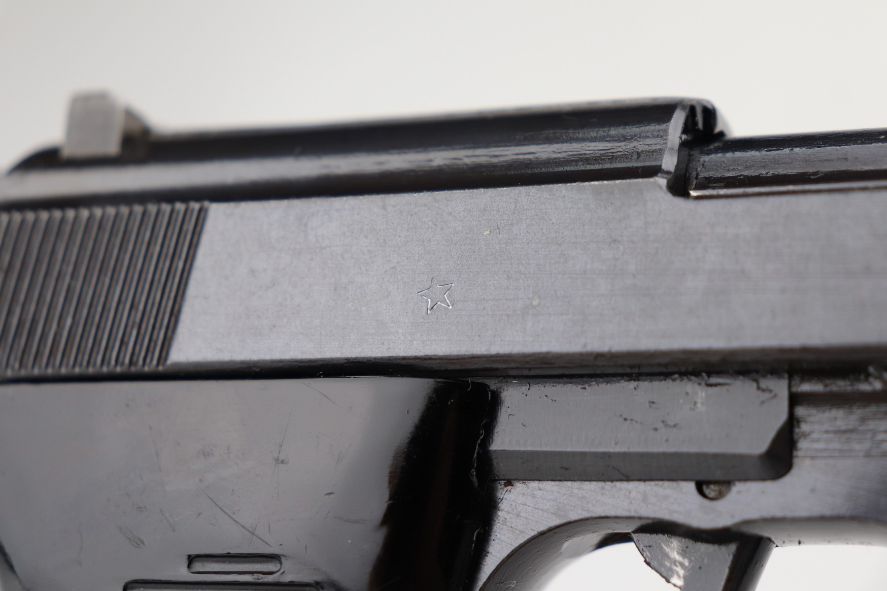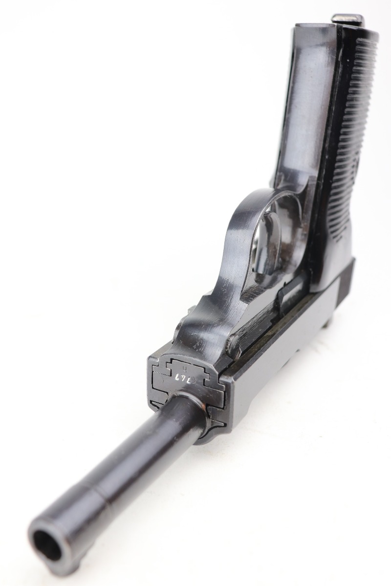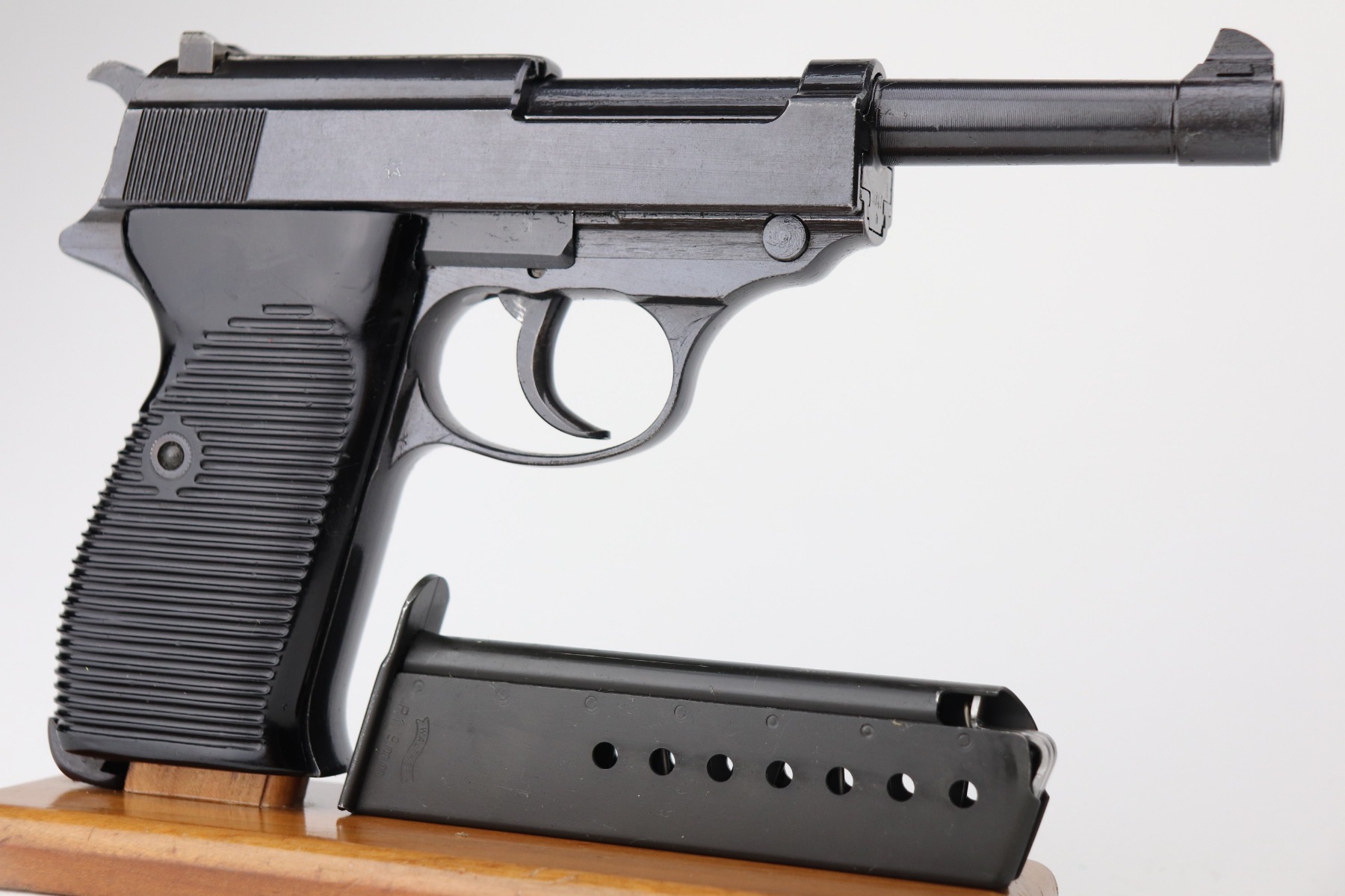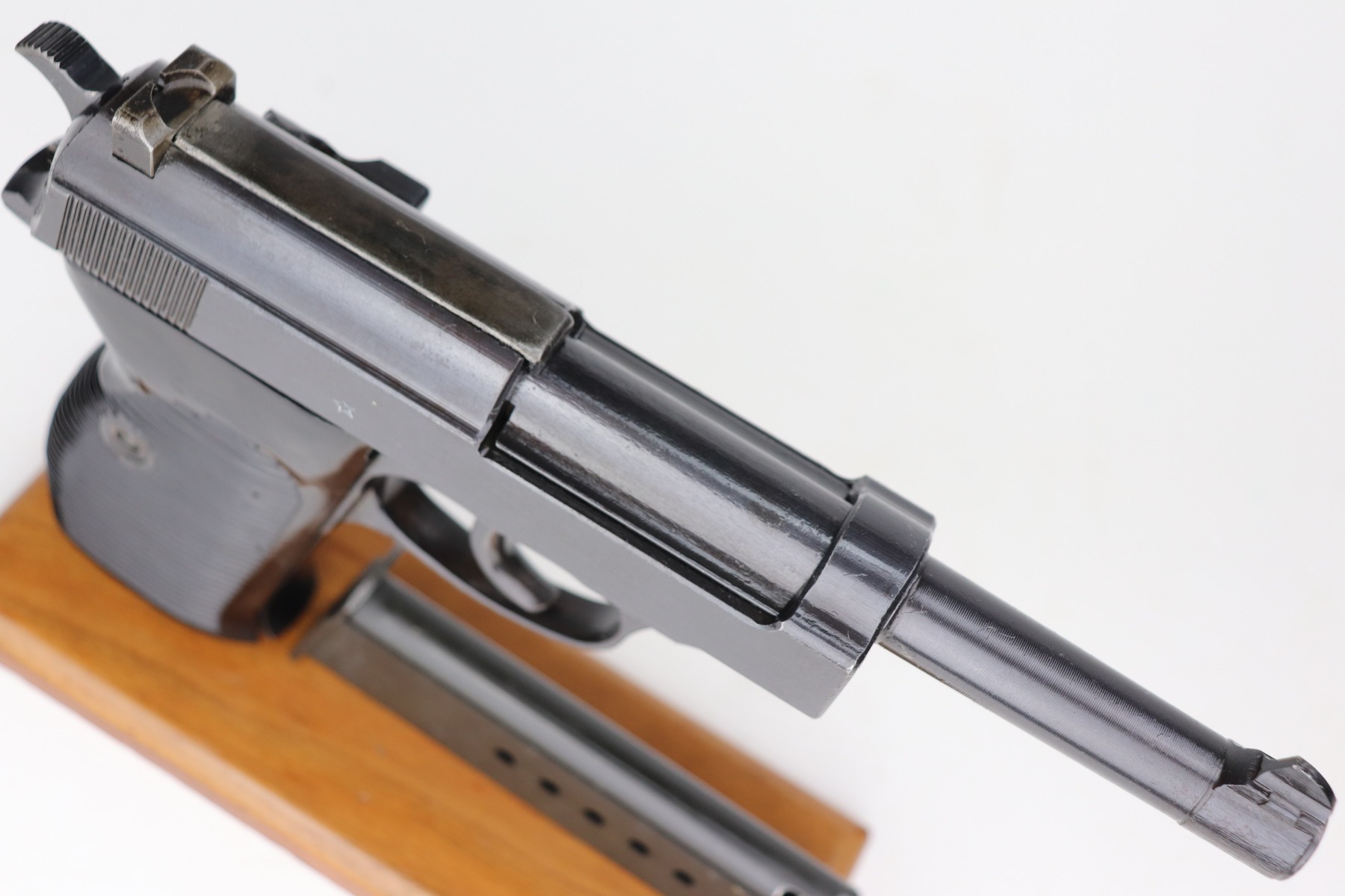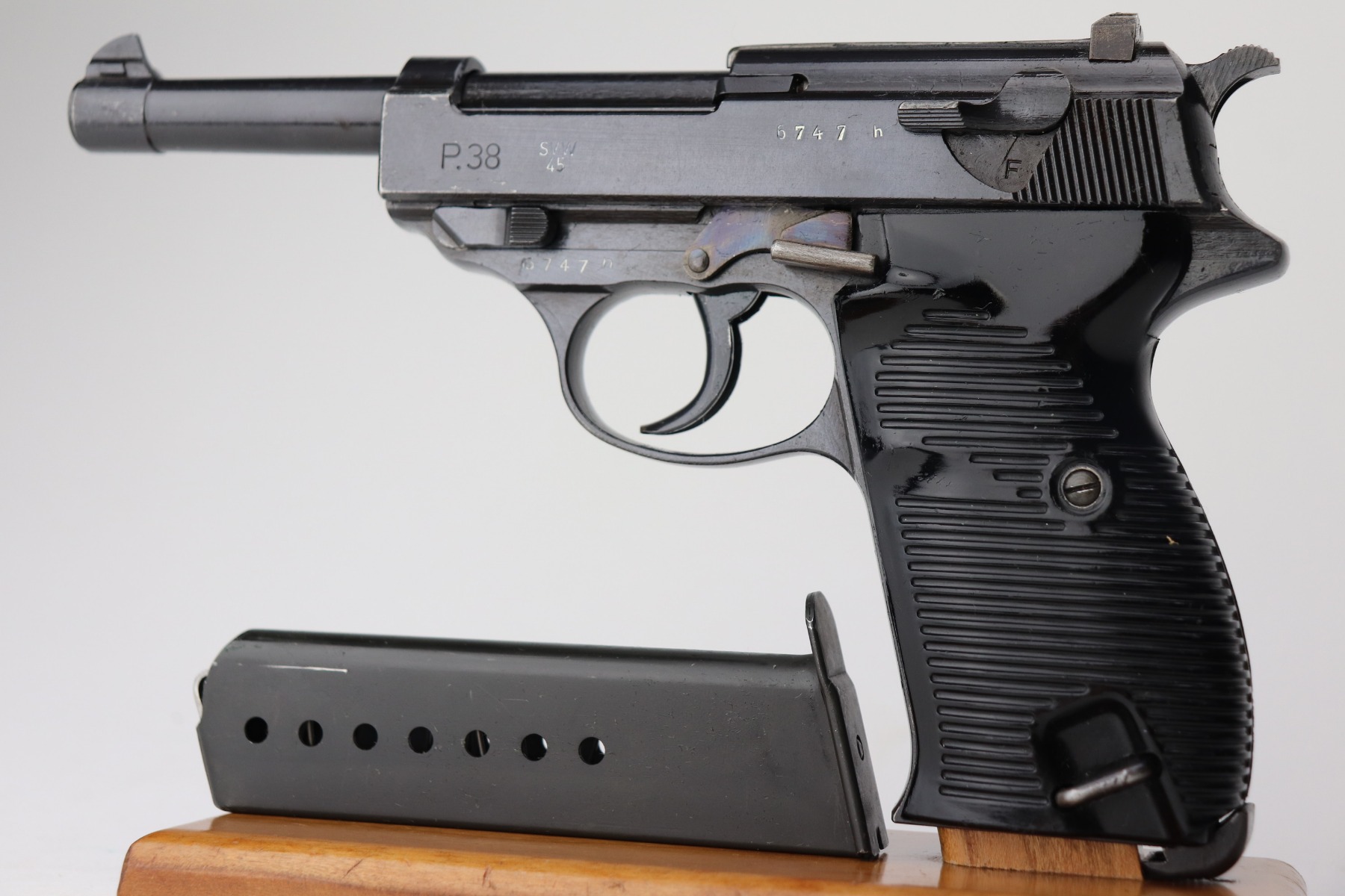 3/4/21 – This is a minty example of a Mauser P.38 assembled by the French shortly after the end of WW2. It has a French star, meaning it was issued to the French military. This one is all matching and has retained almost all of its finish. It was likely arsenal refinished (typical for these guns). The rig comes with a mint French P.38 holster and two post-WW2 magazines. Excellent grips. The bore is mint. De-cocker is functional.