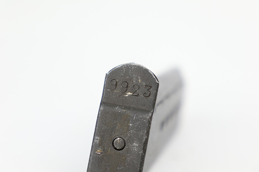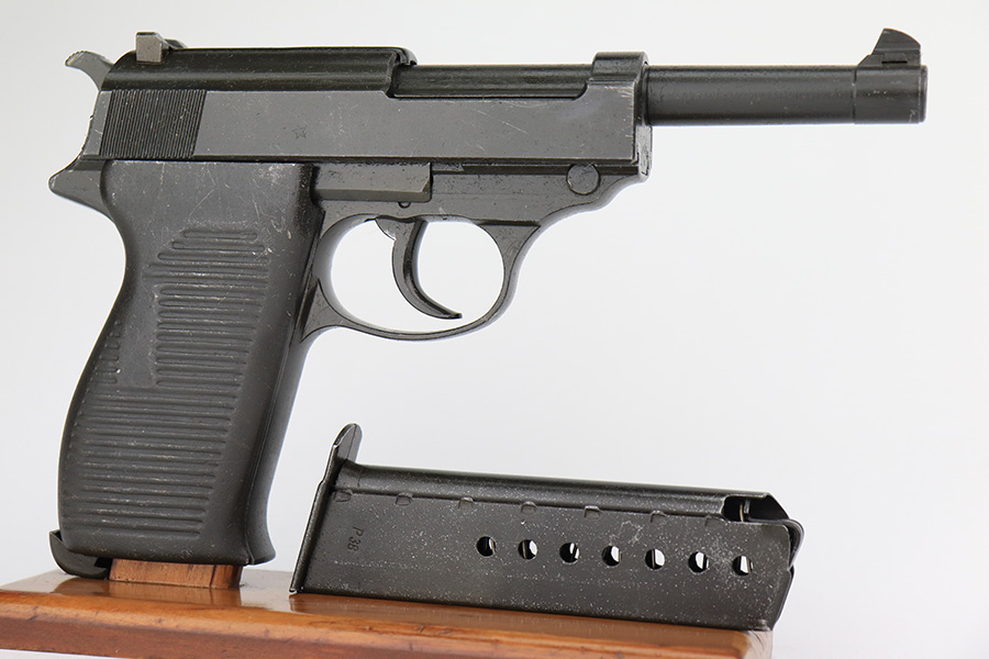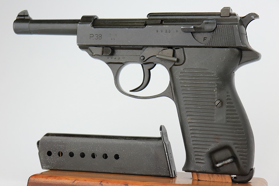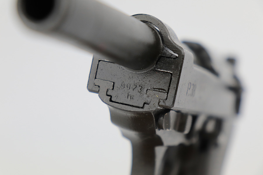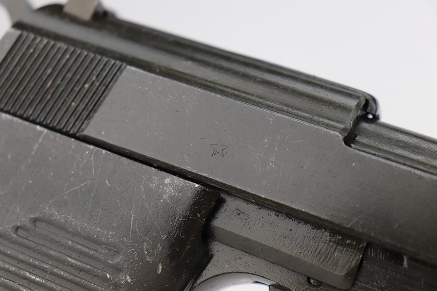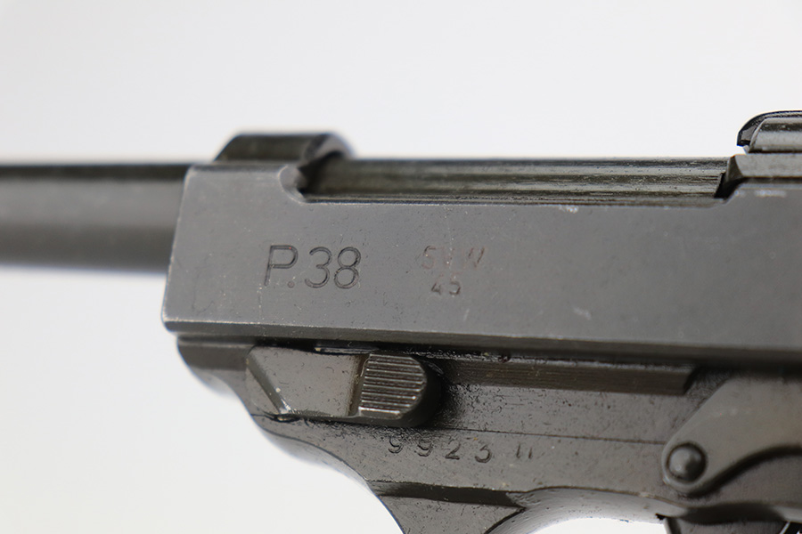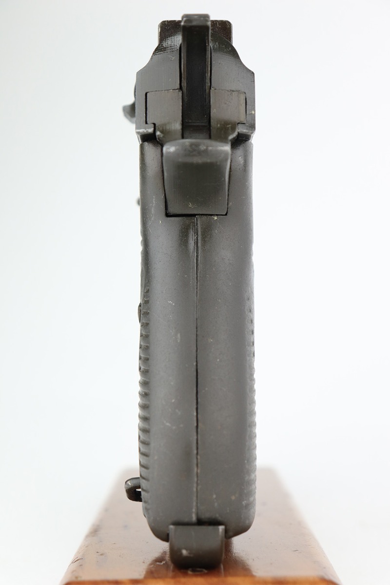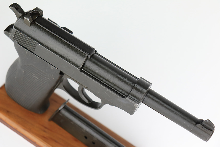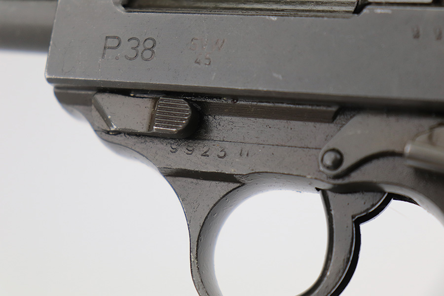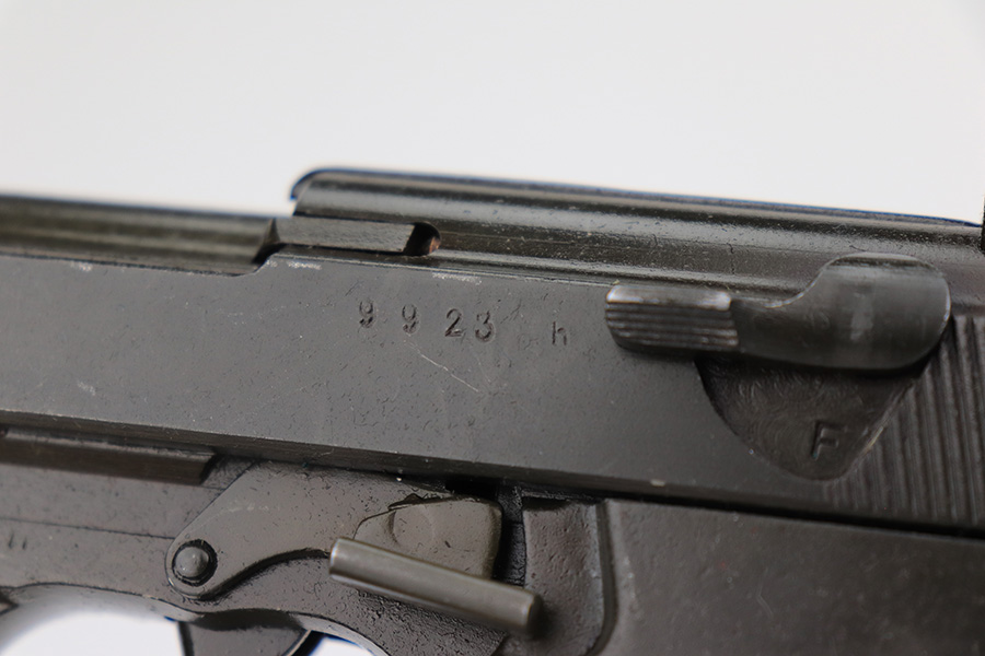 3/27/23 – This is a minty example of a Mauser P.38 put together by the French using leftover Nazi parts immediately after WW2. It is all matching, has a French star proof on the right side of the slide, and has a “Waffen 135” Nazi proof on the barrel. No import marks. It is fitted with French “grey ghost” grips and has retained virtually all of its phosphate finish – just a few very light scuffs here and there. Comes with a matching post-factory numbered magazine. Mint bore. De-cocker is functional.