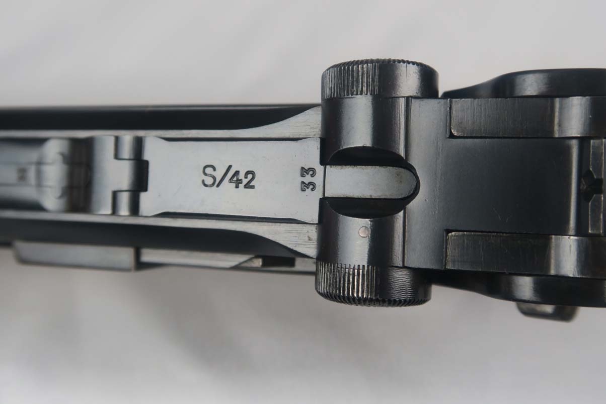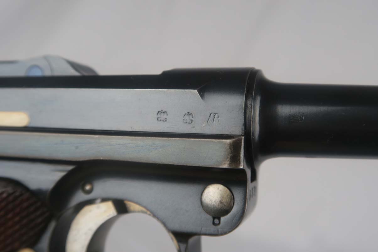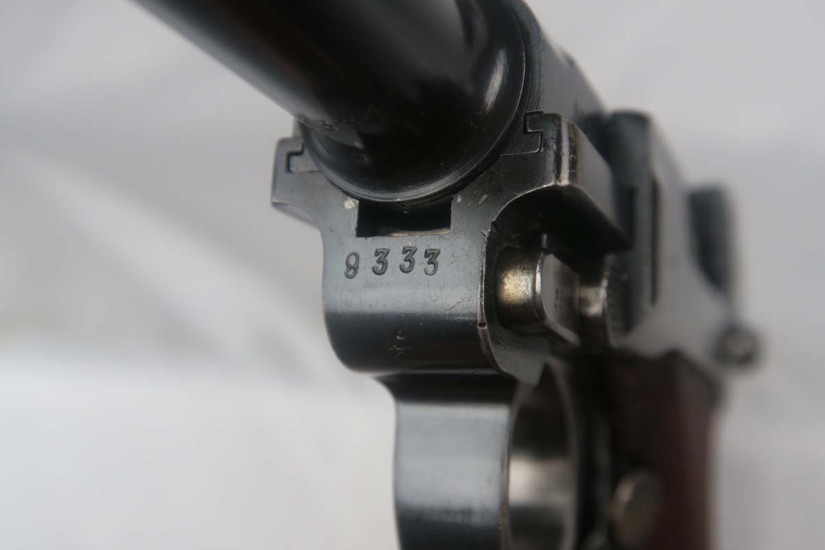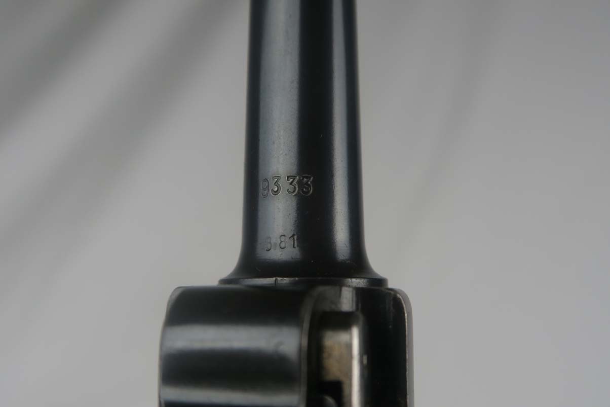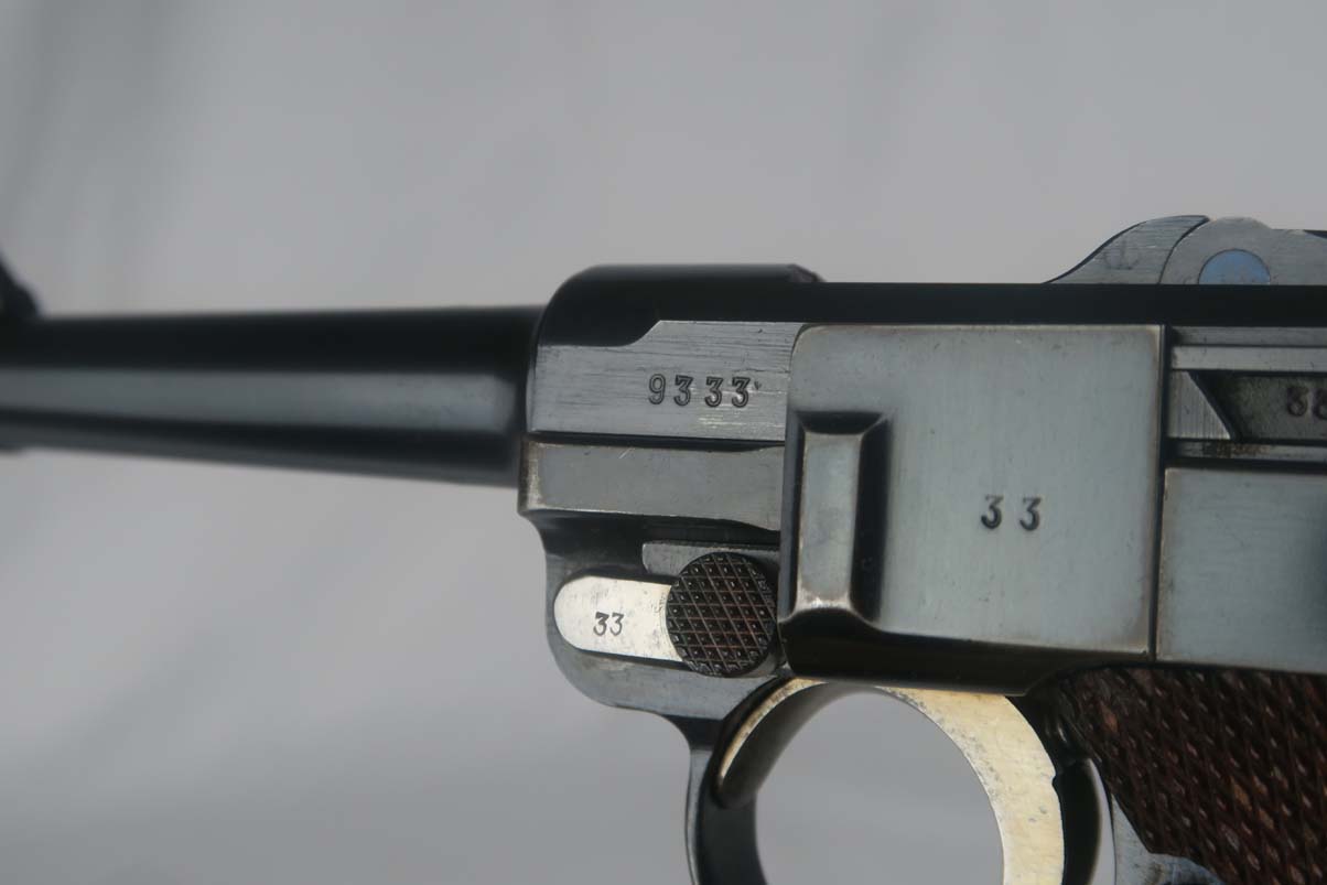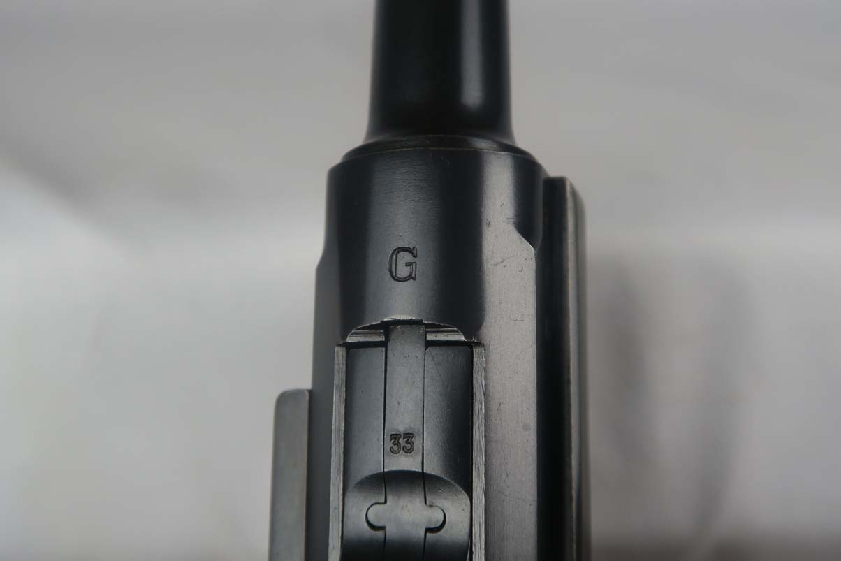 6/8/17 – This is an excellent G Date Mauser luger from 1935, the second year of production at Mauser factory.  The original finish rates at about 98%, with the most notable wear on the stock lug.  All small parts are numbered and matching, including the grips but not the magazine.  The magazine is a G date mag (droop wing E/63) but is numbered to a different gun.  Nice straw is thinning but still visible.  Bore has good rifling and no frosting or pitting.