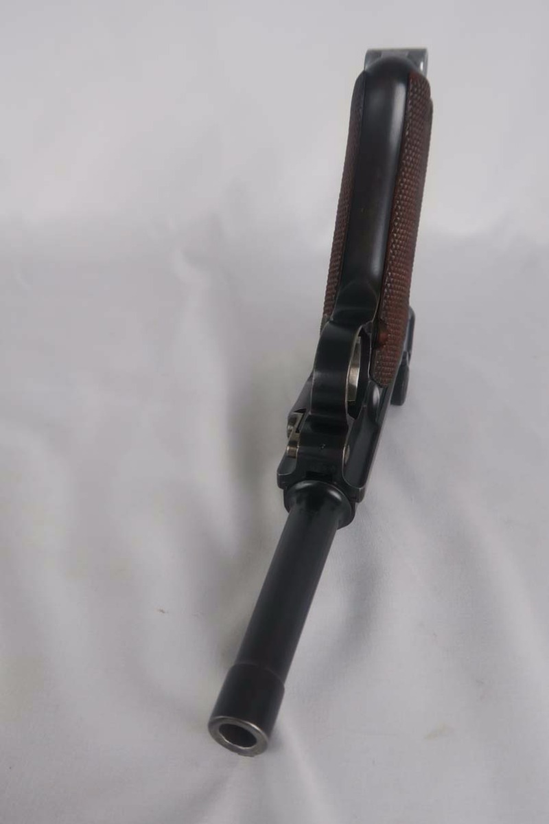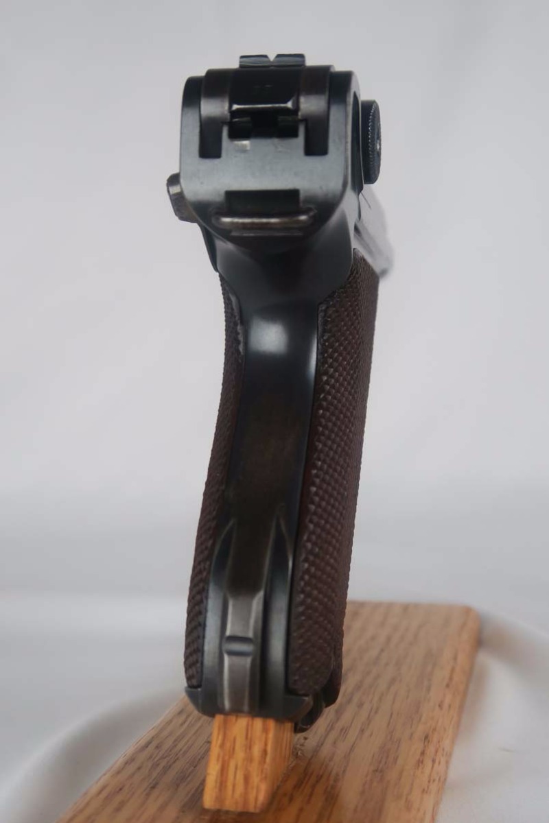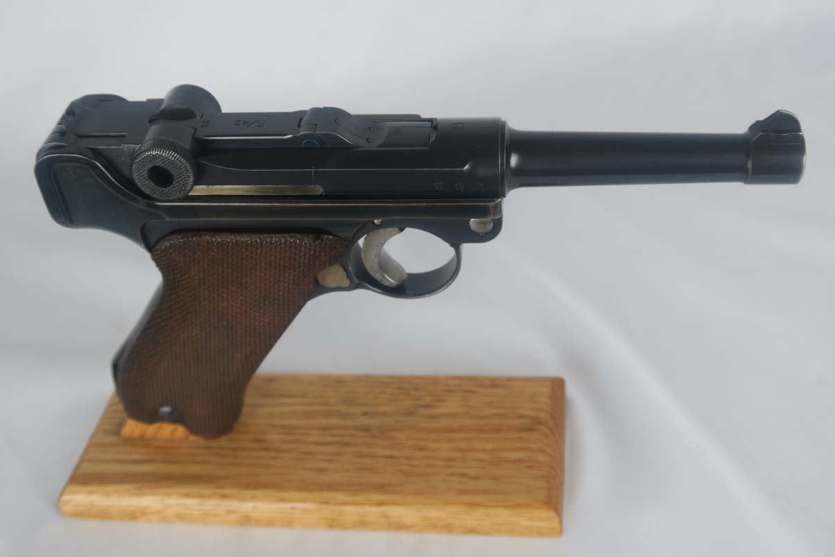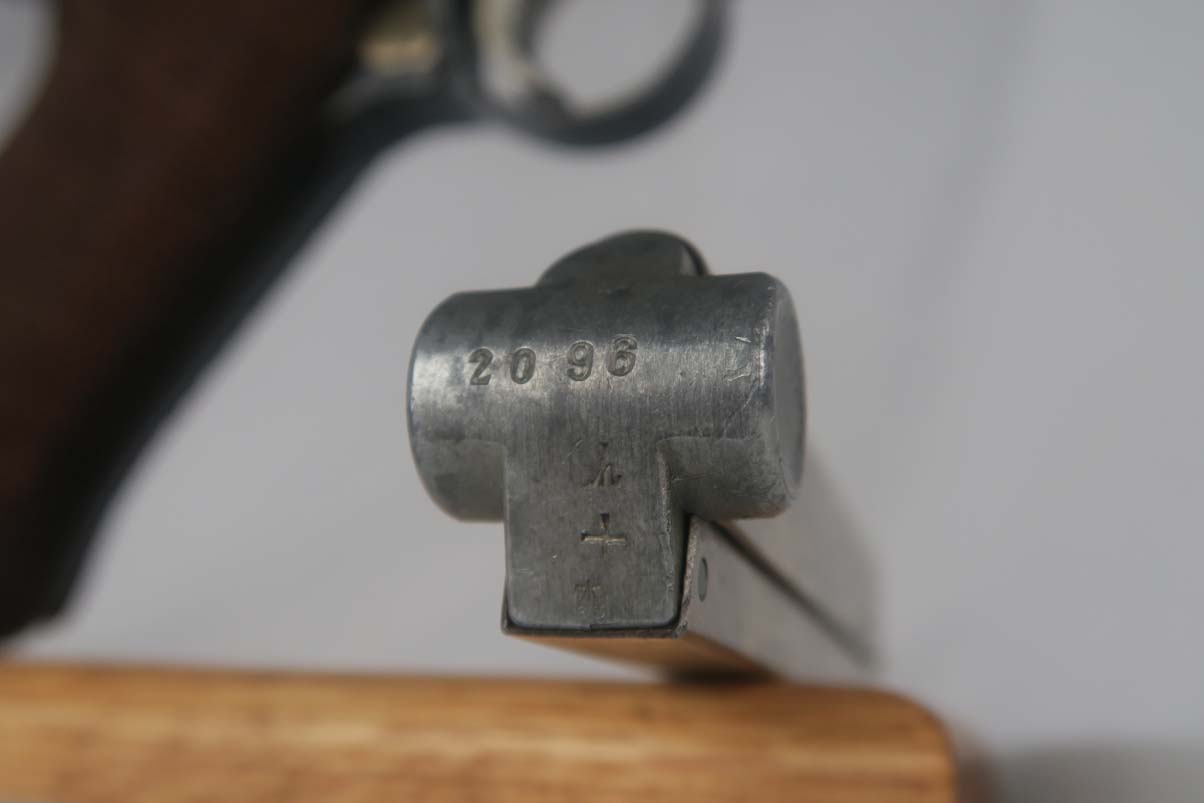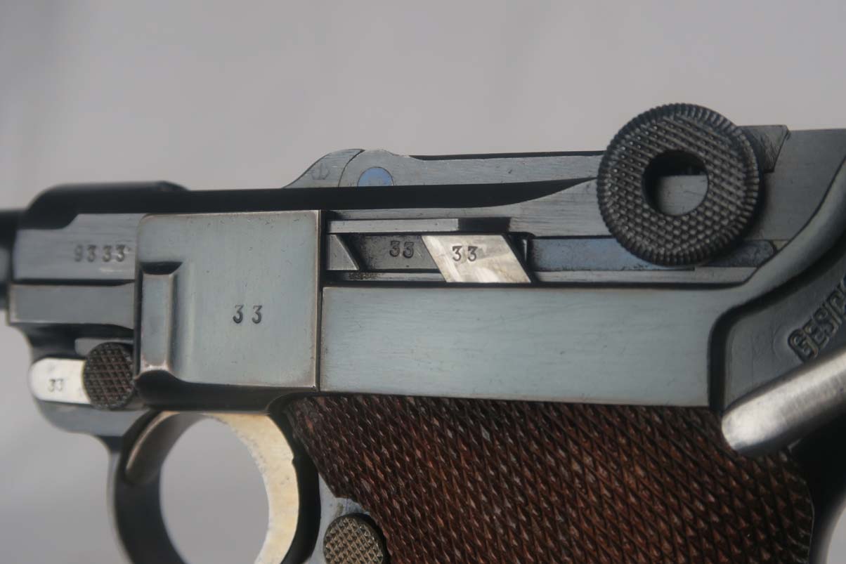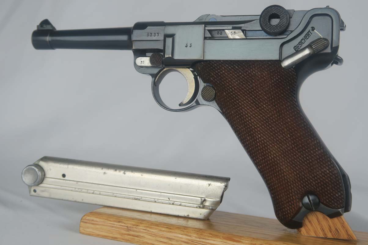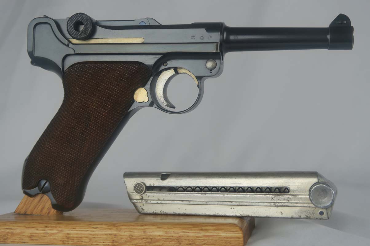 6/8/17 – This is an excellent G Date Mauser luger from 1935, the second year of production at Mauser factory.  The original finish rates at about 98%, with the most notable wear on the stock lug.  All small parts are numbered and matching, including the grips but not the magazine.  The magazine is a G date mag (droop wing E/63) but is numbered to a different gun.  Nice straw is thinning but still visible.  Bore has good rifling and no frosting or pitting.