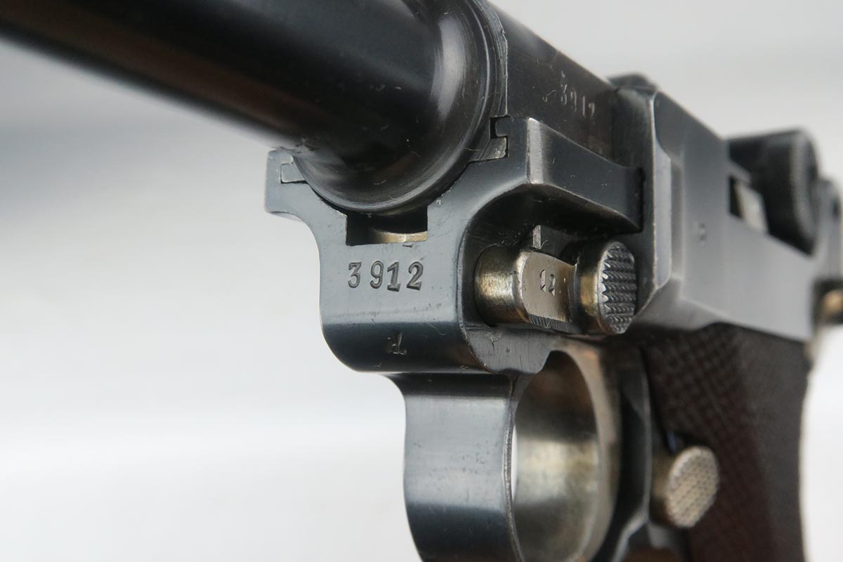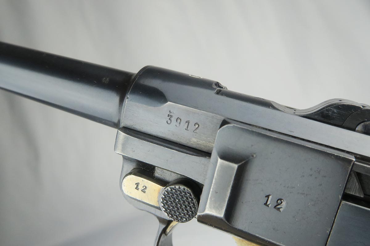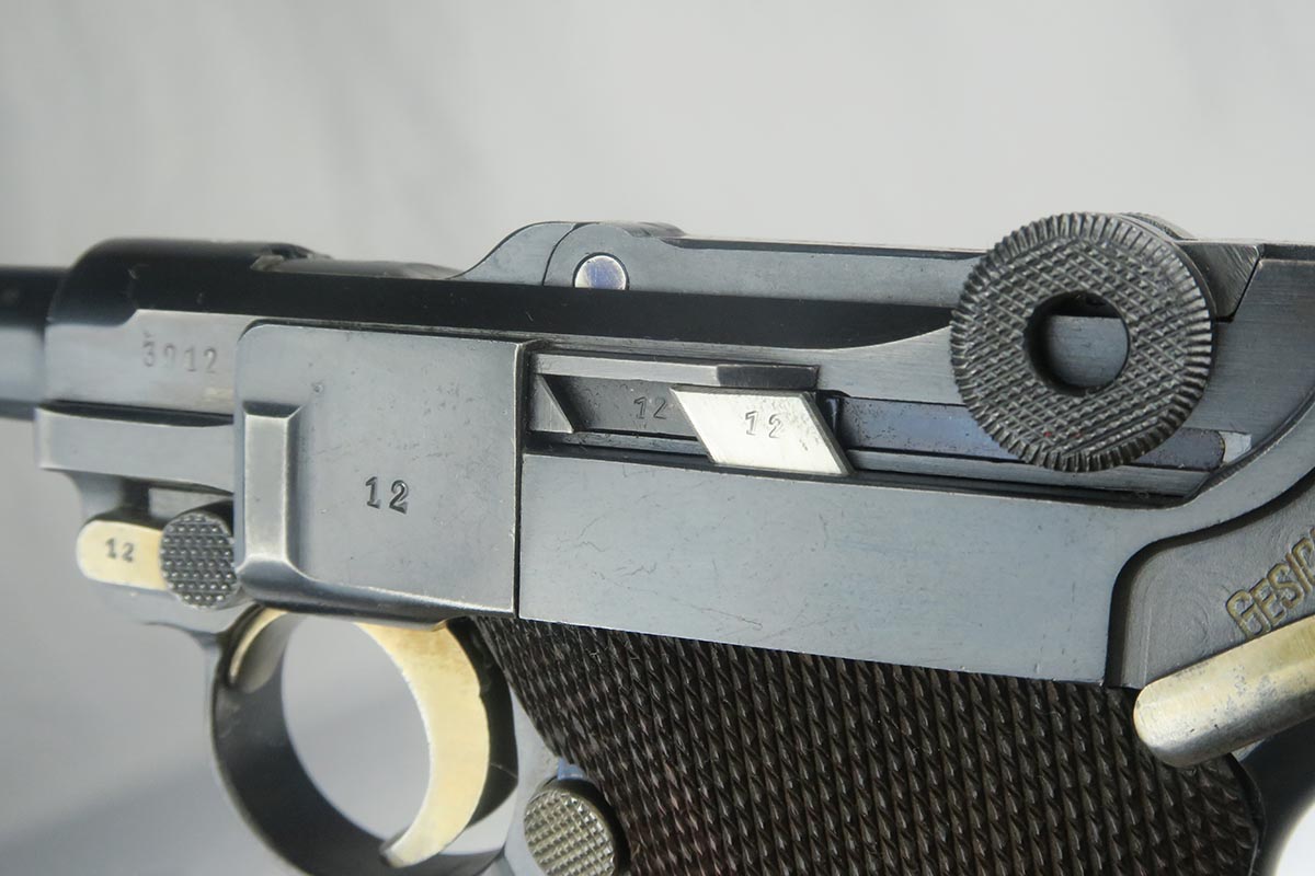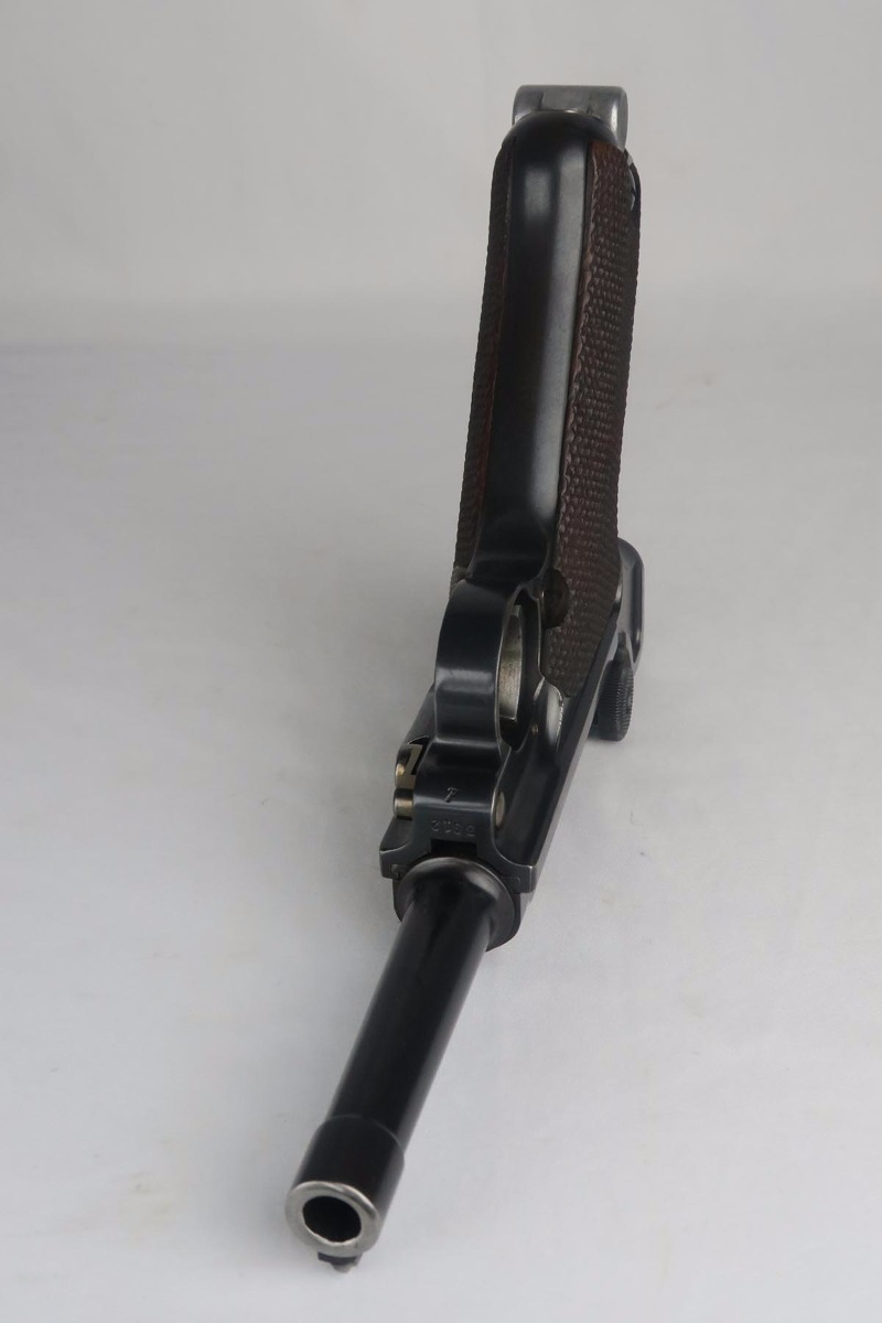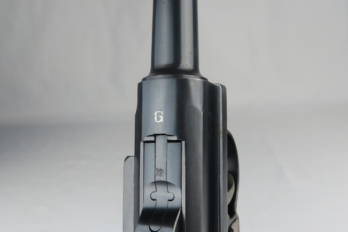 10/25/17 – From my personal collection, this is a 98-99% original finish 1935 “G Date” Luger made by Mauser. All parts, including all small parts and magazine, are matching and original. The grips are not numbered but on G dates it is common that about half are not numbered. However, from the fit, I am confident that these are the original grips. The straw color small parts are also about 90% finished. There are minor halos around the serial on the bottom of the barrel and the ejector indicating that this gun was NOT refinished or restored. It has a shiny, strong bore as would be expected in a gun this nice. Mechanically it seems to be in excellent working order.