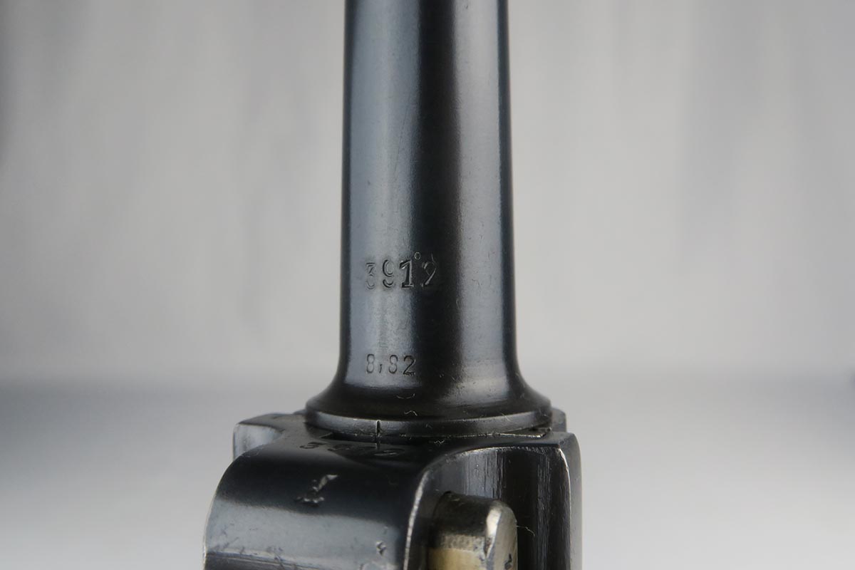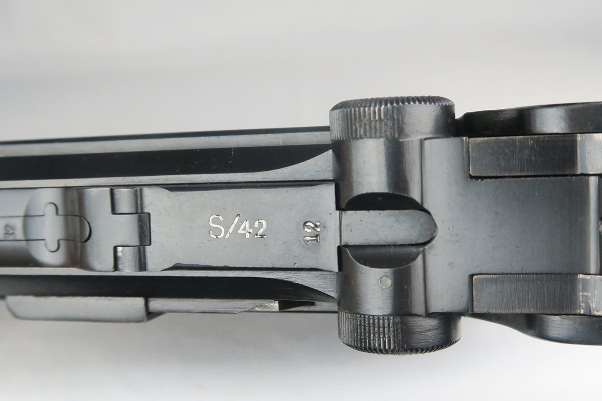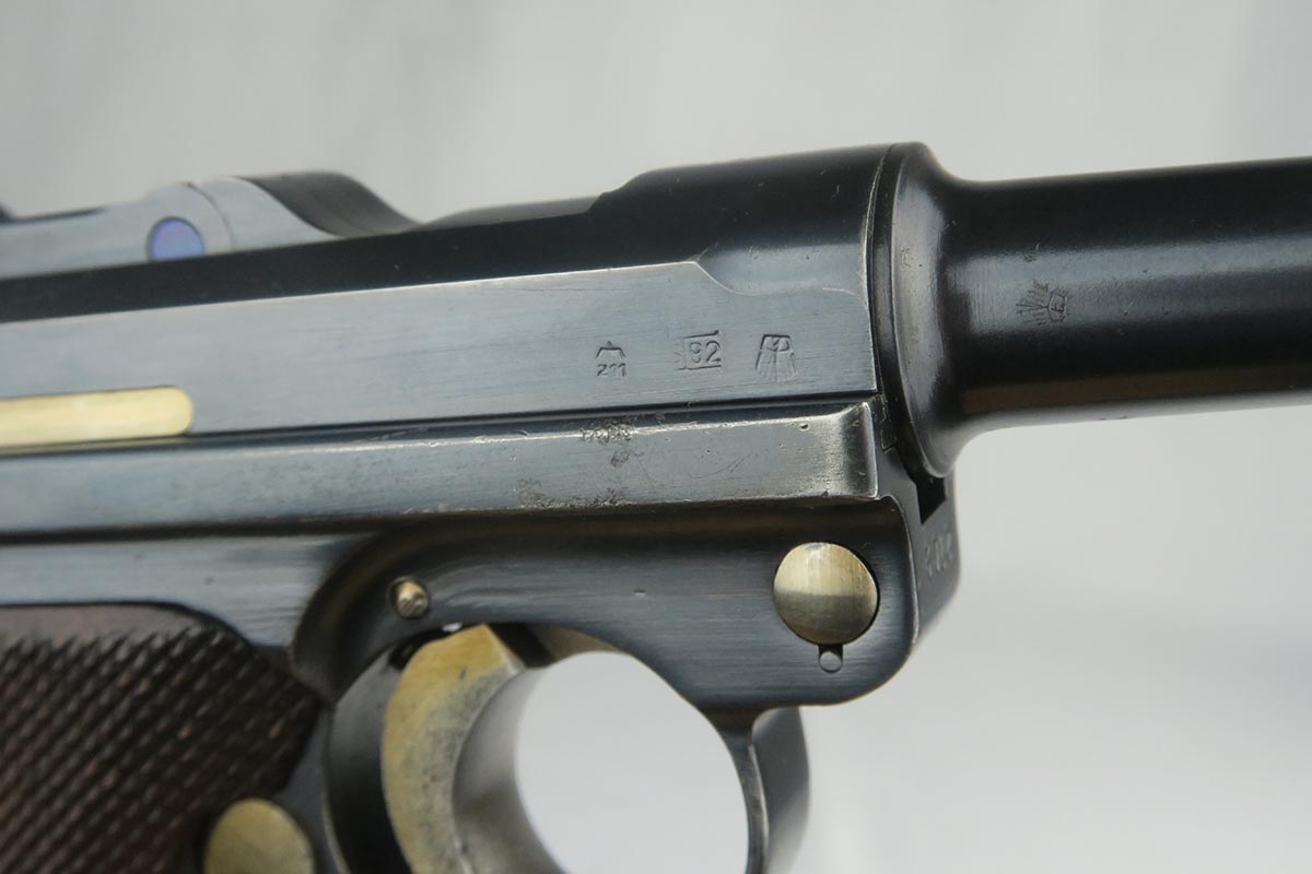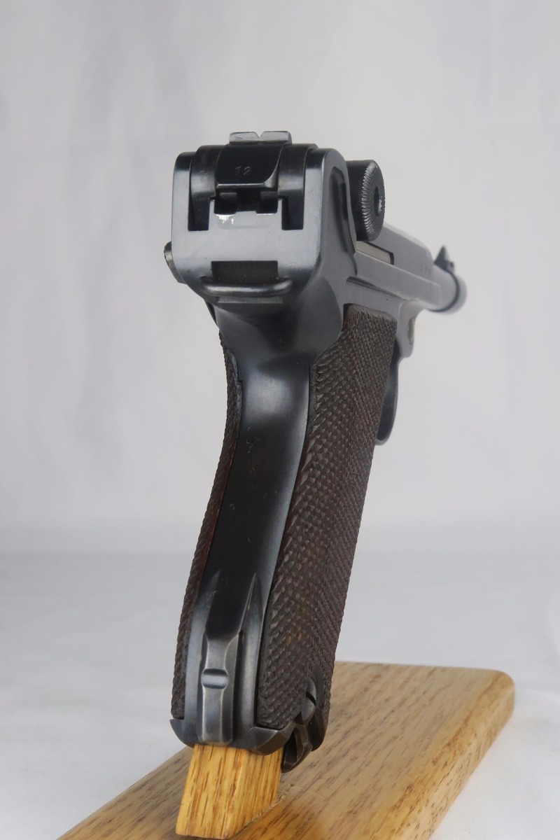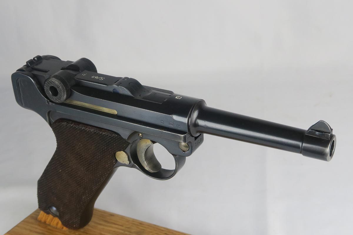 10/25/17 – From my personal collection, this is a 98-99% original finish 1935 “G Date” Luger made by Mauser. All parts, including all small parts and magazine, are matching and original. The grips are not numbered but on G dates it is common that about half are not numbered. However, from the fit, I am confident that these are the original grips. The straw color small parts are also about 90% finished. There are minor halos around the serial on the bottom of the barrel and the ejector indicating that this gun was NOT refinished or restored. It has a shiny, strong bore as would be expected in a gun this nice. Mechanically it seems to be in excellent working order.