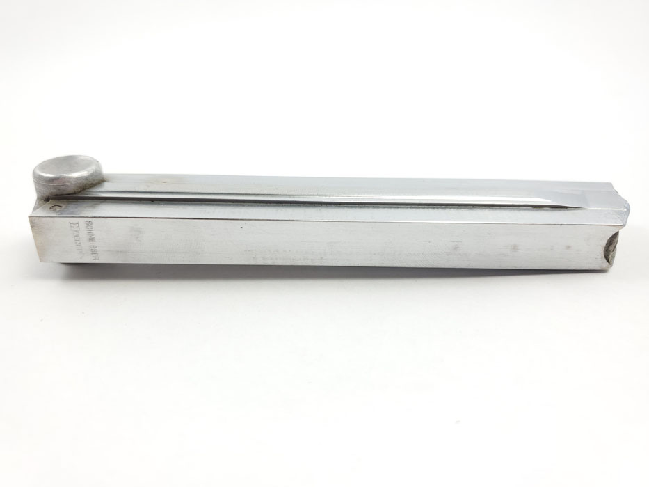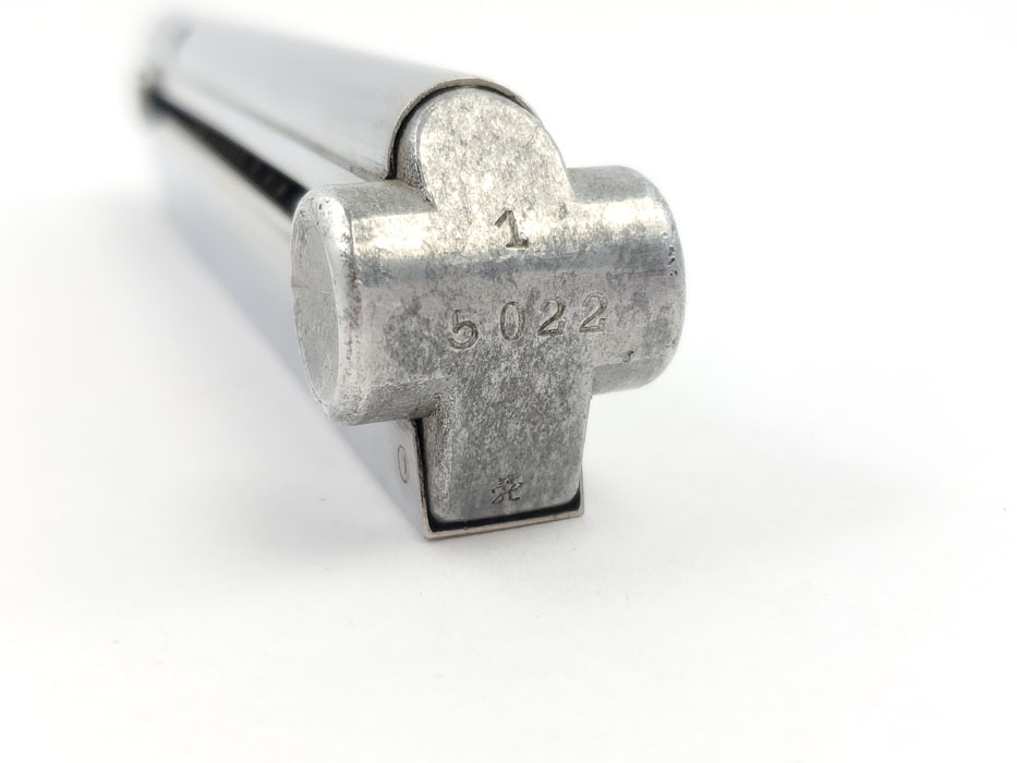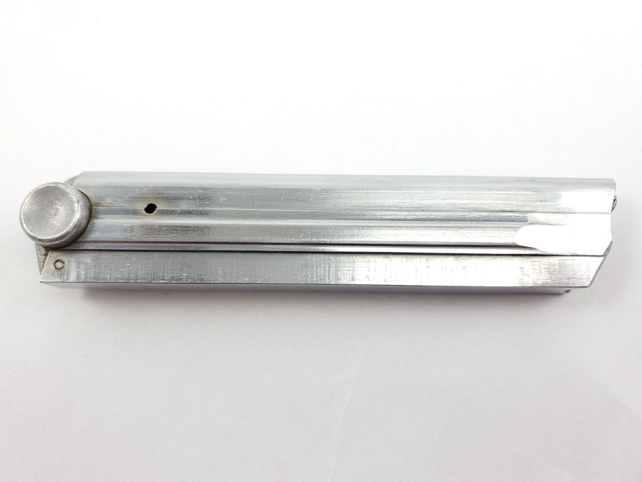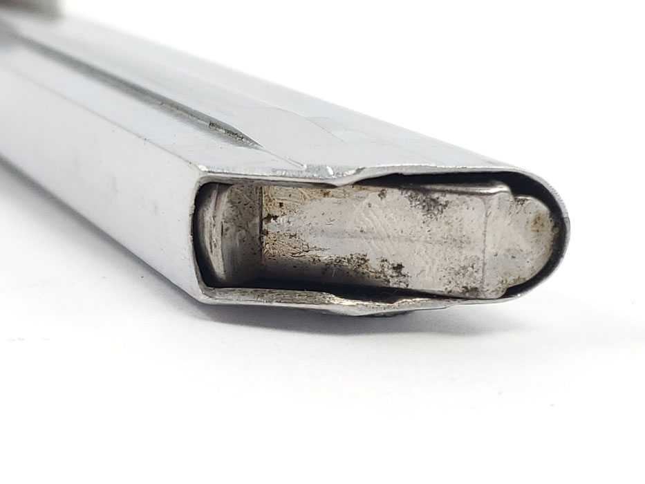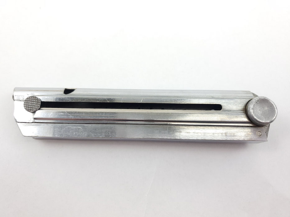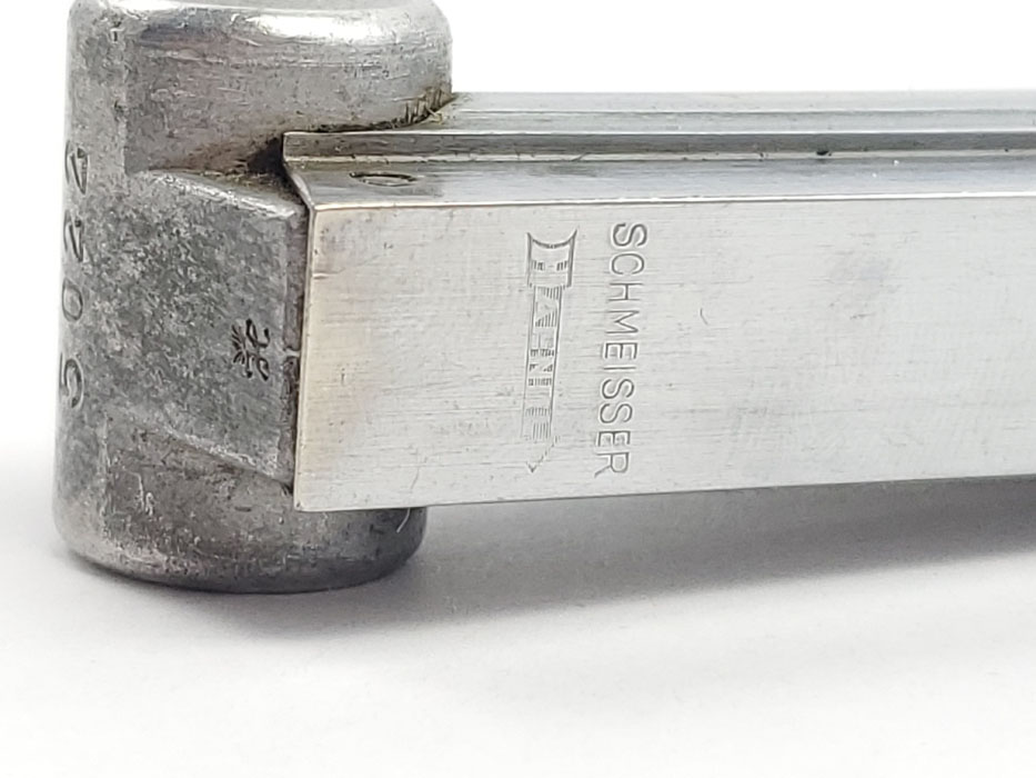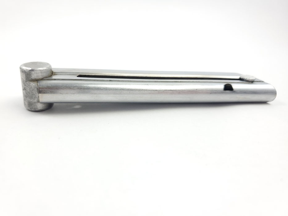 4/13/20 – This is an original Haenel police luger magazine from WW2. The magazine is maker stamped on the spine “Haenel Schmeisser”. The aluminum base is stamped “1” meaning this the main magazine, “5022” serial number and crown/H police stamped by Haenel. The frame is minty and nearly flawless, as is the strong spring. A beautiful and desirable police luger magazine.