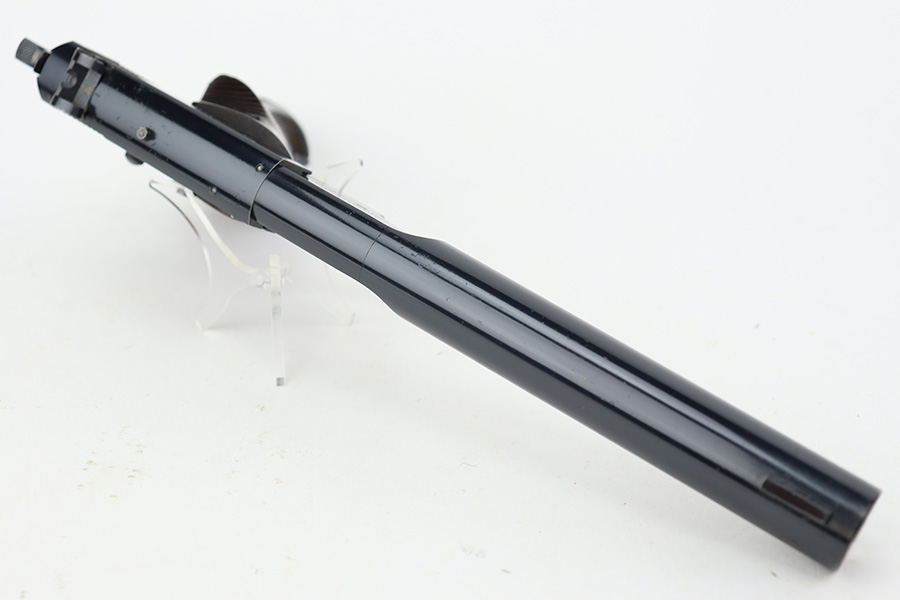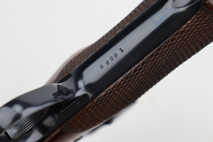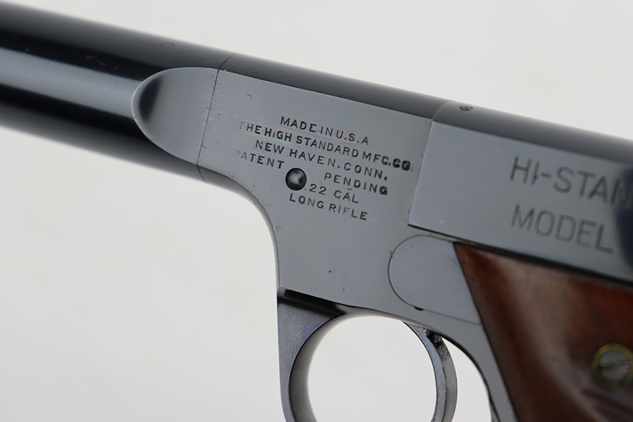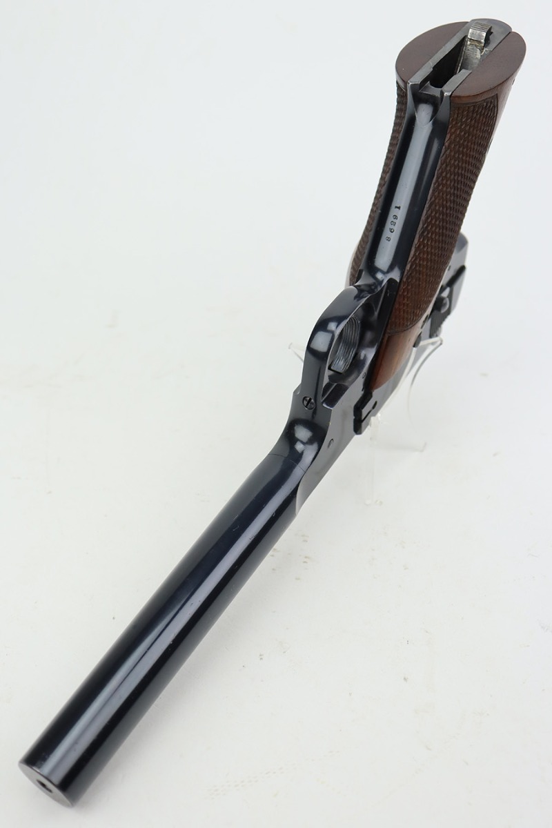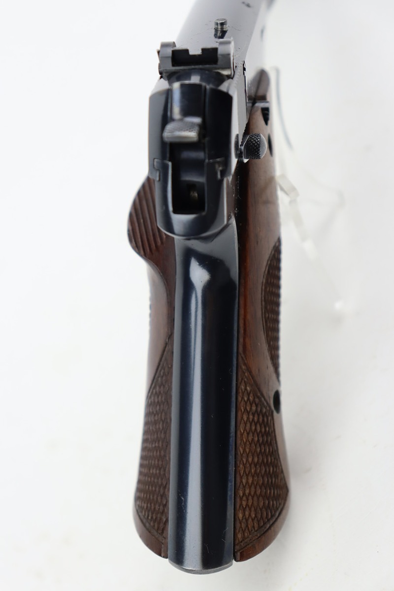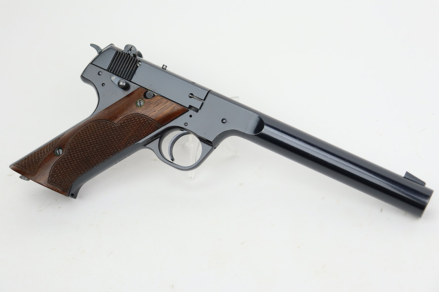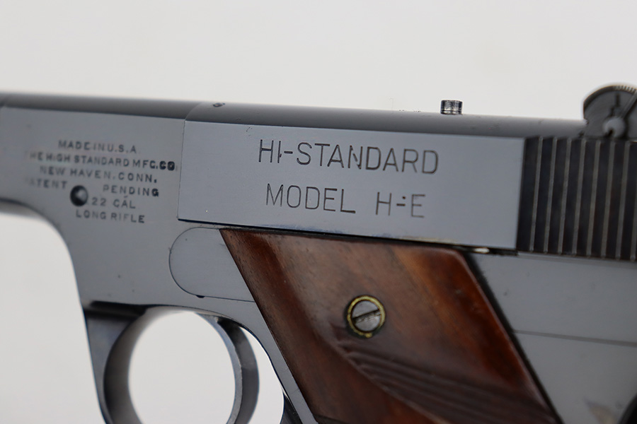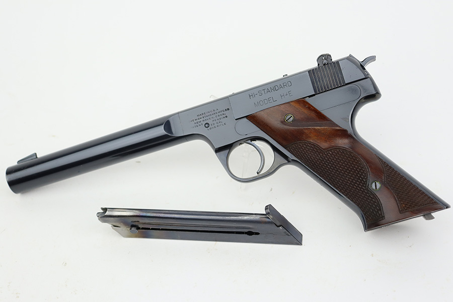 8/25/23 – This is a near-mint example of a Hi Standard Model HE, manufactured in 1941-42 and chambered in .22 LR. It has retained nearly all of its beautiful original high polish finish. There is just a hint of muzzle wear and a few tiny handling marks on the front strap. Fitted with beautiful checkered wood grips and comes with one proper magazine. Mint bore.