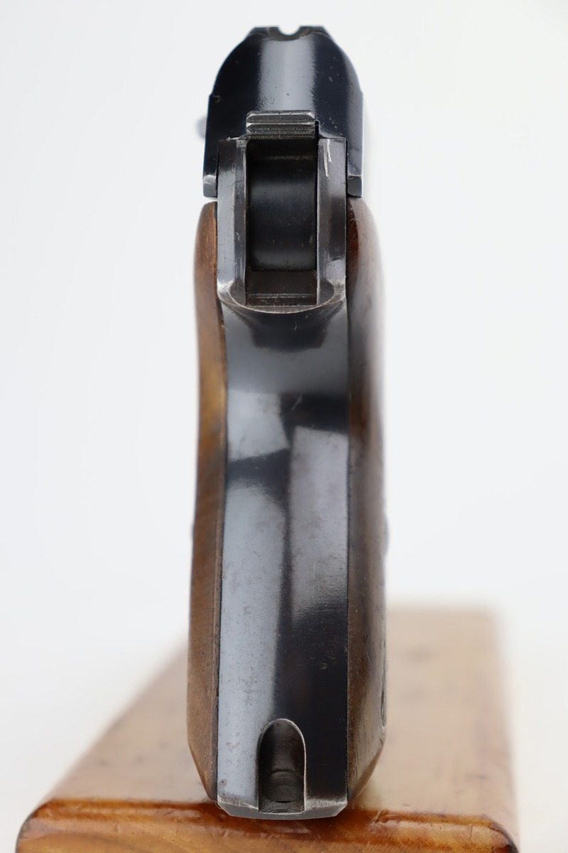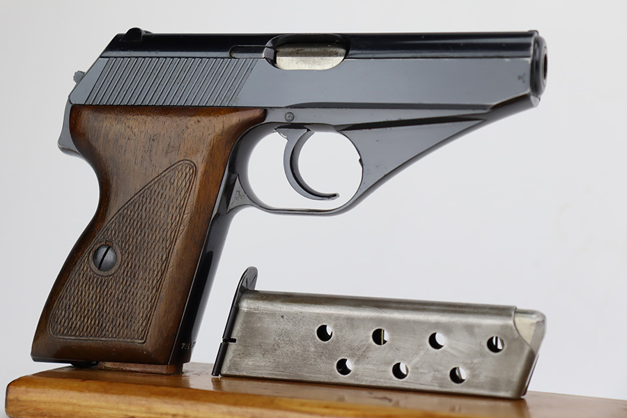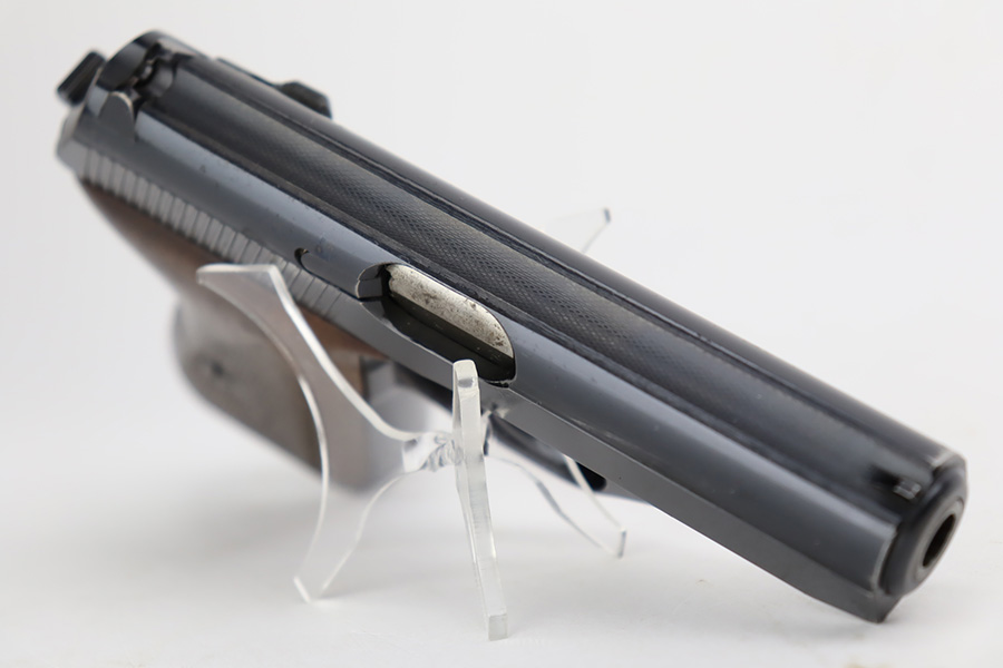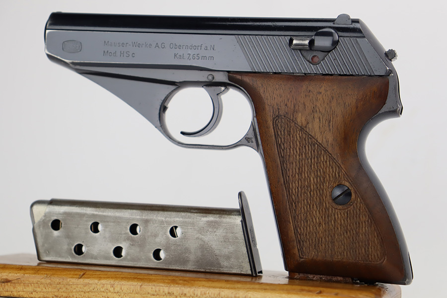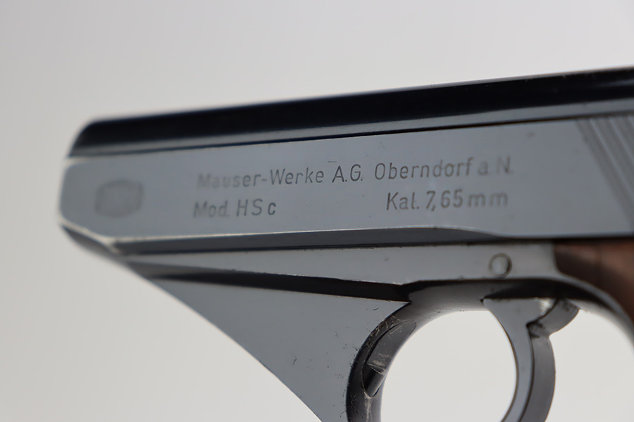 9/19/23 – This is a minty example of a Mauser HSC issued to the Nazi police force in 1942. All matching with the proper police “Eagle L” proof on the left side of the trigger guard. It has retained about 98% of its original high polish finish with just very minor muzzle wear and some very light pin-pricking on both grip straps. Fitted with excellent period-correct wood grips and comes with one proper magazine. Excellent bore.