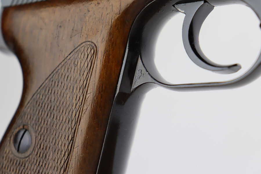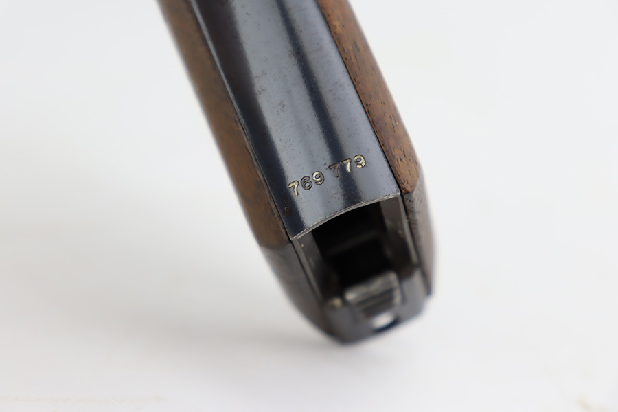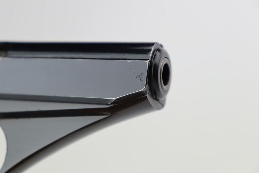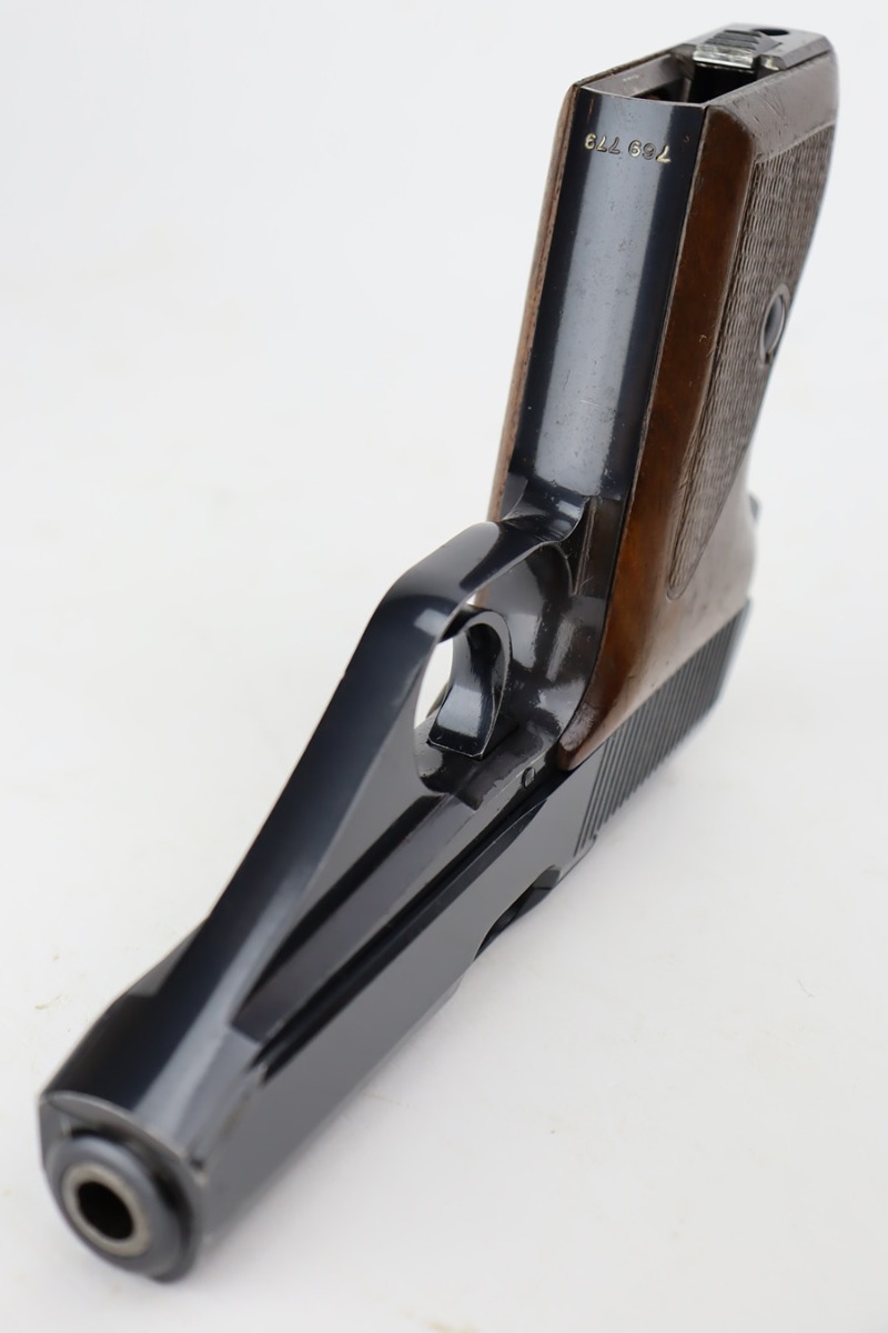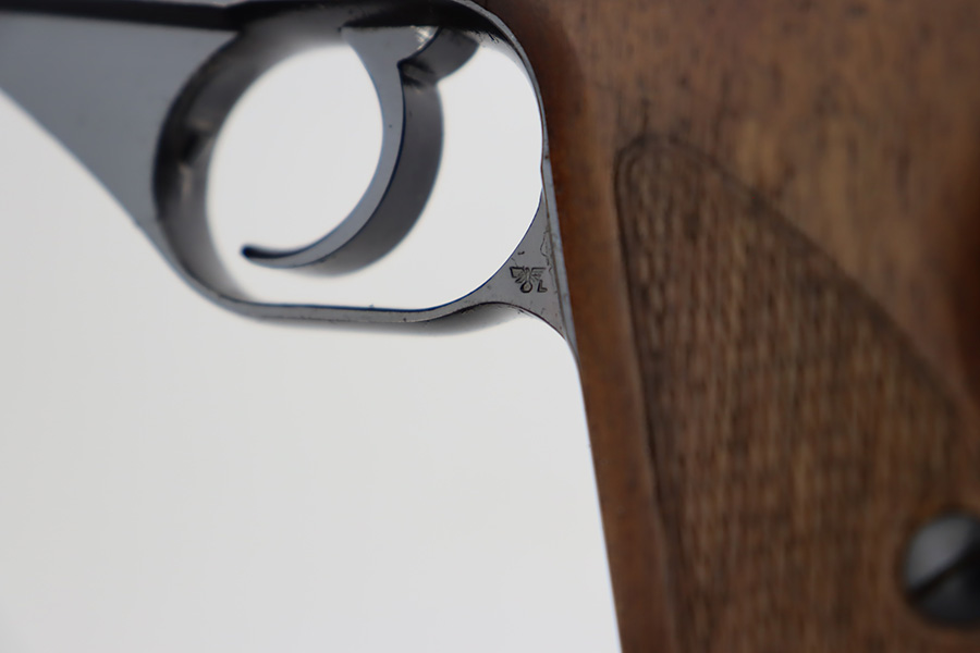 9/19/23 – This is a minty example of a Mauser HSC issued to the Nazi police force in 1942. All matching with the proper police “Eagle L” proof on the left side of the trigger guard. It has retained about 98% of its original high polish finish with just very minor muzzle wear and some very light pin-pricking on both grip straps. Fitted with excellent period-correct wood grips and comes with one proper magazine. Excellent bore.