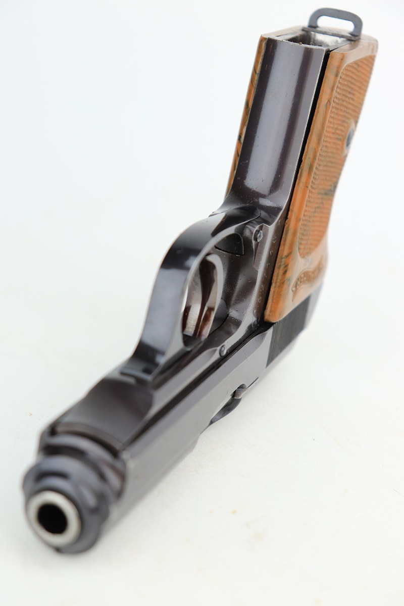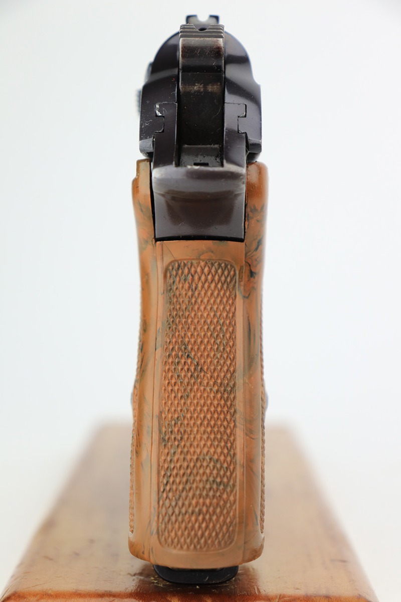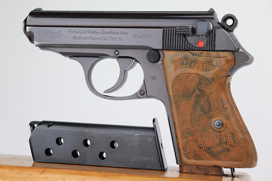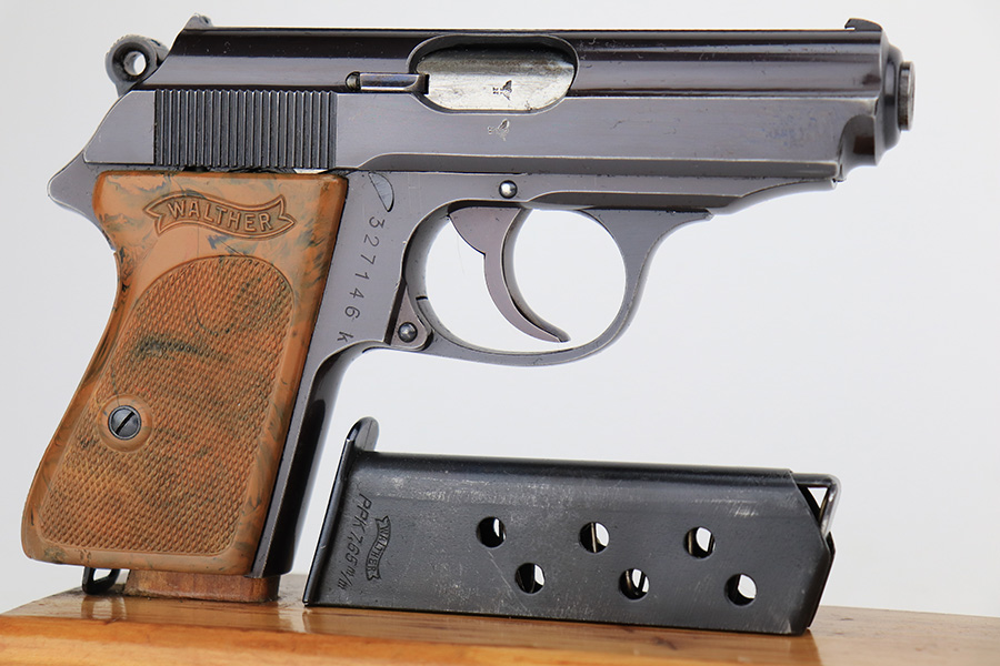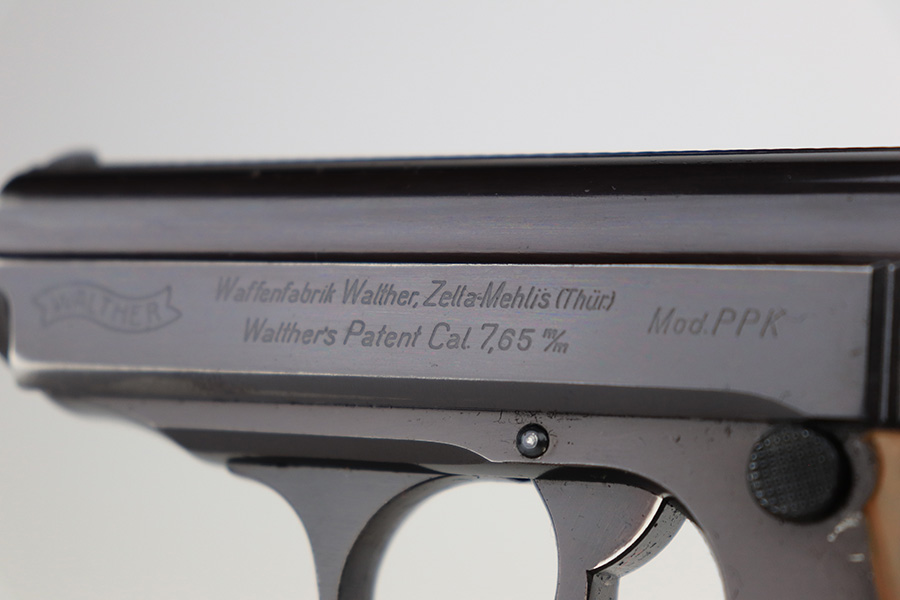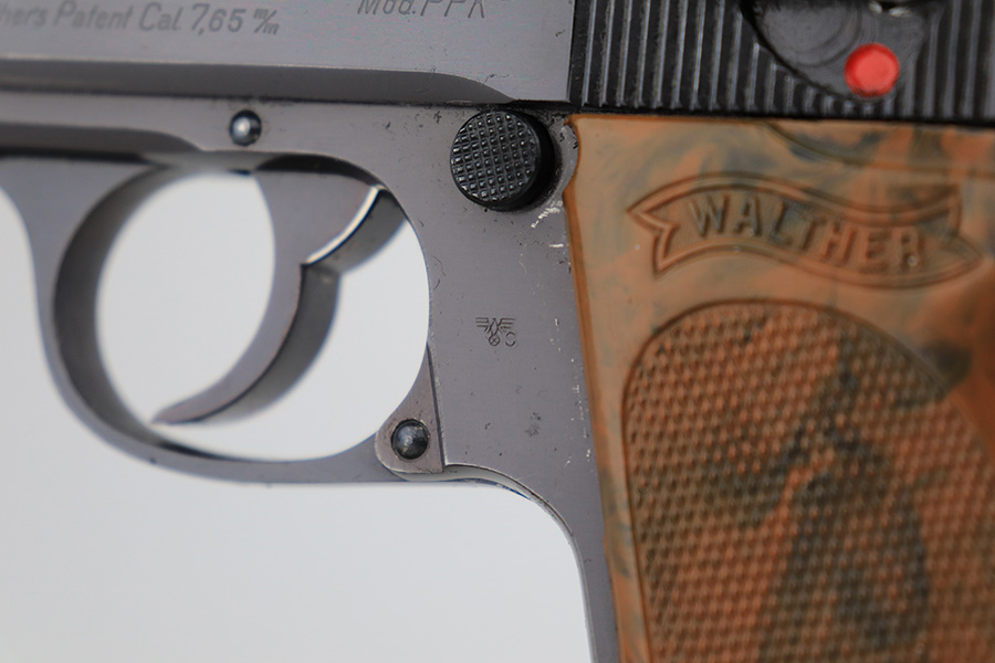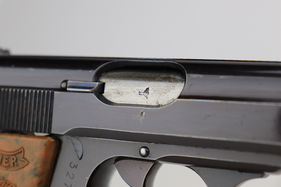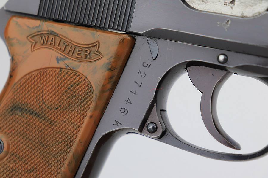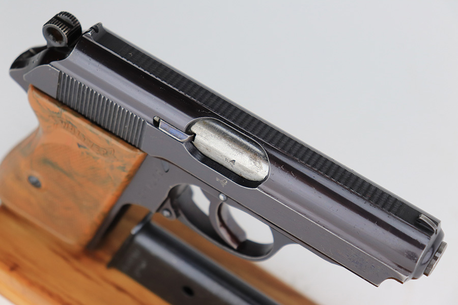 5/5/23 – This is a near-mint example of a rare high-polish Walther PPK issued to the Nazi police force in 1941. It is all matching and has an “Eagle C” police proof on the left side of the frame. It has retained nearly all of its original slightly plumb-colored high polish finish. There is just very minor wear around the muzzle, a few tiny dings on the left side of the slide, and a few very light scratches on the right side of the frame. Comes with a very nice brown bakelite grip (hairline crack on the right side) and one proper wartime magazine. The bore is stone-mint.