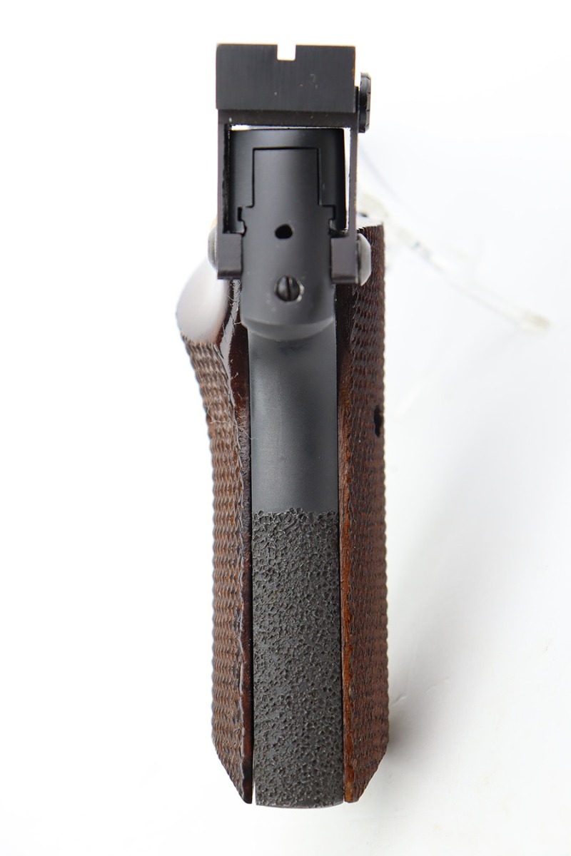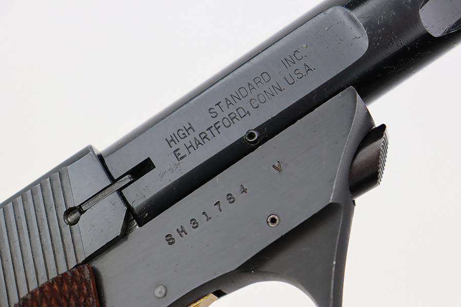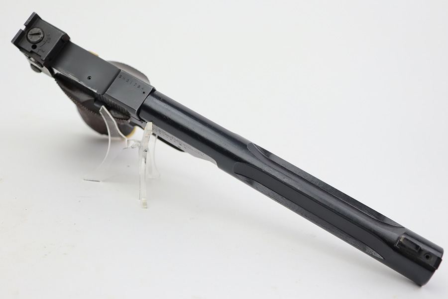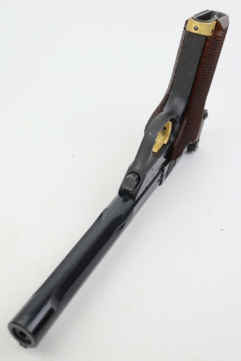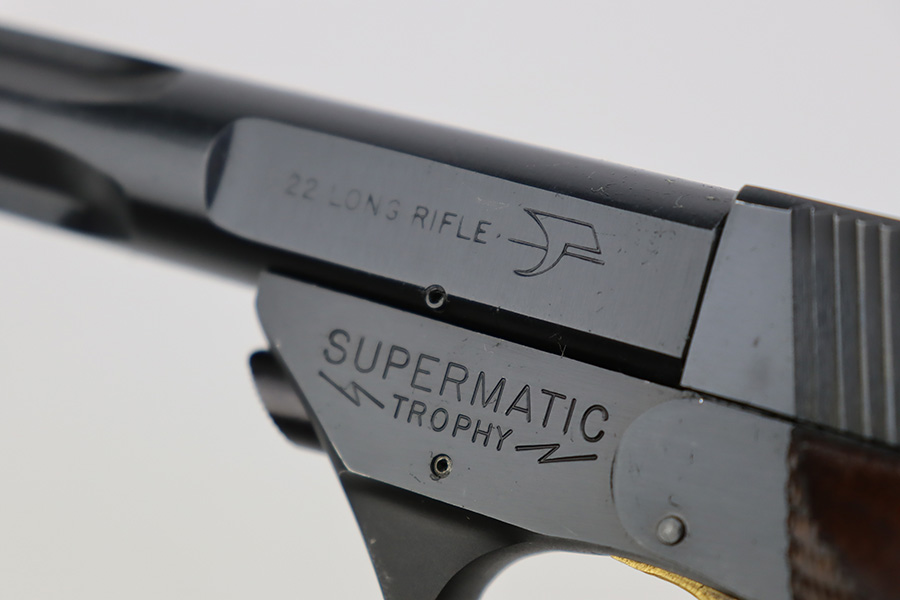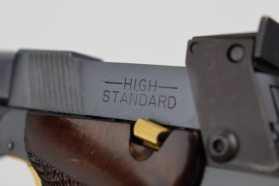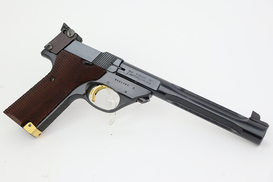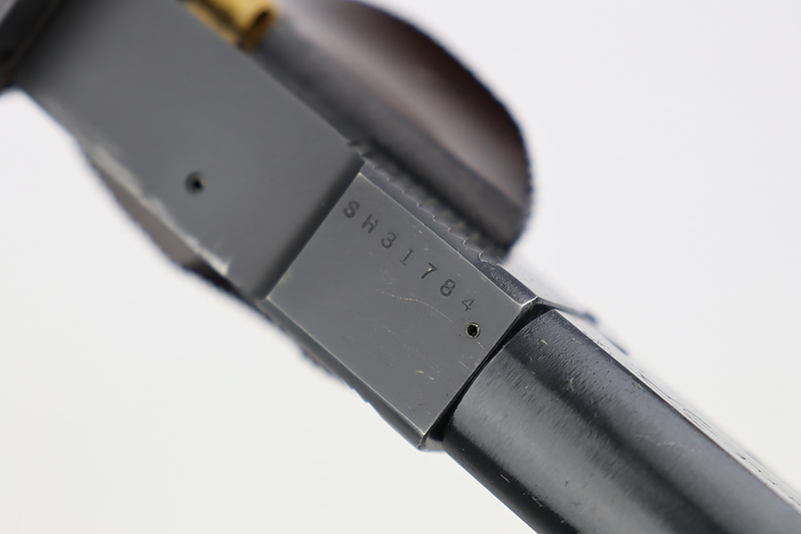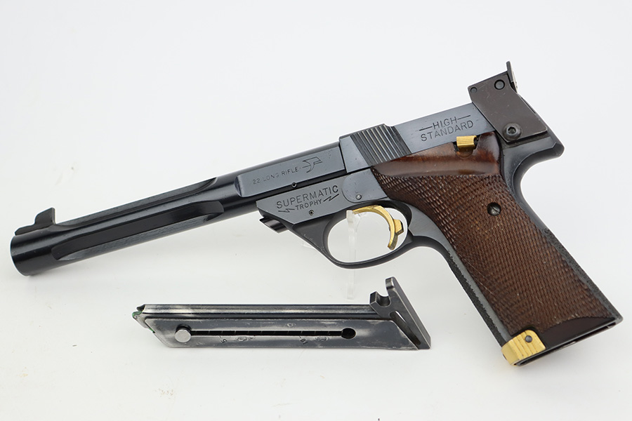 6/27/23 – This is a mint example of a High Standard Model Supermatic Trophy, manufactured between 1981-84 and chambered in .22 LR. The gun has retained essentially all of its original bluing with just a couple of tiny scuffs/handling marks here and there, most noticeable on the top of the barrel. Fitted with minty checkered Walnut grips – one small scuff on the right side. Comes with one proper magazine. Mint bore.