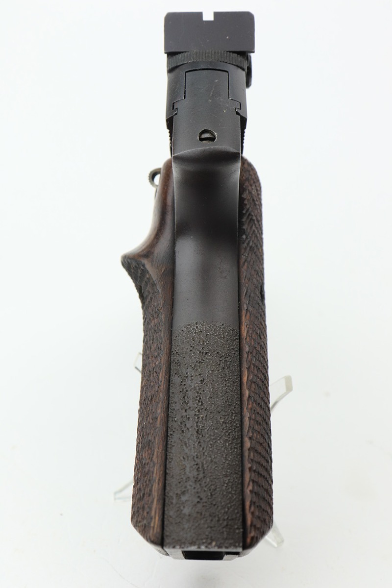 1/24/23 – This is a minty example of a High Standard “The Victor”, manufactured in 1973-74 and chambered in .22 LR. It has an installed rail on the top of the slide and has retained nearly all of its original finish. There are just hints of wear on some of the high edges and some very light freckling and pin-pricking on the right side of the frame. Fitted with excellent wood grips and comes with one proper magazine. Mint bore.