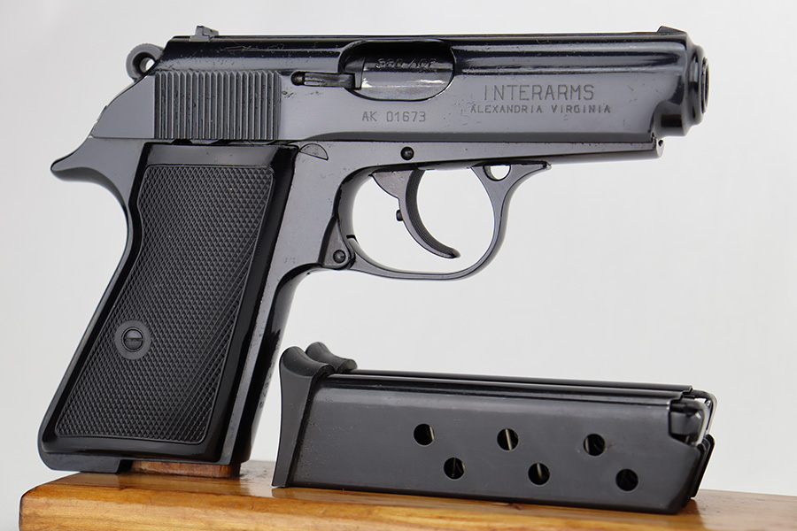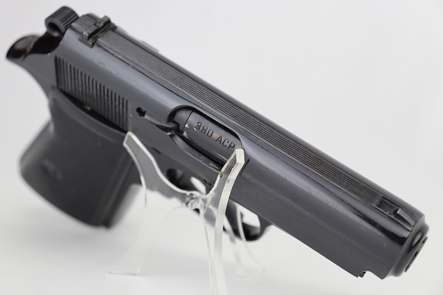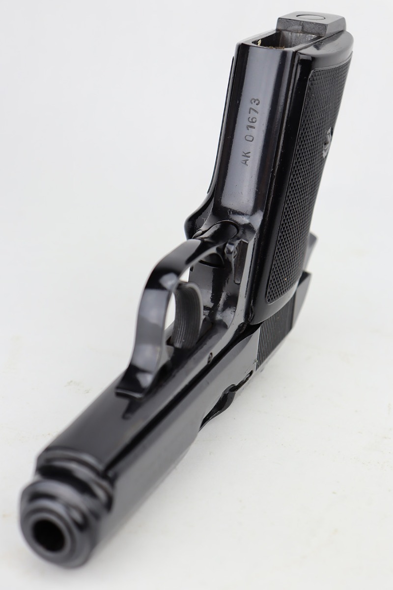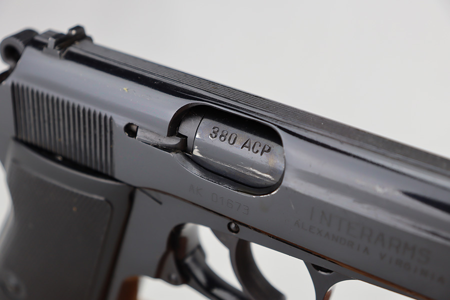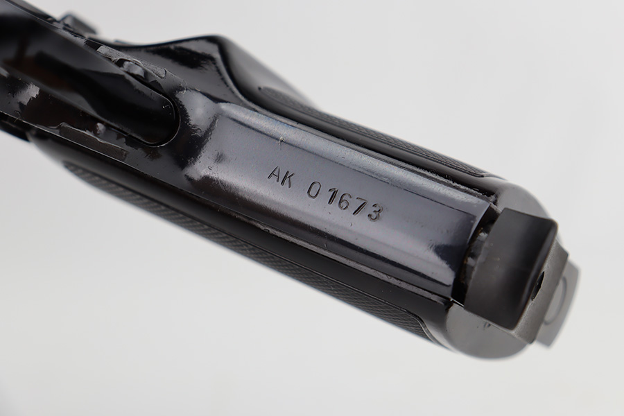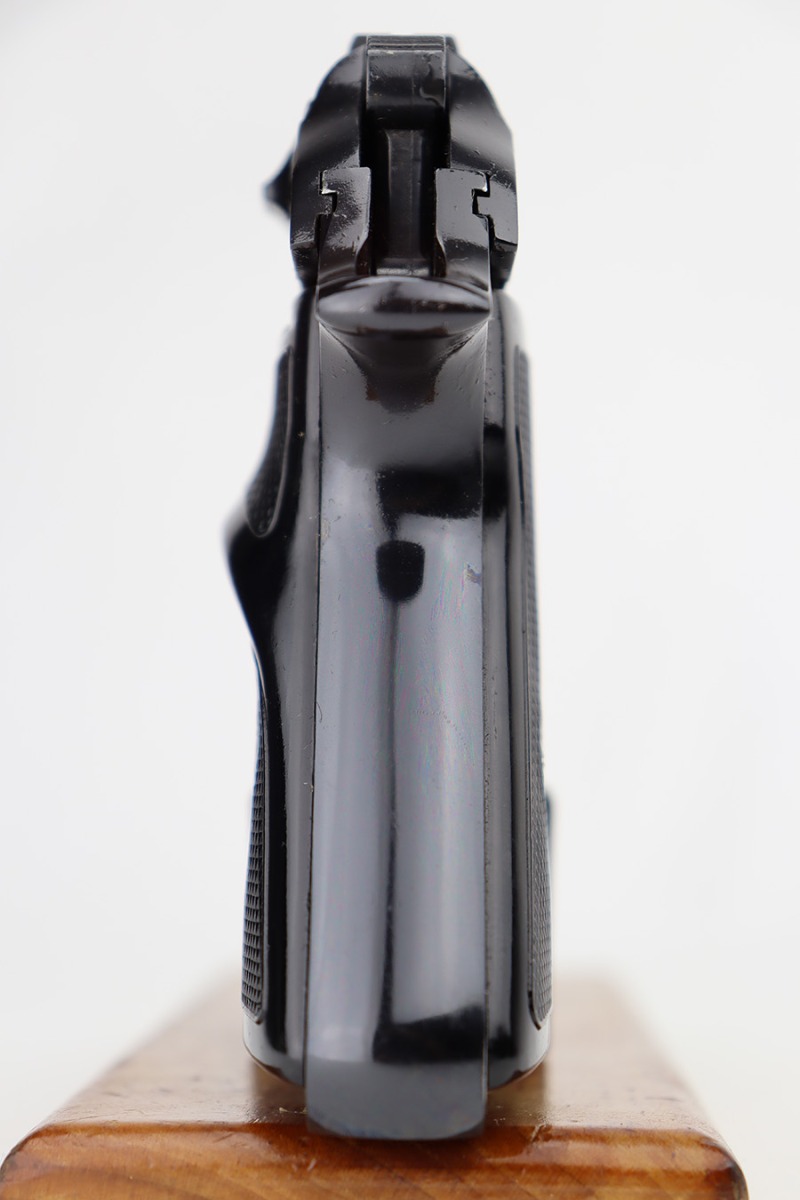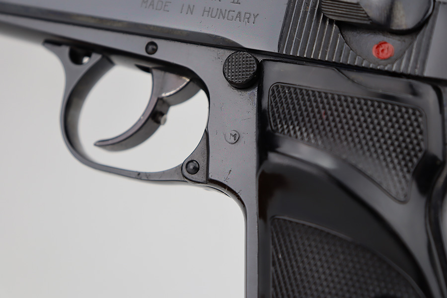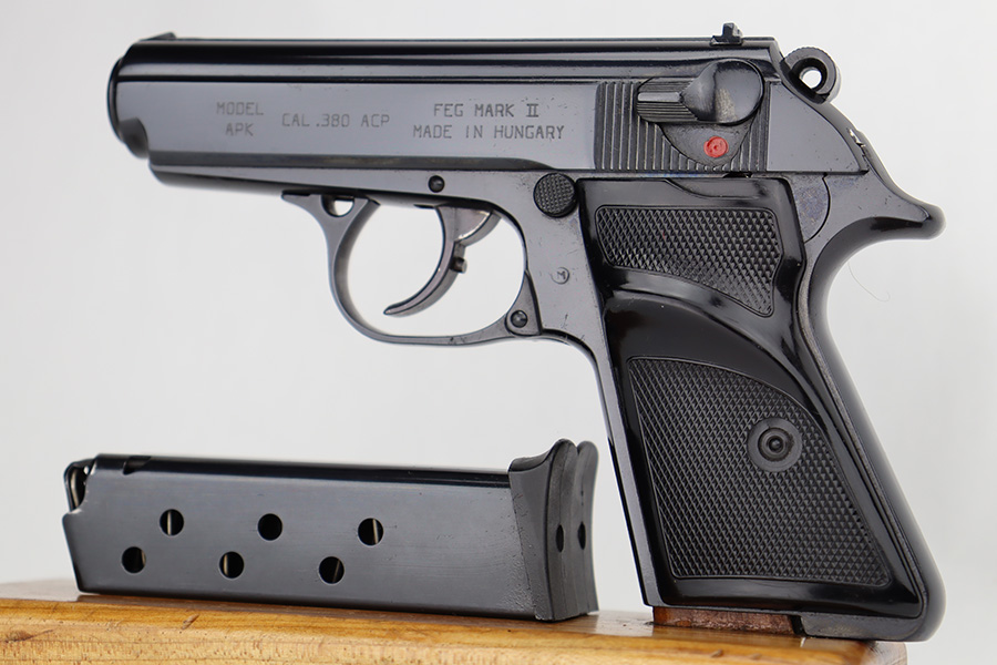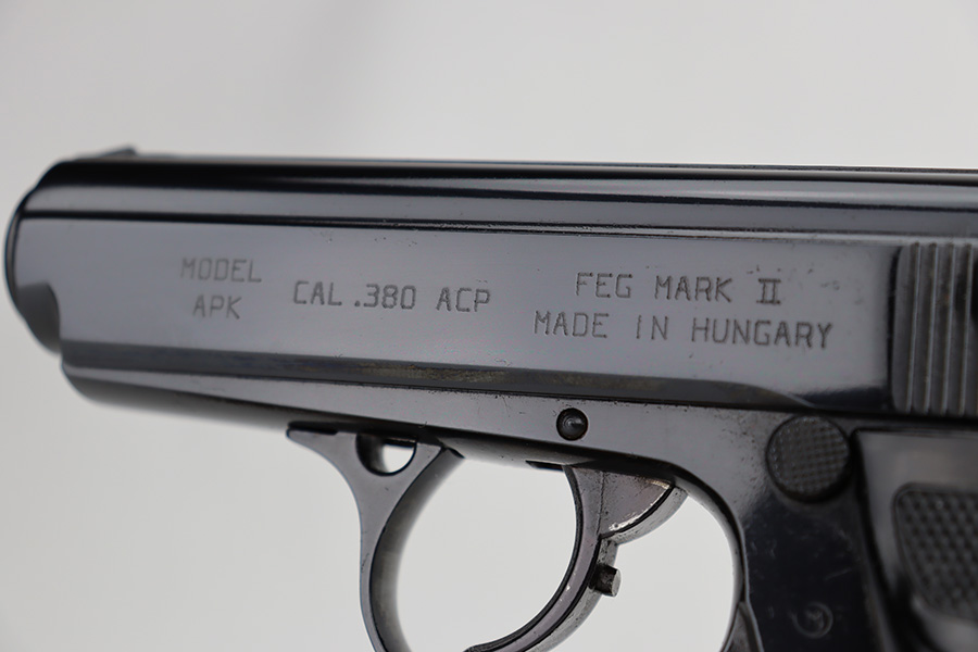 6/13/23 – This is a Hungarian copy of the Walther PPK, the FEG Model APK Mark II. Manufactured in the 1990’s and chambered in .380 ACP. The gun is all matching and shows very little sign of wear except for a few tiny handling marks here and there. Fitted with excellent black plastic grips and comes with two finger extension magazines. Near-mint bore. Interarms marking on the right side of the slide.