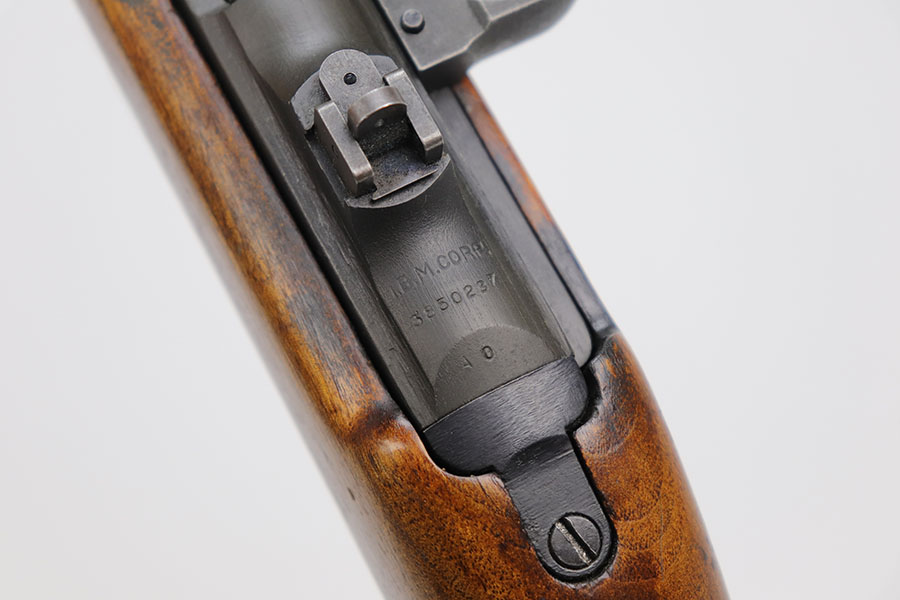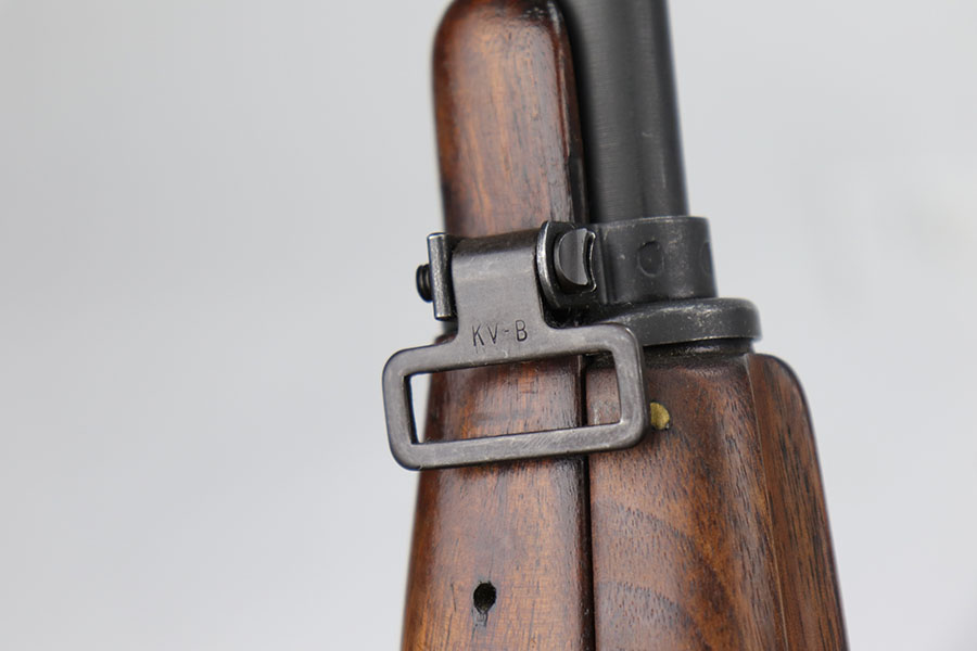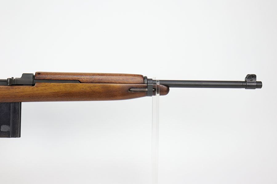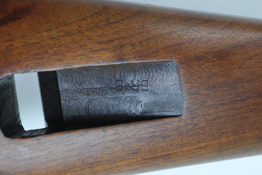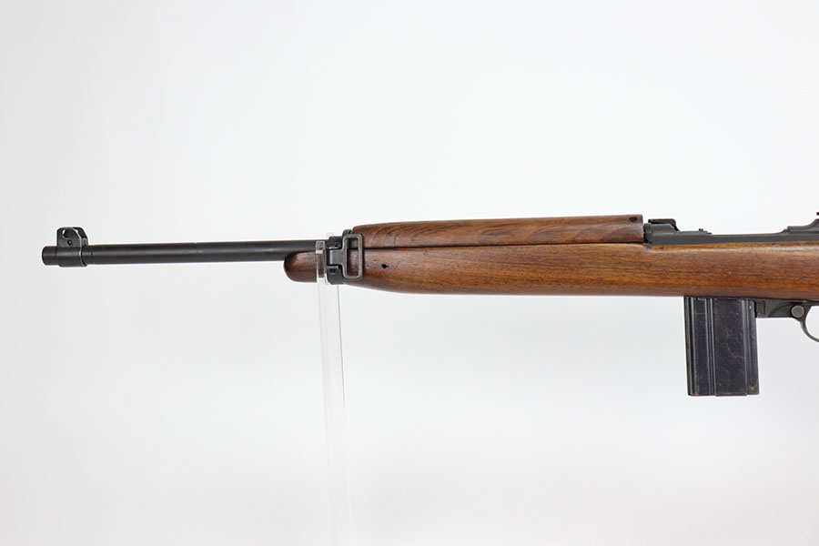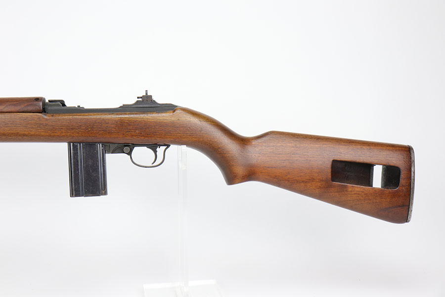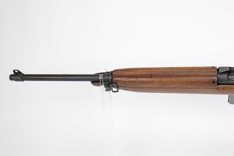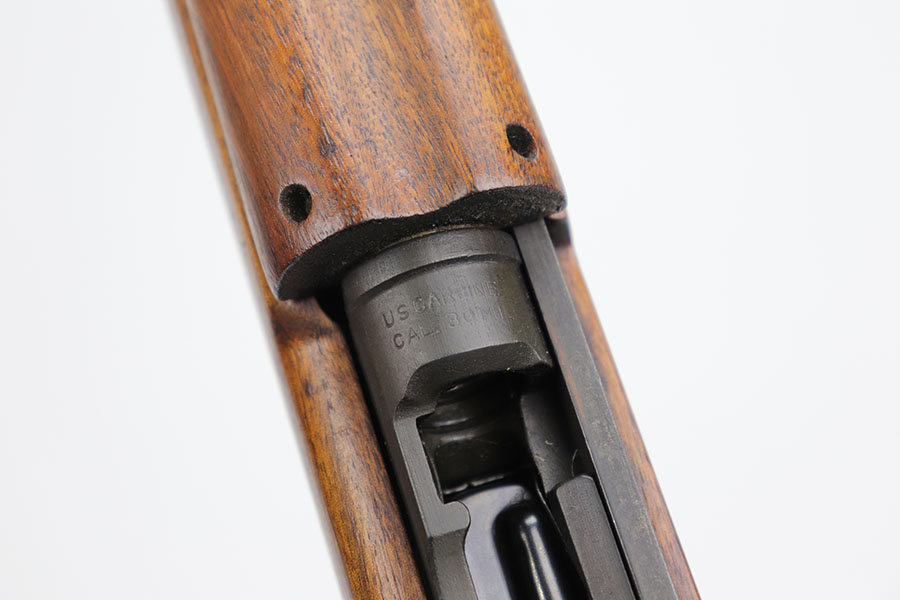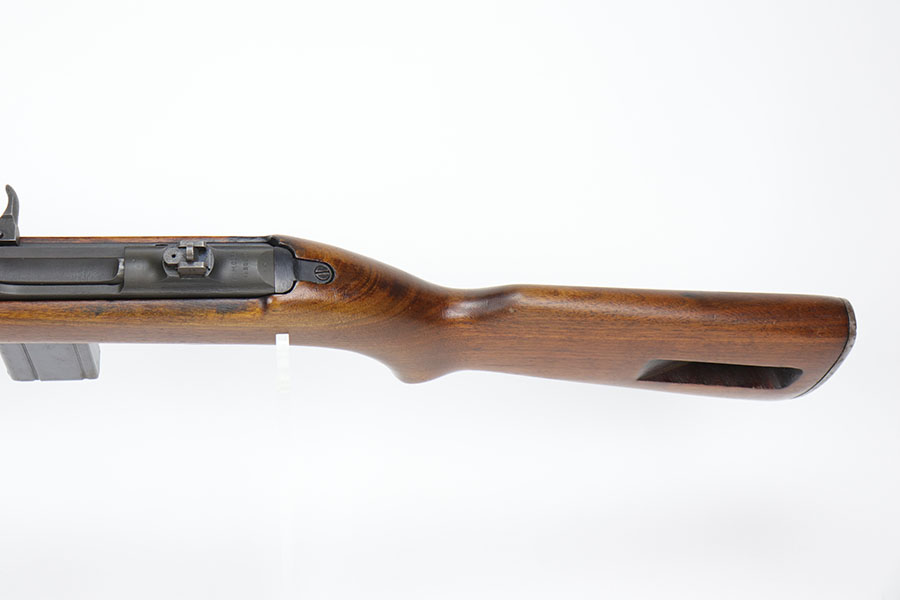 10/14/20 – This is a near-mint and hard to find IBM M1 Carbine from either late 1943 or early 1944. Less than 6% of total M1 Carbine production was done by IBM. A full parts guide is included with the photos for this listing, but correct and IBM parts throughout. IBM barrel and receiver with BR-B marked stock that has crossed cannon cartouche on the right side. Bore is shiny with strong rifling but there is a ring of pitting at one point, though the barrel is not bulged. Stock condition is excellent and without defect.