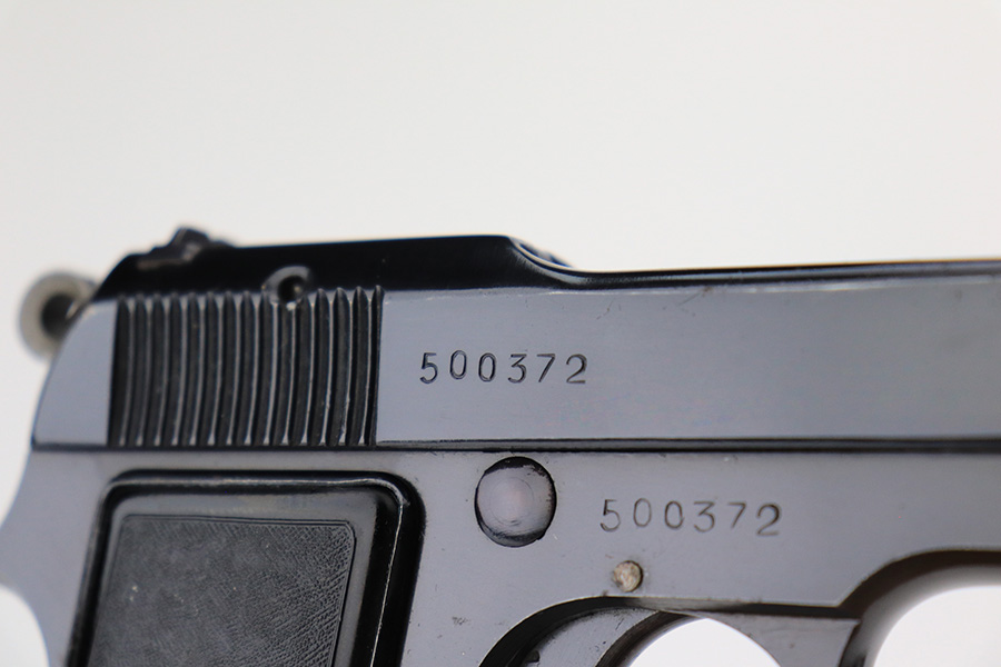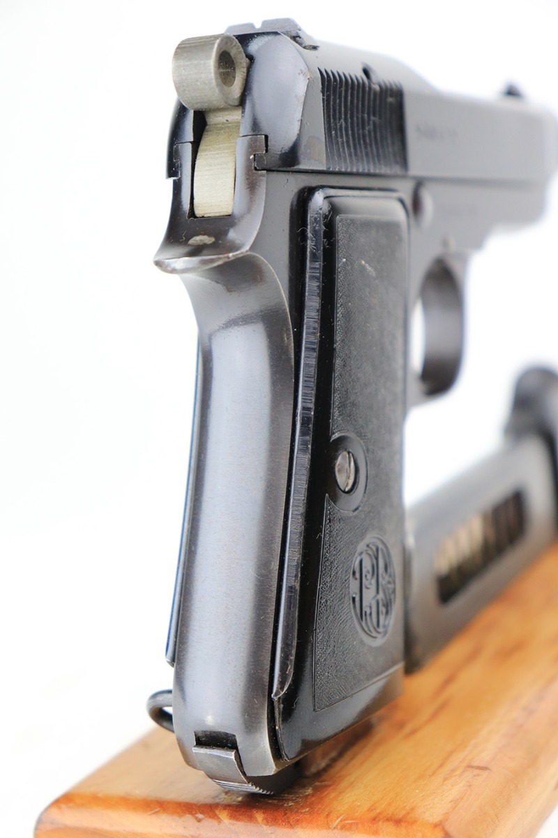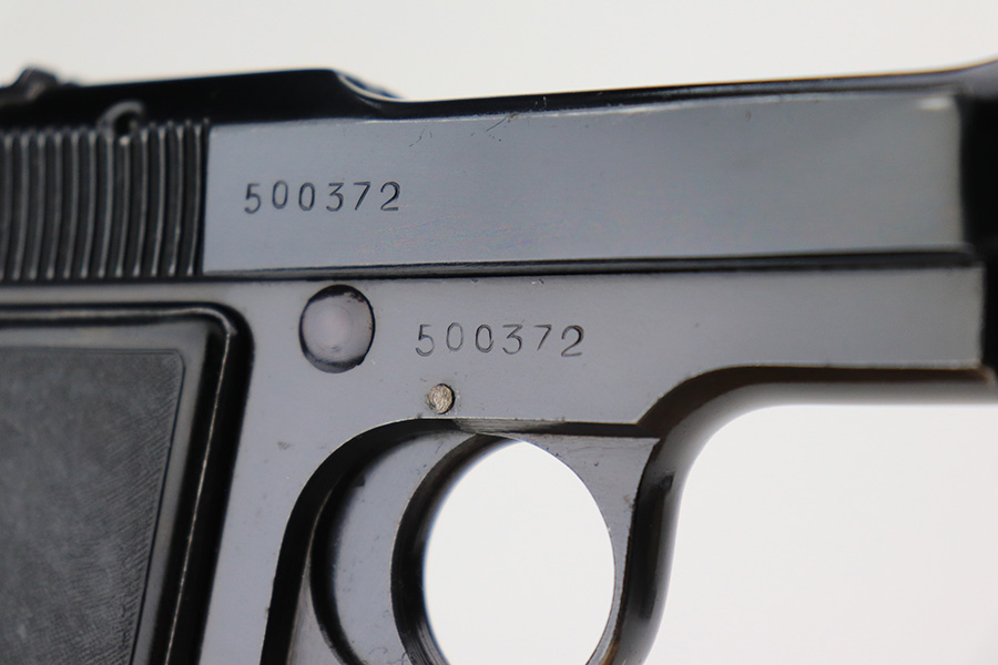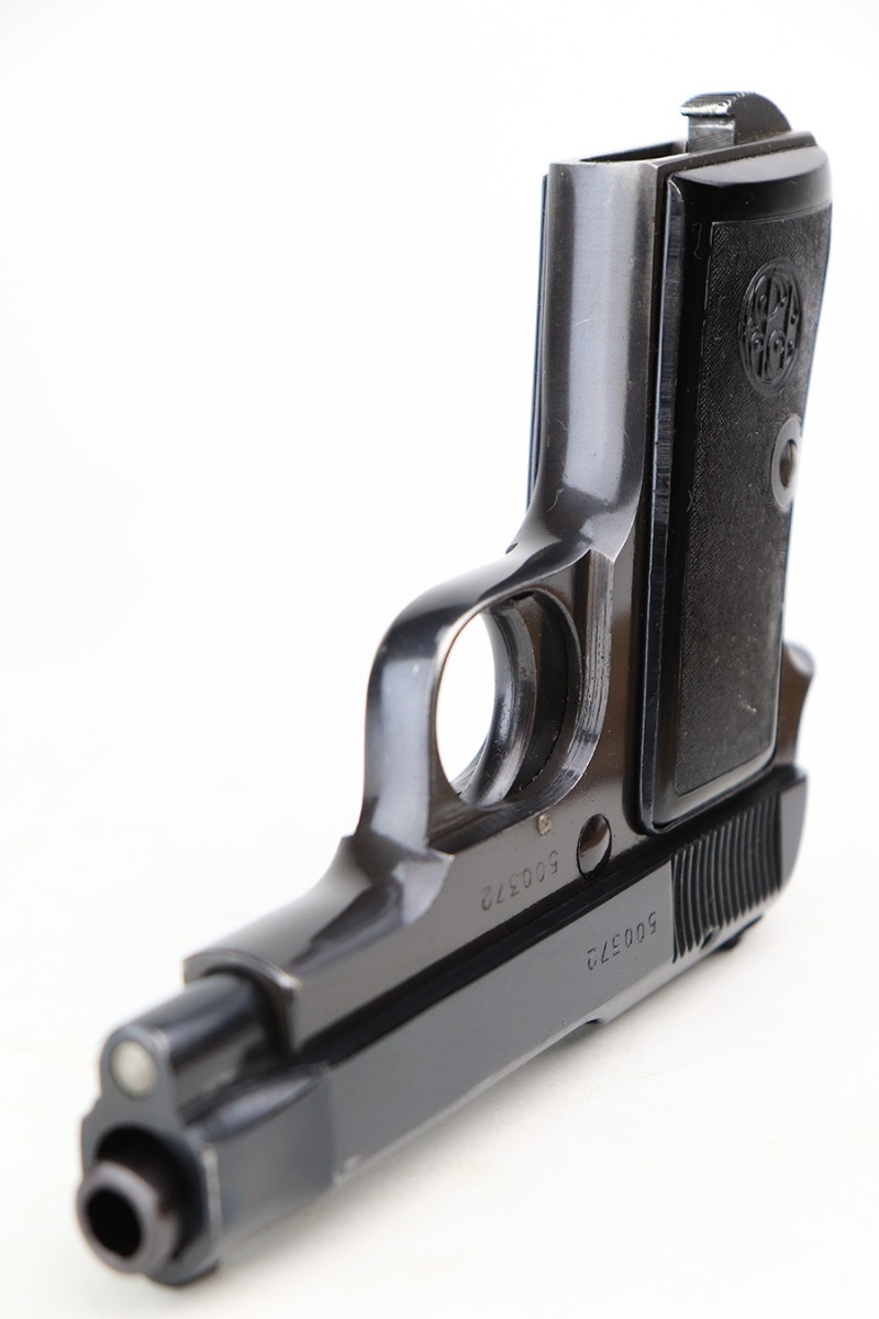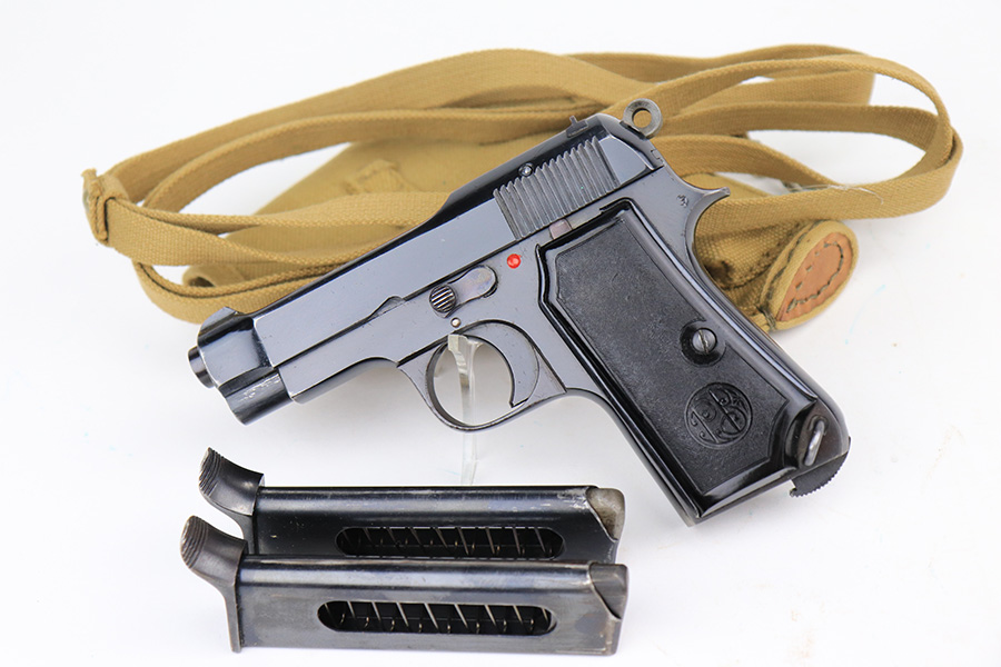 5/8/23 – This is a near-mint example of an Italian Beretta Model 1935 manufactured in 1943. The gun is all matching and has a “GF” Italian proof mark on the left side of the tang. The gun comes as a rig with a mint post-war canvas holster, post-war lanyard, and two proper magazines. The gun has retained nearly all of its original high polish finish with very minor muzzle wear and a light streak of wear on the right side of the slide. A few tiny scratches on the front strap. Comes with excellent period-correct black bakelite grips. Mint bore.
