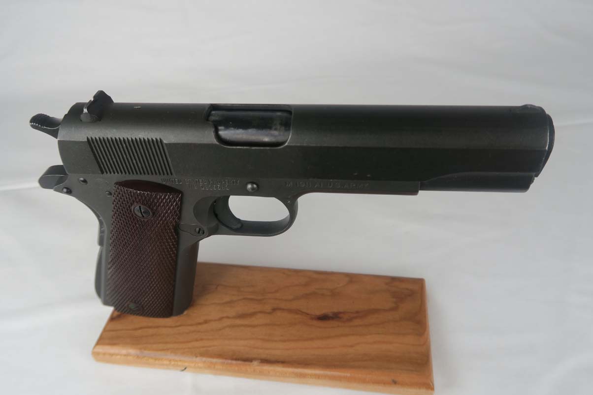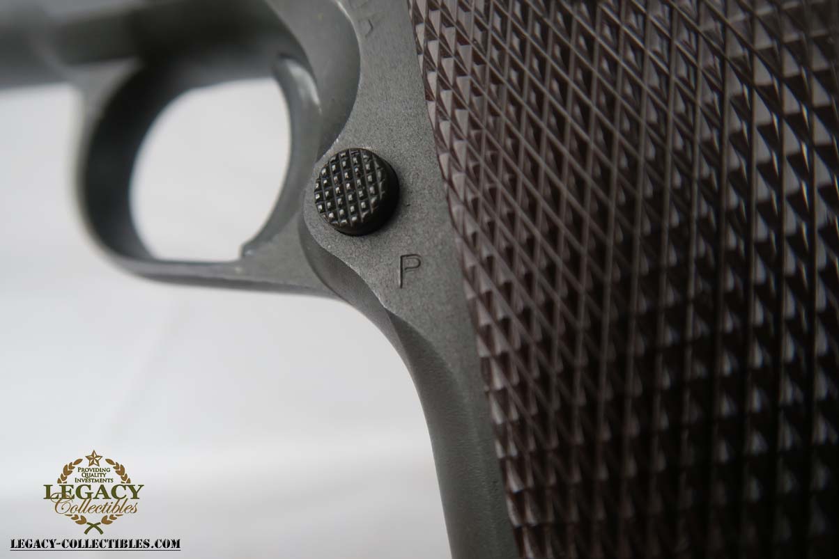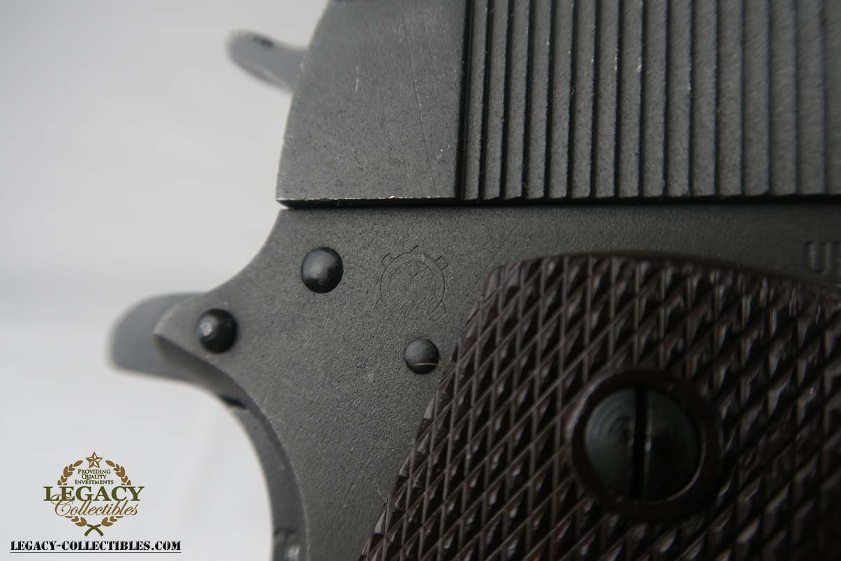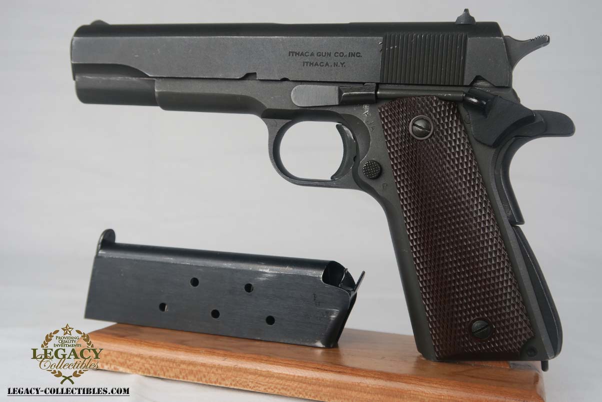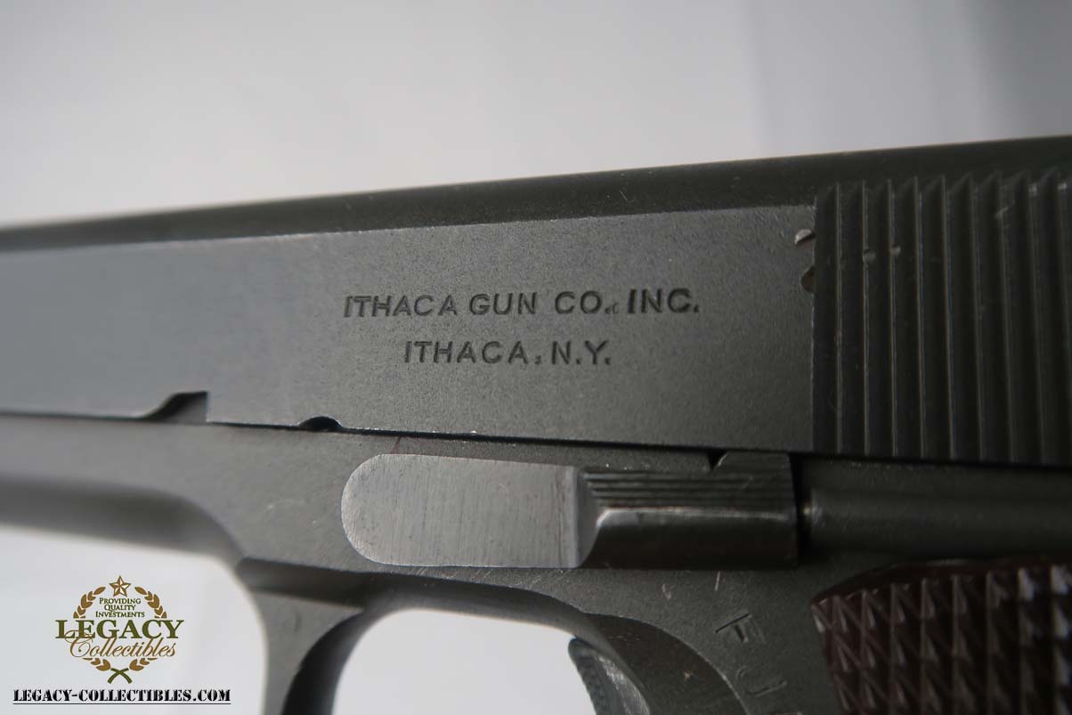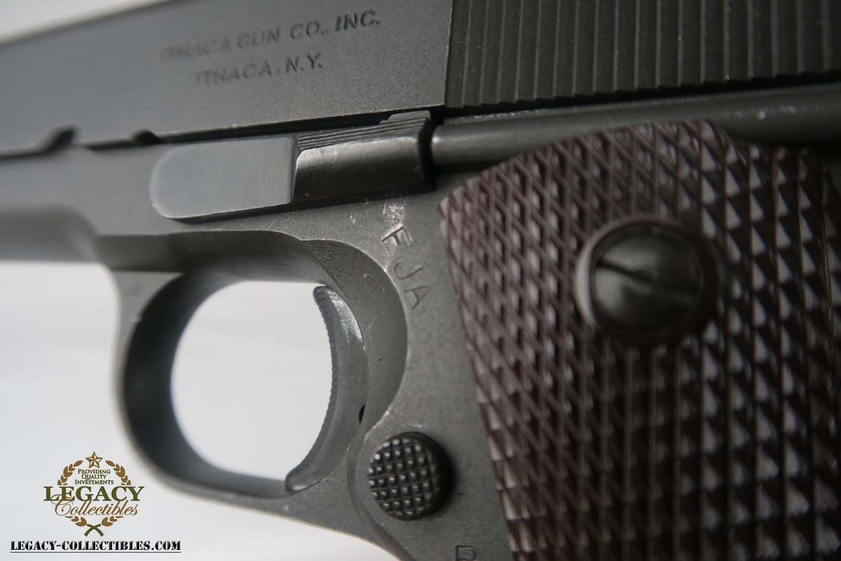 4/28/17 – This is an all-original and correct 1911 manufactured by Ithaca Gun Co. in 1944, for use by the American army during WW2. The finish rates at about 98-99%, with only slight high-edge wear on a few of the edges. It is properly marked with a P proof on the slide and frame, as well as FJA inspector’s stamp on the frame. Crossed cannons cartouche can be found on the right side of frame. Correct ‘HS’ marked barrel, Risdon magazine, and flawless grips. Bore is excellent, I’d rate it a 9/10.